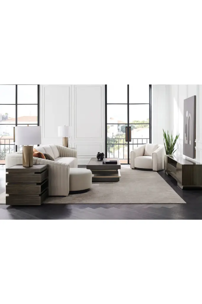 Balancing beauty and functionality, this tiered cocktail table builds on basic principles of design and architecture. Stacked slabs in a mix of materials and finishes lend structure and integrity, with alluring details like a frosted bronze glass top and metal trim in Smoked Stainless Steel paint. Features hidden casters for ease of movement.