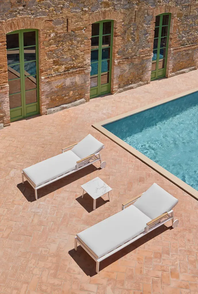 TIMELESS is the outdoor furniture collection inspired by the rational architectural language from the early 20th century, designed by José A. Gandía-Blasco Canales and Borja García. Its design of discreet but characterful forms communicates honesty, without any unnecessary ornament other than its structure. Its various elements are carefully balanced in order to provide maximum comfort.Made of thermo-lacquered welded aluminium profiles.Teak wood.Phenolic plate or porcelain.Polyurethane foam rubber covered with water-repellent fabric. Removable fabric cover.