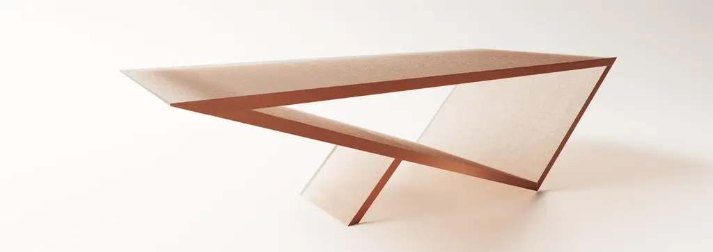 Time/Space Portal Table in Kiln cast glass..The inspiration for the Time/Space Portal Table collection comes from the power, simplicity, and elegance of the triangle.This is an ongoing series exploring the dynamics of balance, weight, gravity, mass, and how this dynamic is expressed utilizing various materials.A powerful Minimalist gem with a dynamic presence. This peach colored kiln cast glass coffee table has an etched finish with polished edges.This table can be fabricated in any available glass color. Prices may vary for each color of glass.Dimensions66” long x 25” wide x 18” high. –size modifications availableNew and made to order. Lead time is 12-16 weeks. Signed and dated on underside.
