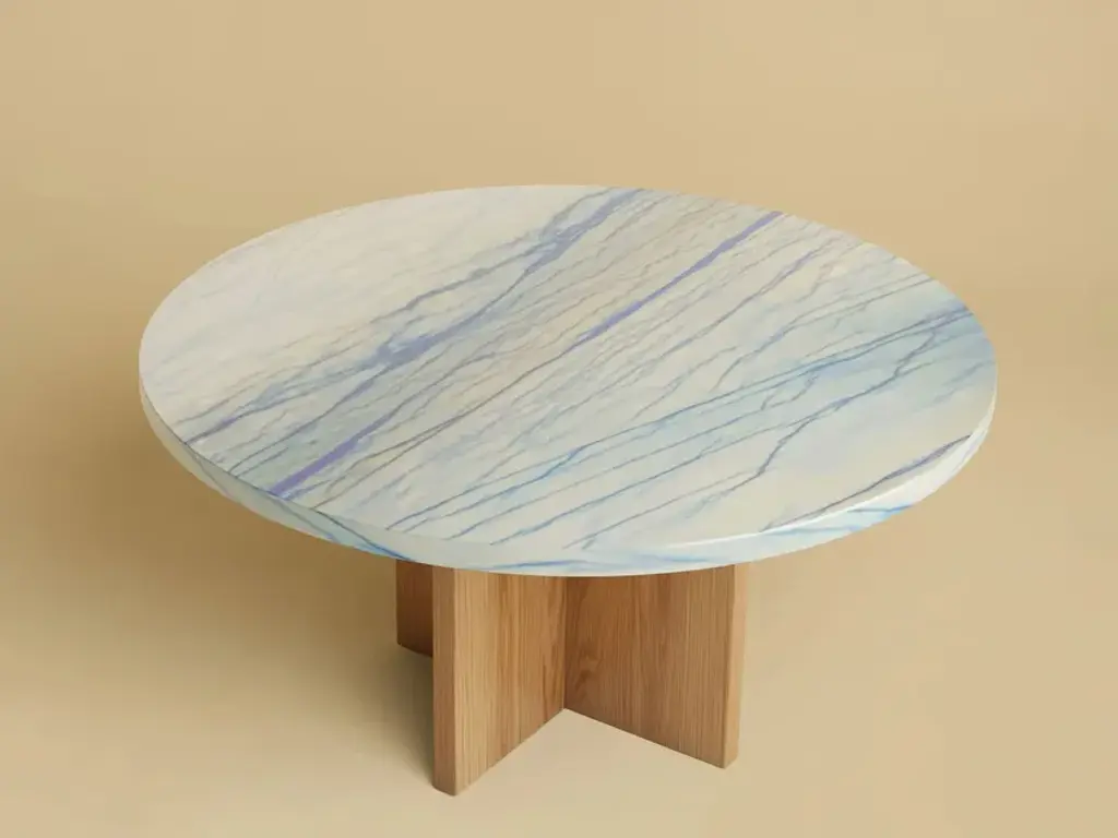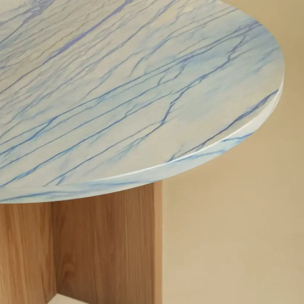 Tinian is a low coffee table made of a solid oak wood base and a marble Azul Macaubas top.The Tinian coffee table is produced with an oak wood base and a unique marble or travertine top. The top is circular and 60cm in diameter, while the base is obtained by gluing oak slabs perpendicular to each other. An artisan production made of technological innovation and know-how of other times where stone and wood are carefully finished by hand to preserve and highlight the nature and preciousness of their history. Made in Italy.