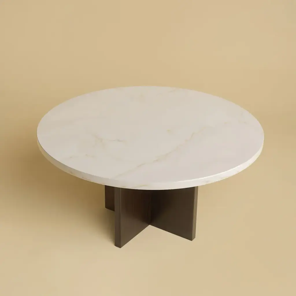 Tinian is a low coffee table made of a solid smoked oak wood base and a marble Calacatta Gold top.The Tinian coffee table is produced with an oak wood base and a unique marble or travertine top. The top is circular and 60cm in diameter, while the base is obtained by gluing oak slabs perpendicular to each other. An artisan production made of technological innovation and know-how of other times where stone and wood are carefully finished by hand to preserve and highlight the nature and preciousness of their history. Made in Italy.