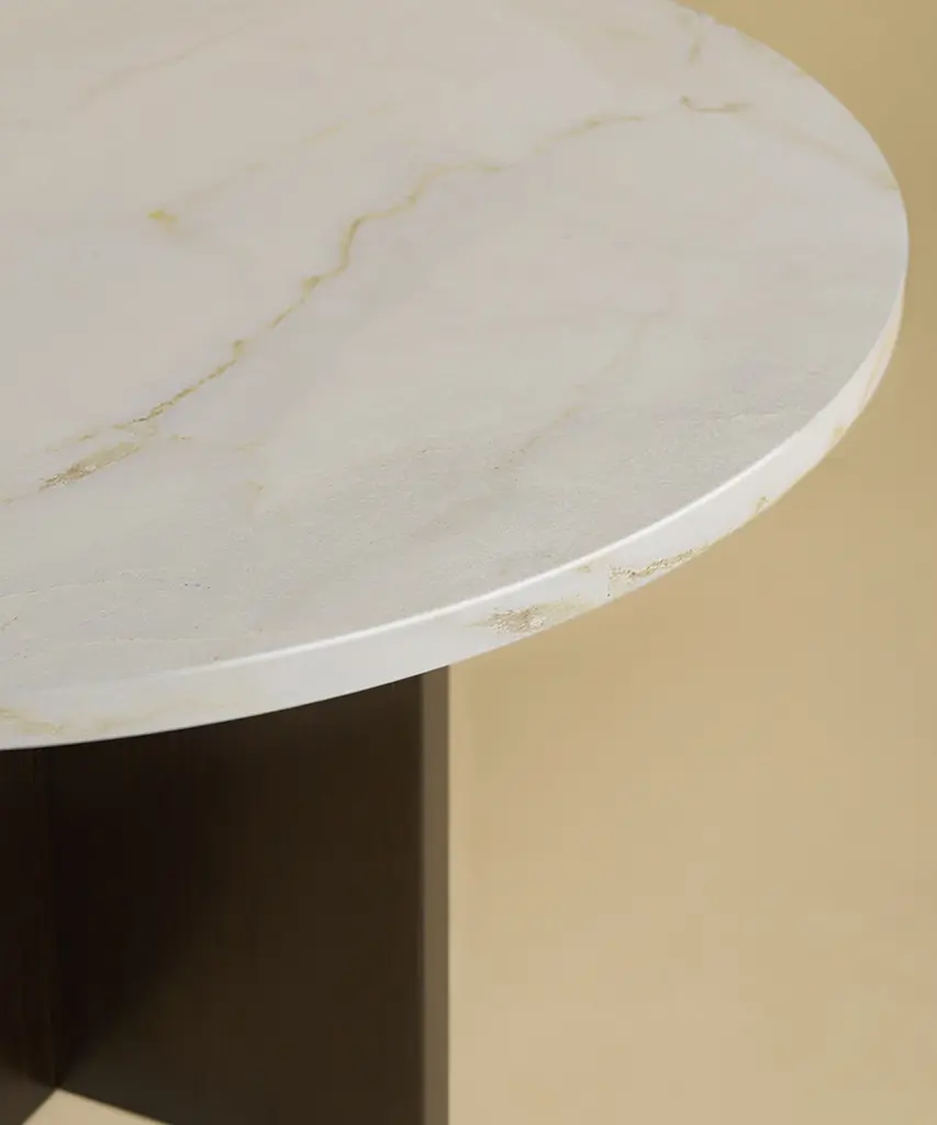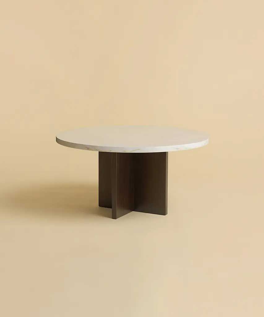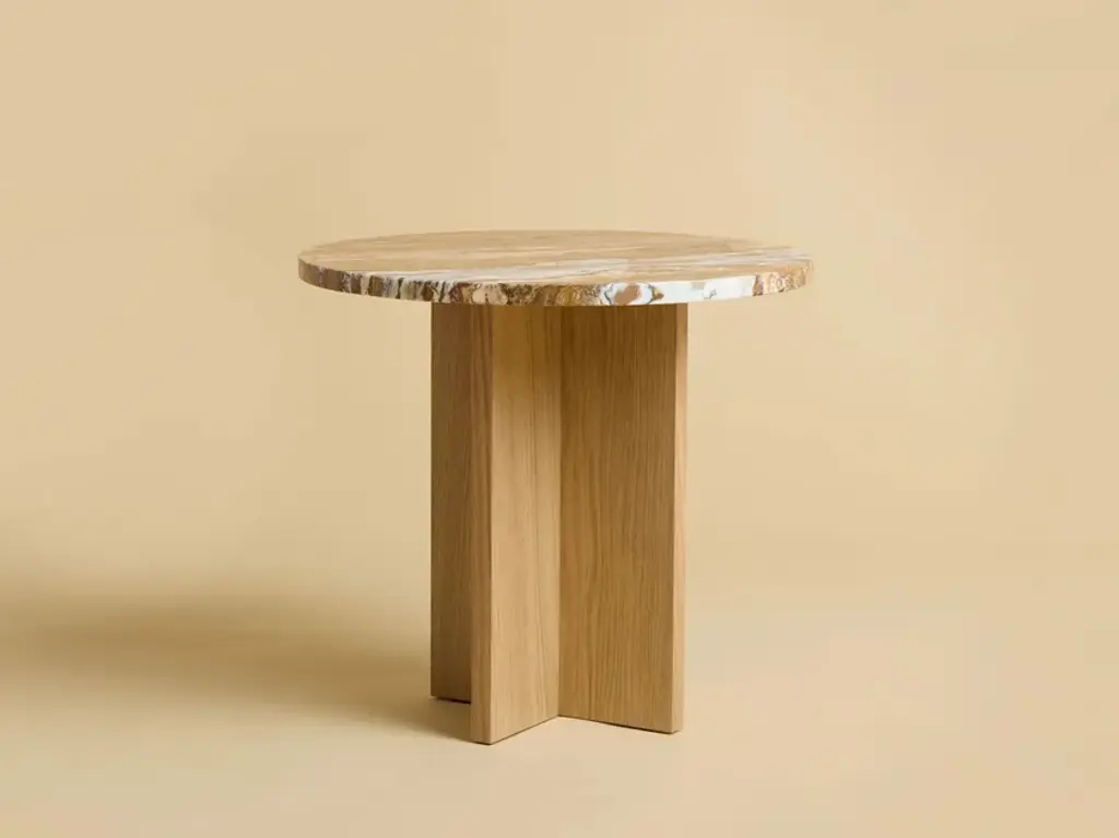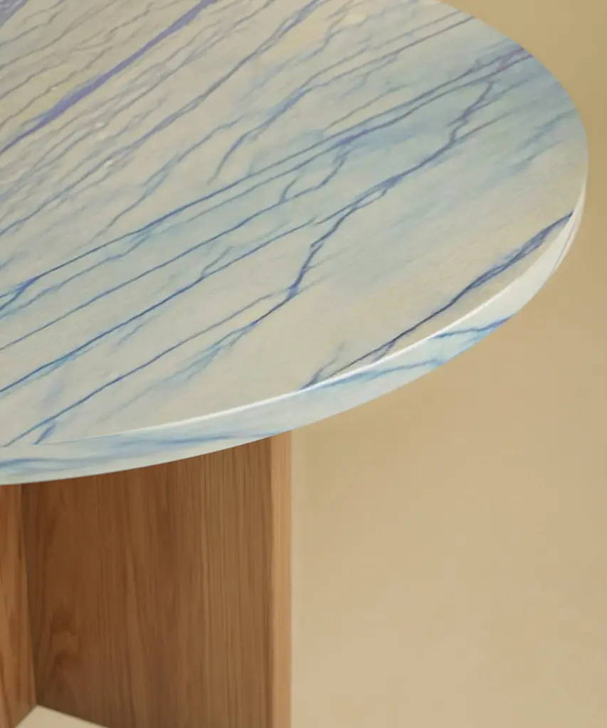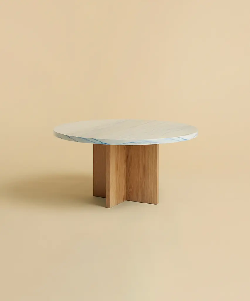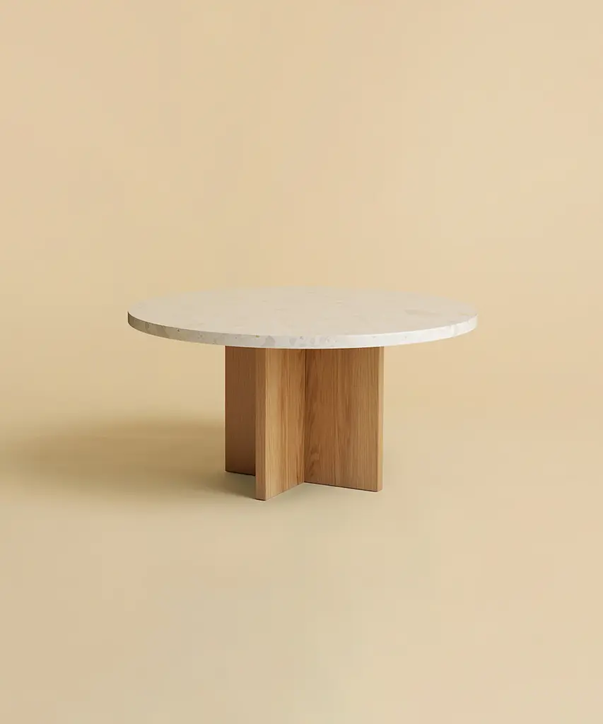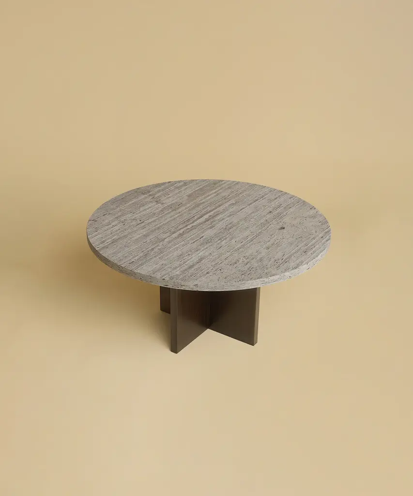 The Tinian coffee table is produced with an oak wood base and a marble or travertine top. The top is circular and 23.6 inches in diameter, while the base is obtained by gluing oak slabs perpendicular to each other. Founded by Emanuela Terraneo and Alessandro Pozzi, Lebanto designs and produces modern and refined furniture in Cantù, Italy.
