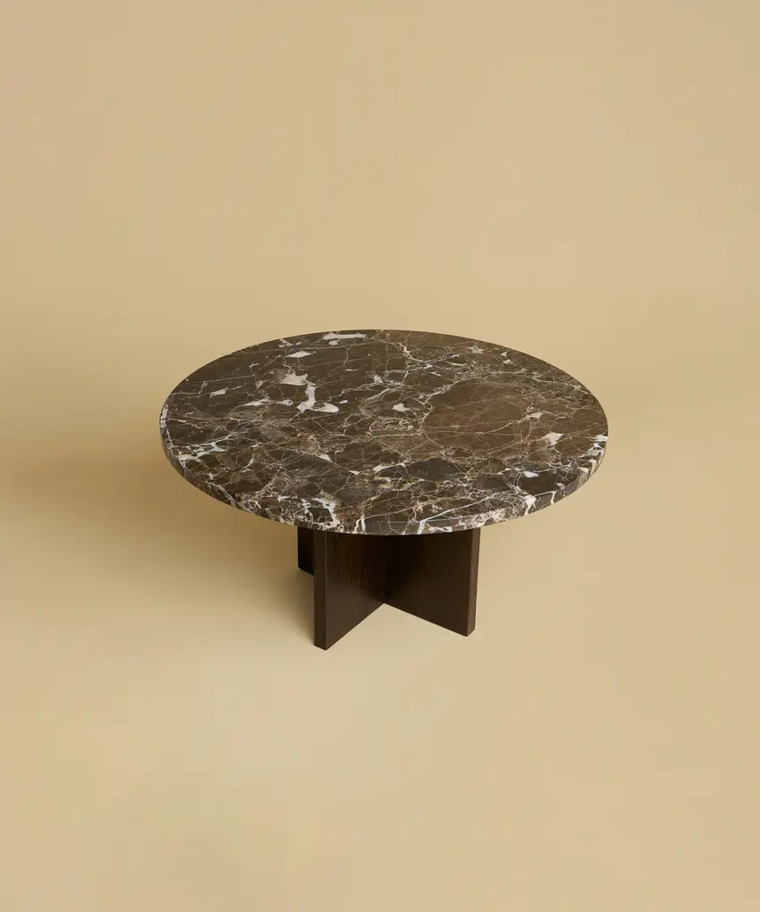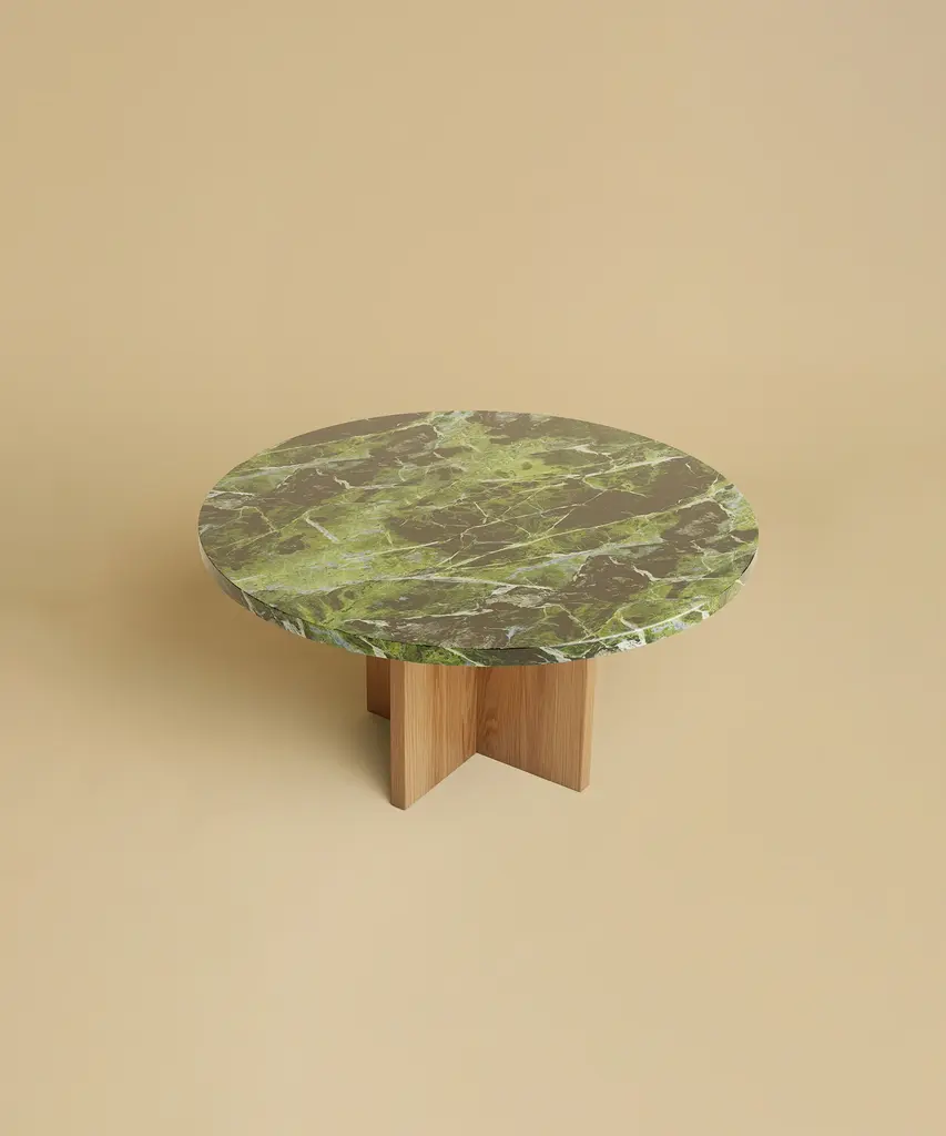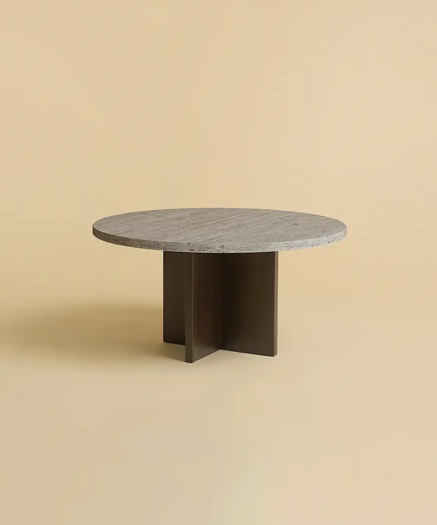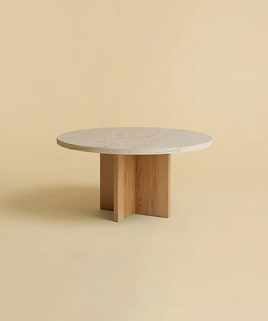 The Tinian coffee table is produced with an oak wood base and a marble or travertine top. The top is circular and 23.6 inches in diameter, while the base is obtained by gluing oak slabs perpendicular to each other. Founded by Emanuela Terraneo and Alessandro Pozzi, Lebanto designs and produces modern and refined furniture in Cantù, Italy.
