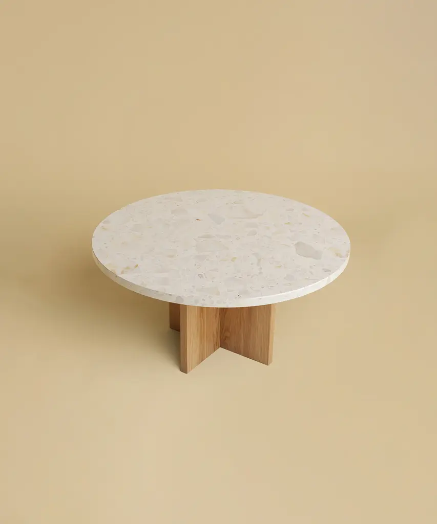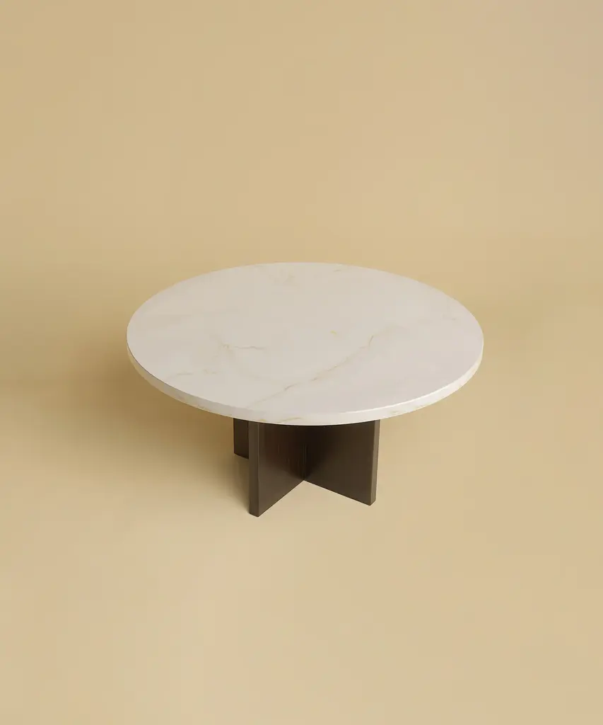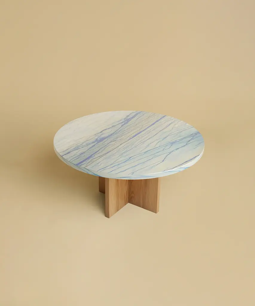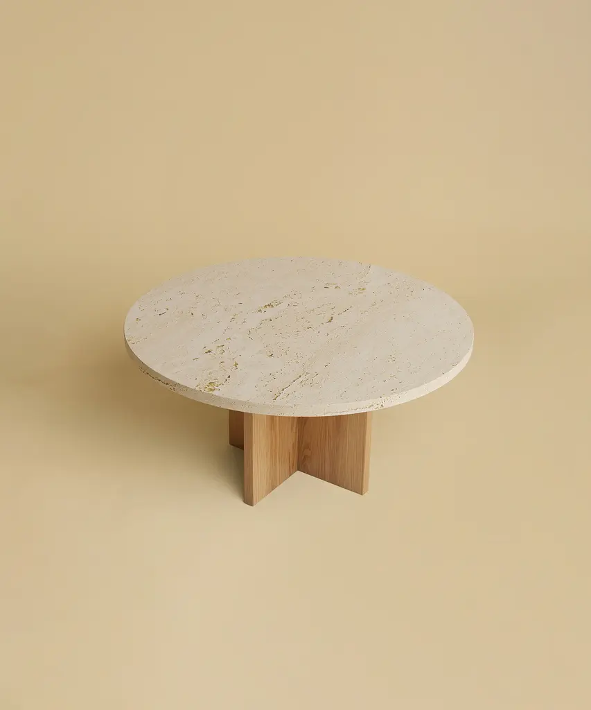 The Tinian coffee table is produced with an oak wood base and a marble or travertine top. The top is circular and 23.6 inches in diameter, while the base is obtained by gluing oak slabs perpendicular to each other. Founded by Emanuela Terraneo and Alessandro Pozzi, Lebanto designs and produces modern and refined furniture in Cantù, Italy.