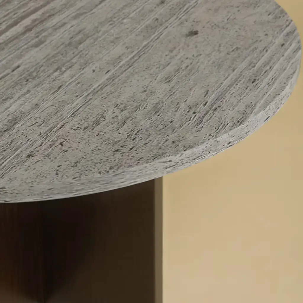 Crafted with masterful expertise and precision, this coffee table from the Tinian Collection embodies a seamless blend of durmast wood and Titanium travertine. It features a circular marble top, resting on a sleek wooden base, both finished by hand enhancing the natural allure and historical essence of the raw materials. Available in other marble types, please consult the Artemest catalog for options.