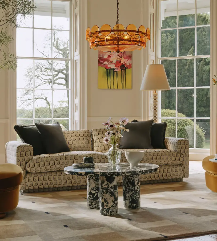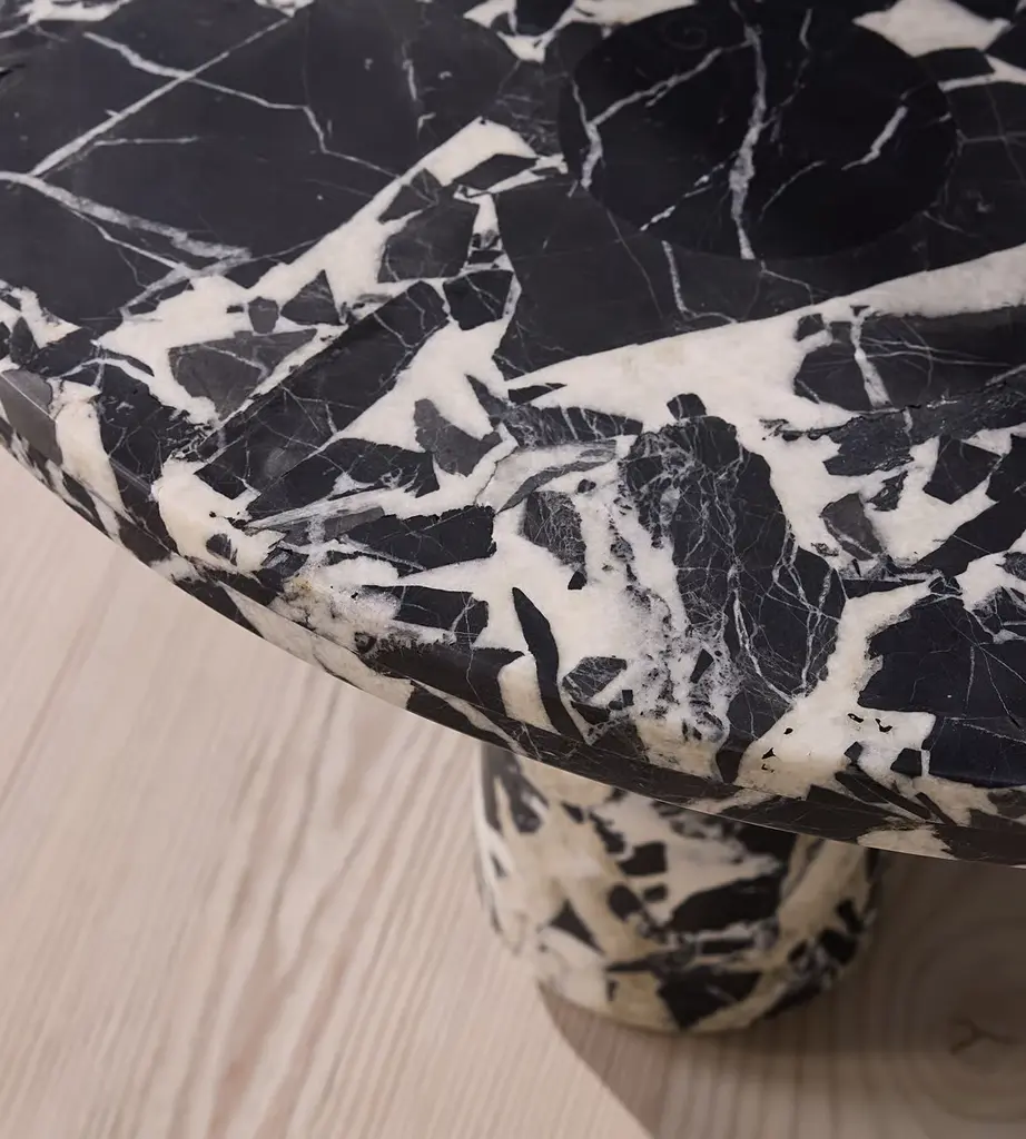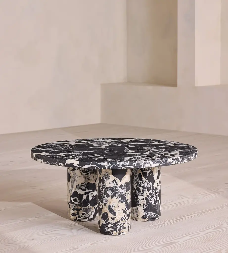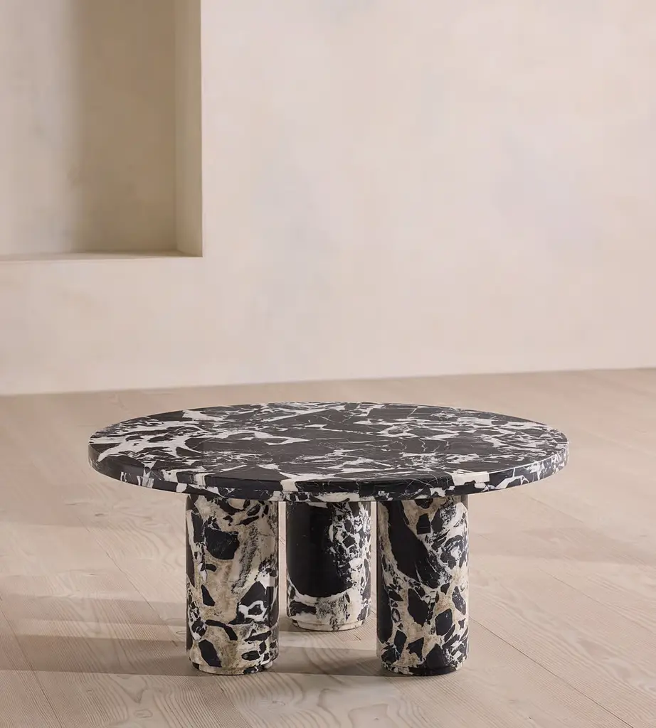 A circular top sits on three cylindrical columns, carved from polished Noir Grande marble. Taking inspiration from the marble styles seen throughout 180 House, the sculptural silhouette of the Tisbury coffee table is crafted from a black and white polished stone. Thanks to natural veining that ripples across its surface, no two pieces are completely alike.