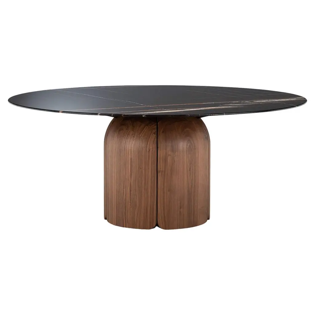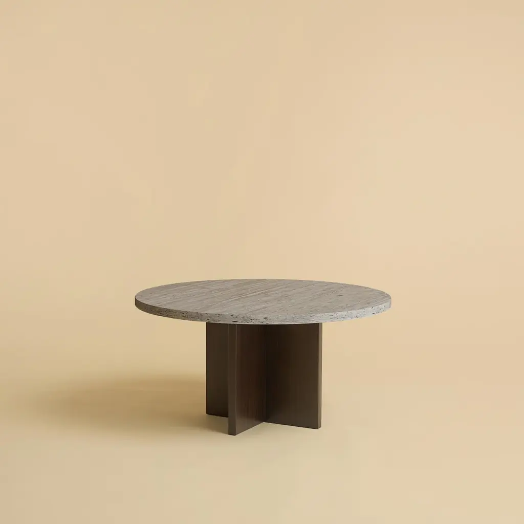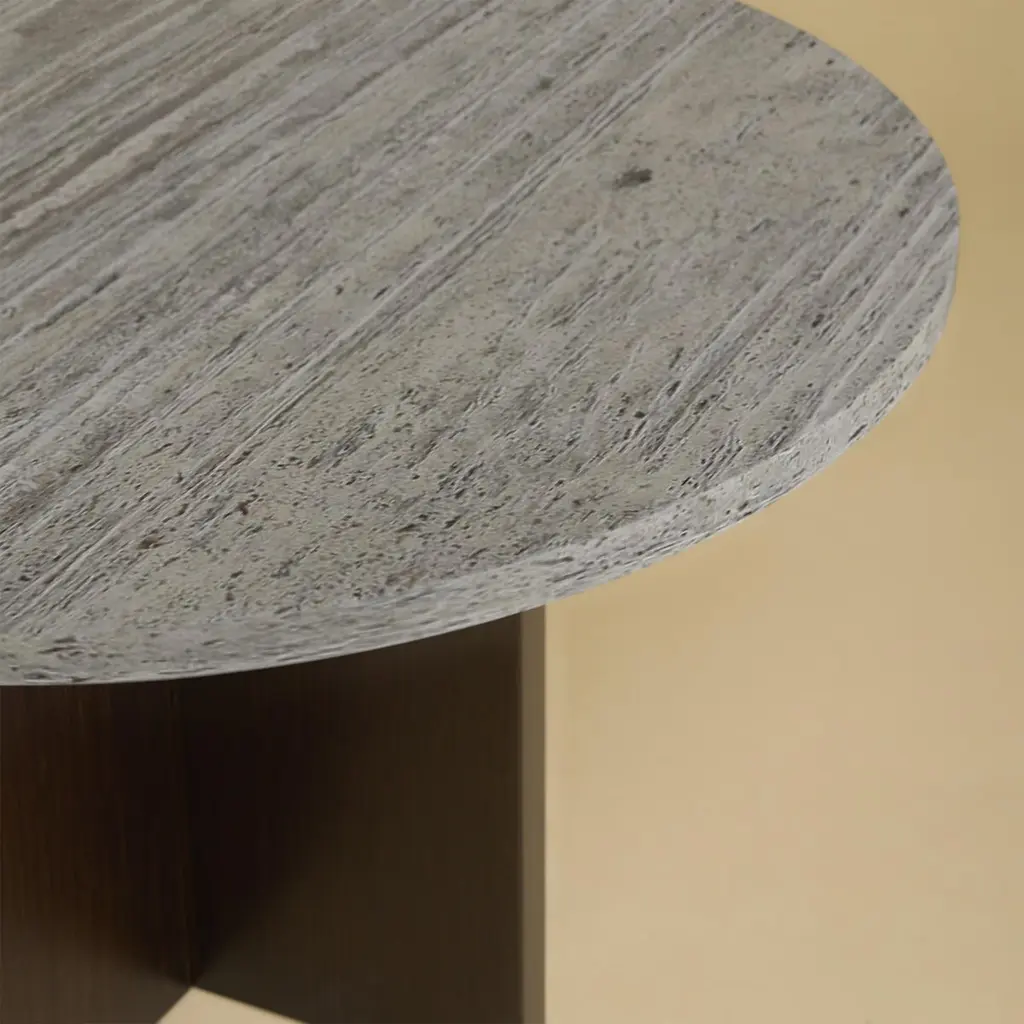 The Tinian coffee table is produced with an oak wood base and Titanium travertine top. The top is circular and 60cm in diameter, while the base is obtained by gluing oak planks perpendicular to each other.Artisanal production made of technological innovation andan old-fashioned expertise where marble and wood are carefully finished manually to preserve and highlight their nature and preciousness of their history. Designed to be placed in indoor in dark livings for the classic tone-on-tone effect, or in light environments where the contrast with the context stands out. A contemporary and minimal style is the one that goes perfectly with these elements and accentuates its class, value and elegance.The piece is designed by Lebanto and is 100% Made in Italy in small familiar workshop. Attention to details and superior material is what distinguish Lebanto products.
