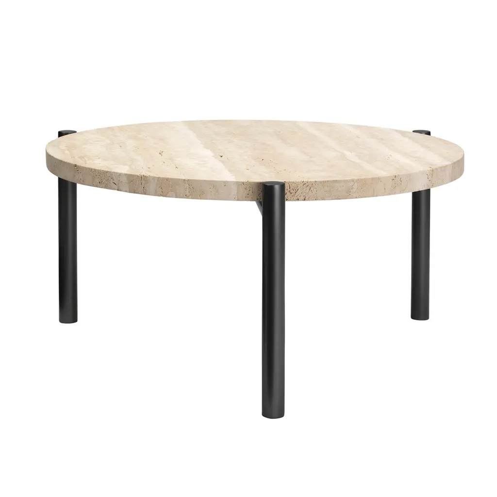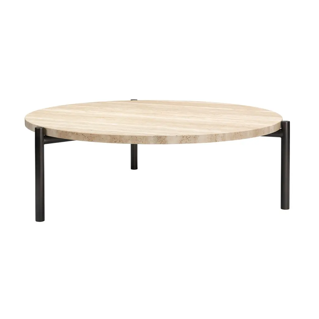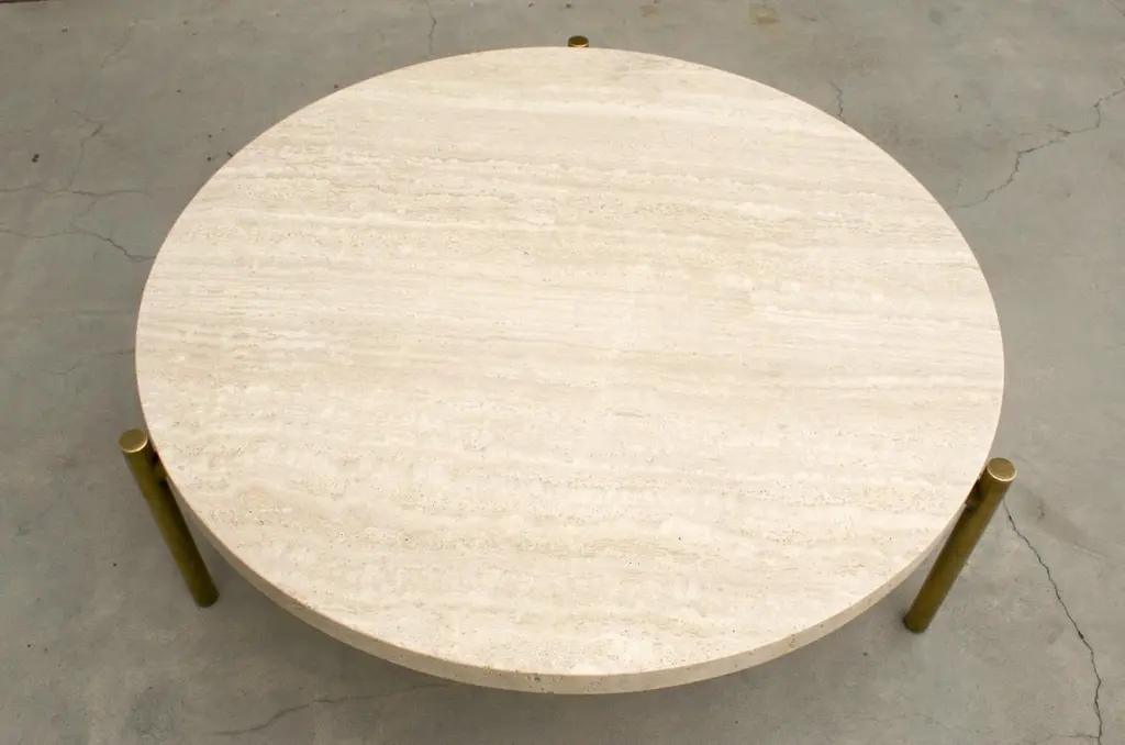 Ten10 Tivoli coffee table with 3 legs and a round travertine top. The table measures 39" diameter x 13" high. The top is 3cm thick vein cut unfilled honed Roman travertine. The stone is naturally porous and the veins are meant to show, and are part of the natural beauty of the travertine. The base is stainless steel tube plated in burnished brass. Other finishes are available - oil rubbed bronze or polished or brushed stainless steel. The legs have adjustable glides. This table is suitable for indoor or outdoor use. Custom sizes are available to order. Please inquire for details. We have been making this table since 2003.