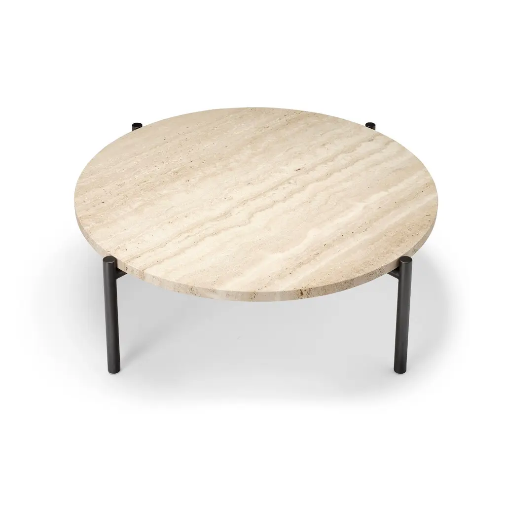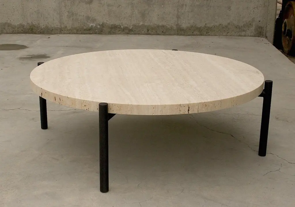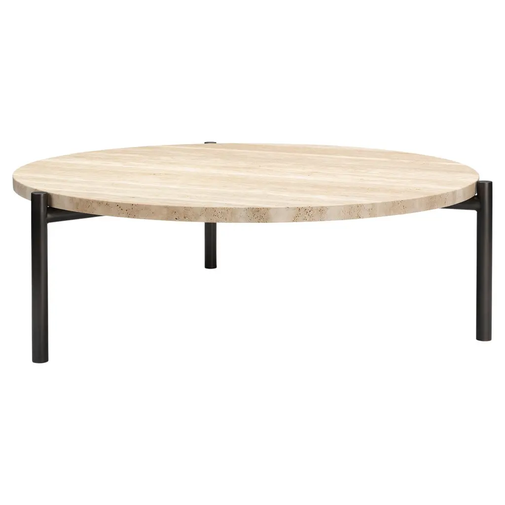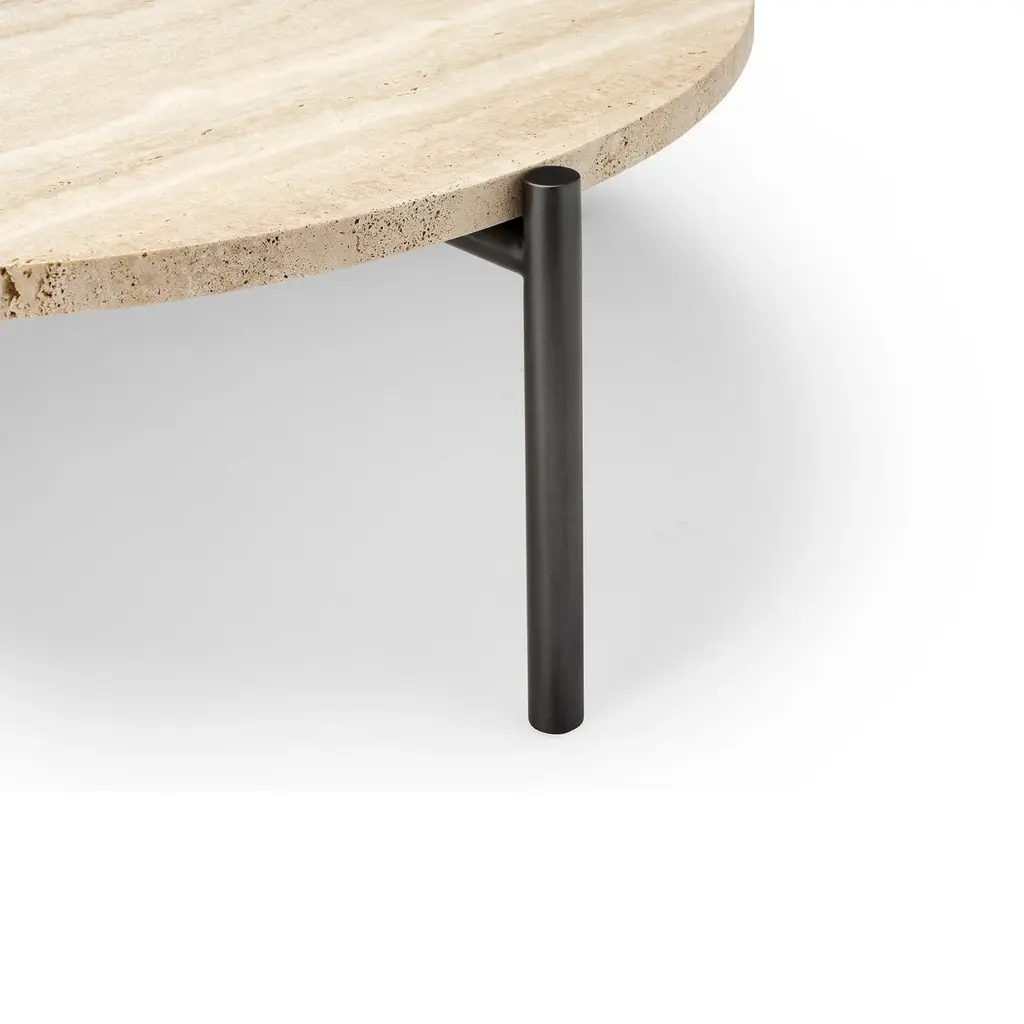 Ten10 Tivoli coffee table with 4 legs and a round travertine top. It is also available with a square top. The base is stainless steel tube plated in oil rubbed bronze. Other finishes are available - burnished brass or polished or brushed stainless steel. The top is 3cm thick vein cut unfilled honed travertine. The stone is naturally porous and the veins are meant to show, and are part of the natural beauty of the travertine. The table measures 39" diameter x 13" high. Custom sizes are available. The legs have adjustable glides. This table is suitable for indoor or outdoor use. We have been making this table since 2003.