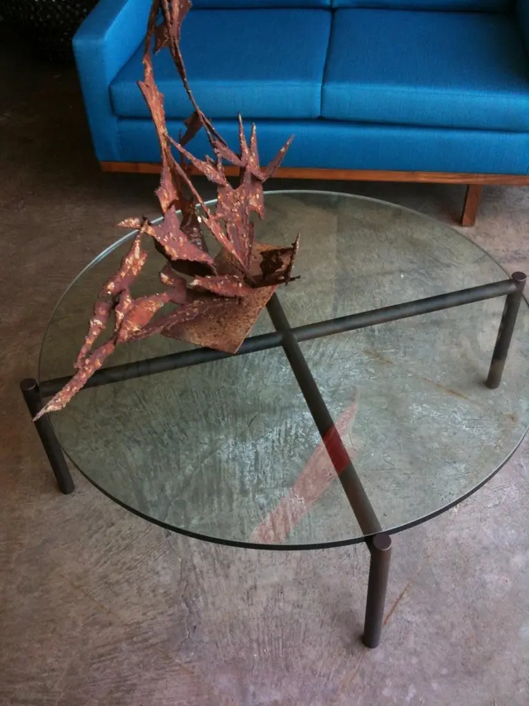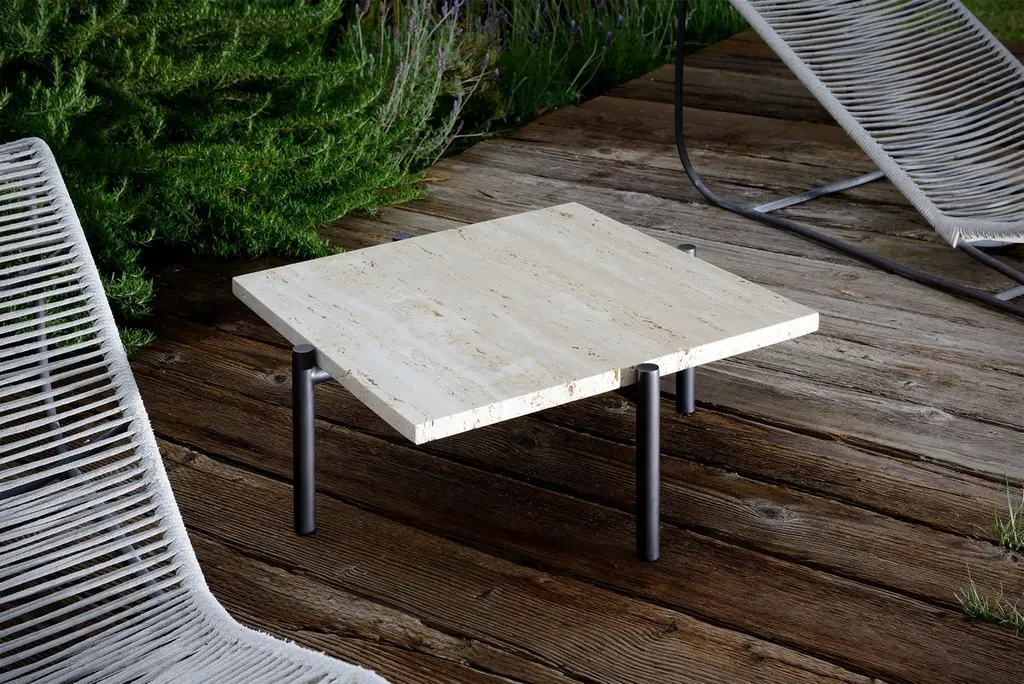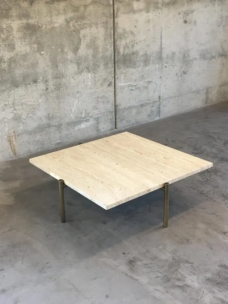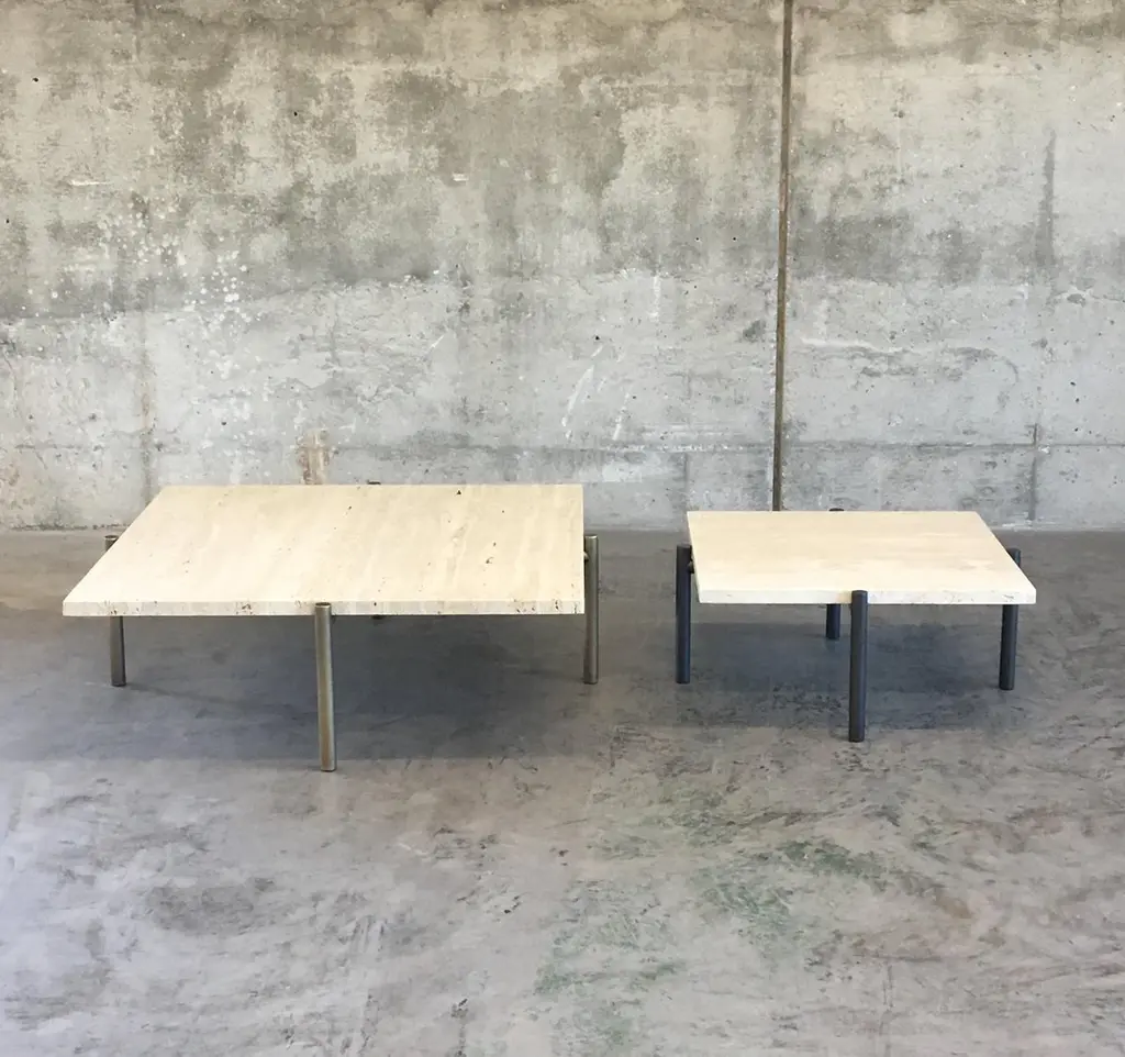 Ten10 Tivoli coffee table with 4 legs and a round travertine top. It is also available with a square top. The base is stainless steel tube plated in oil rubbed bronze. Other finishes are available - burnished brass or polished or brushed stainless steel. The top is 3cm thick vein cut unfilled honed travertine. The stone is naturally porous and the veins are meant to show, and are part of the natural beauty of the travertine. The table measures 39" diameter x 13" high. Custom sizes are available. The legs have adjustable glides. This table is suitable for indoor or outdoor use. We have been making this table since 2003.