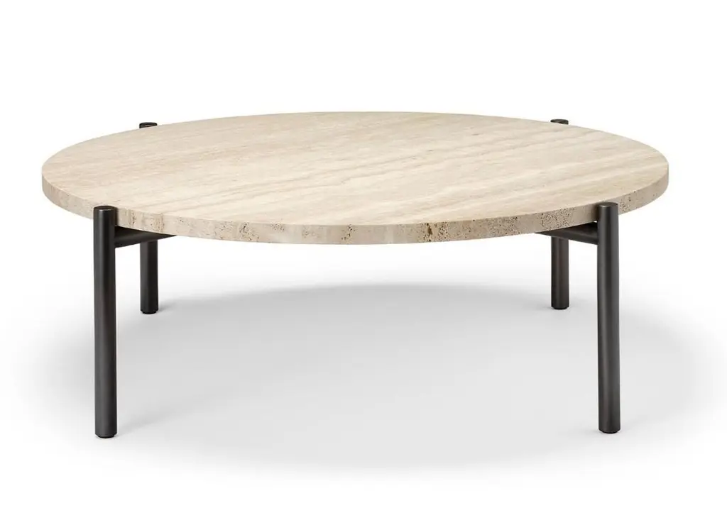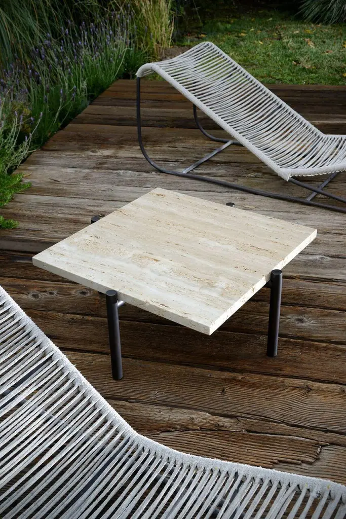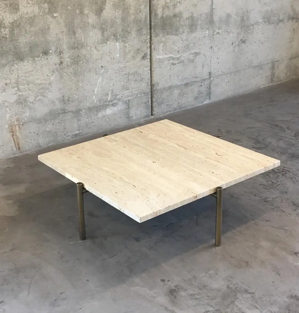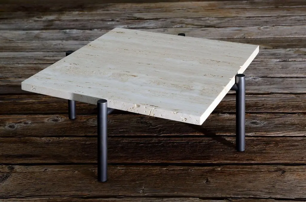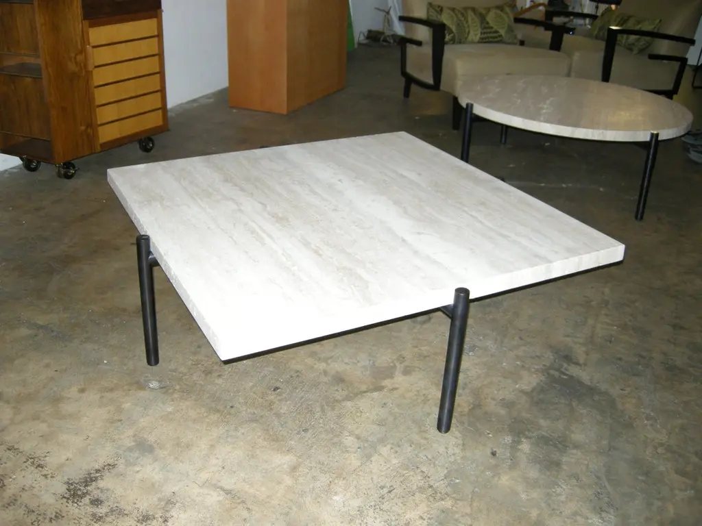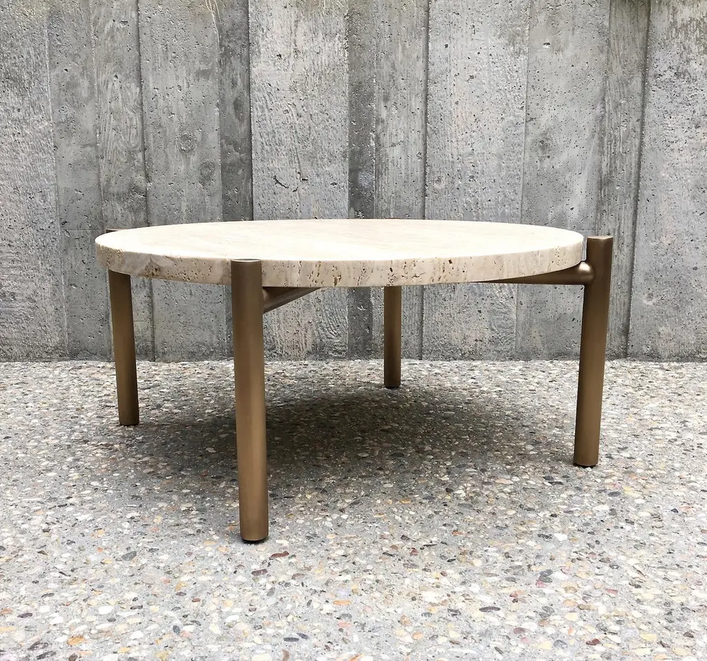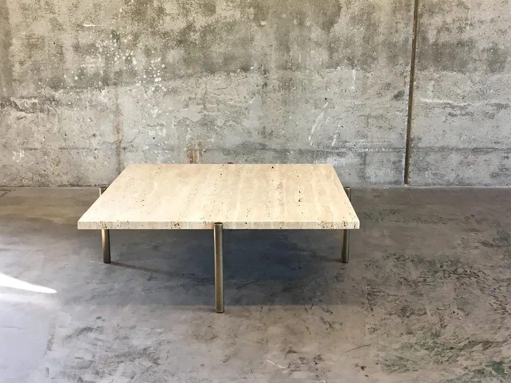 Ten10 Tivoli coffee table with 4 legs and a square top. It can also have a round top. The base is stainless steel tube plated in either oil rubbed bronze or burnished brass. It can also be polished or brushed stainless steel. The top is 3cm thick vein cut unfilled honed travertine. The stone is naturally porous and the veins are meant to show, and are part of the natural beauty of the travertine. The table measures 39" wide x 39" deep x 13" high. Custom sizes are available. The legs have adjustable glides. This table is suitable for indoor or outdoor use. We have been making this table since 2003.