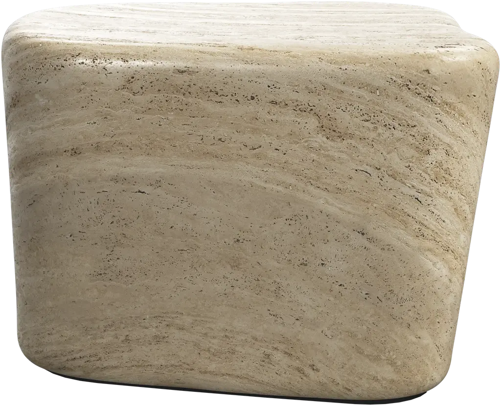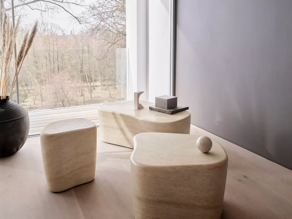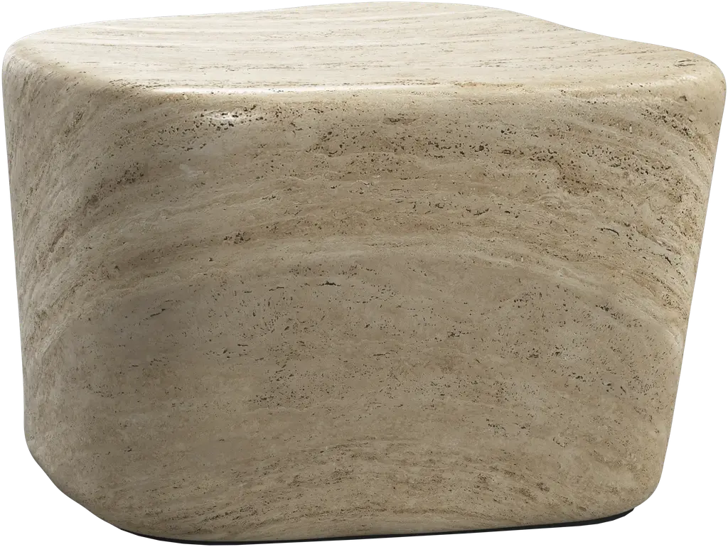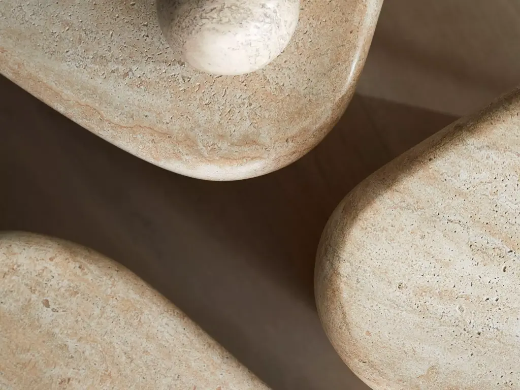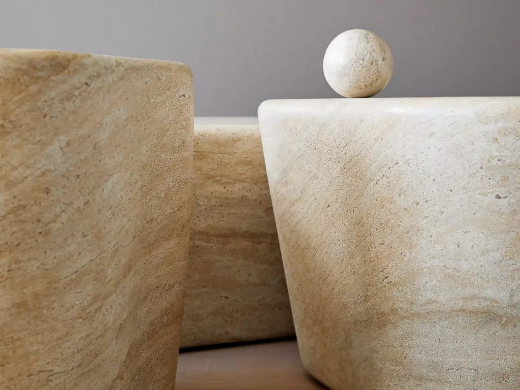 The Tivoli table is crafted from concrete and covered with a printed travertine finish, redefining contemporary elegance and innovative design. It is available in three distinct shapes, each embodying an architectural spirit. Its core boldness lies not only in its esthetic appeal but also in its ability to transform any space.