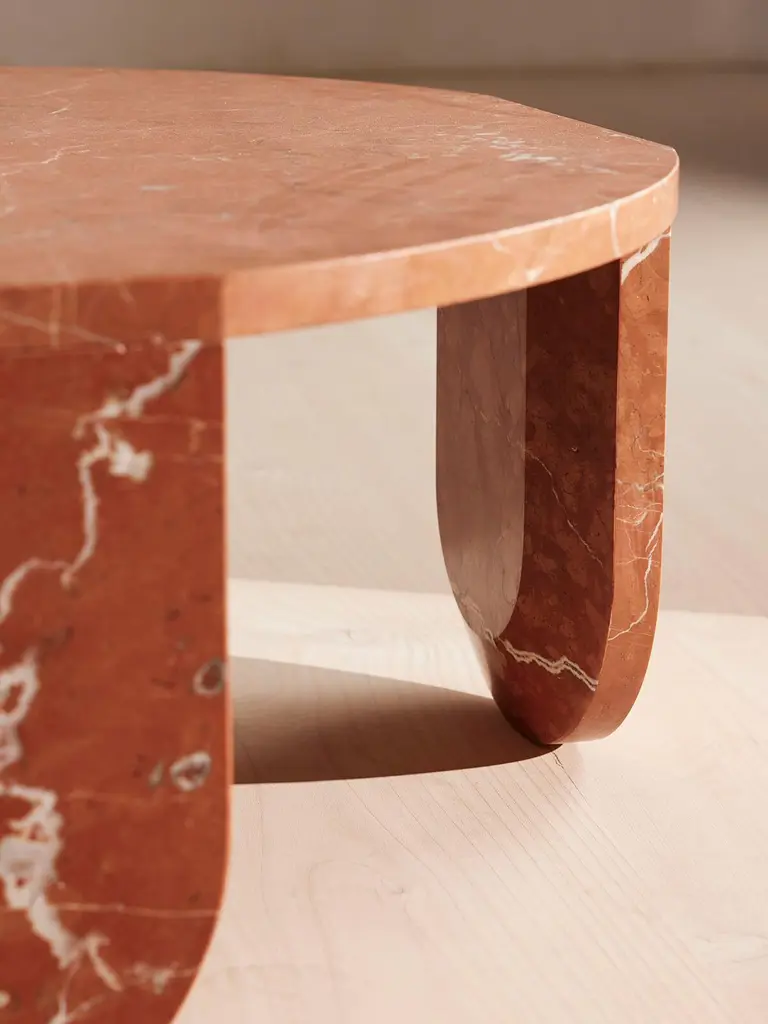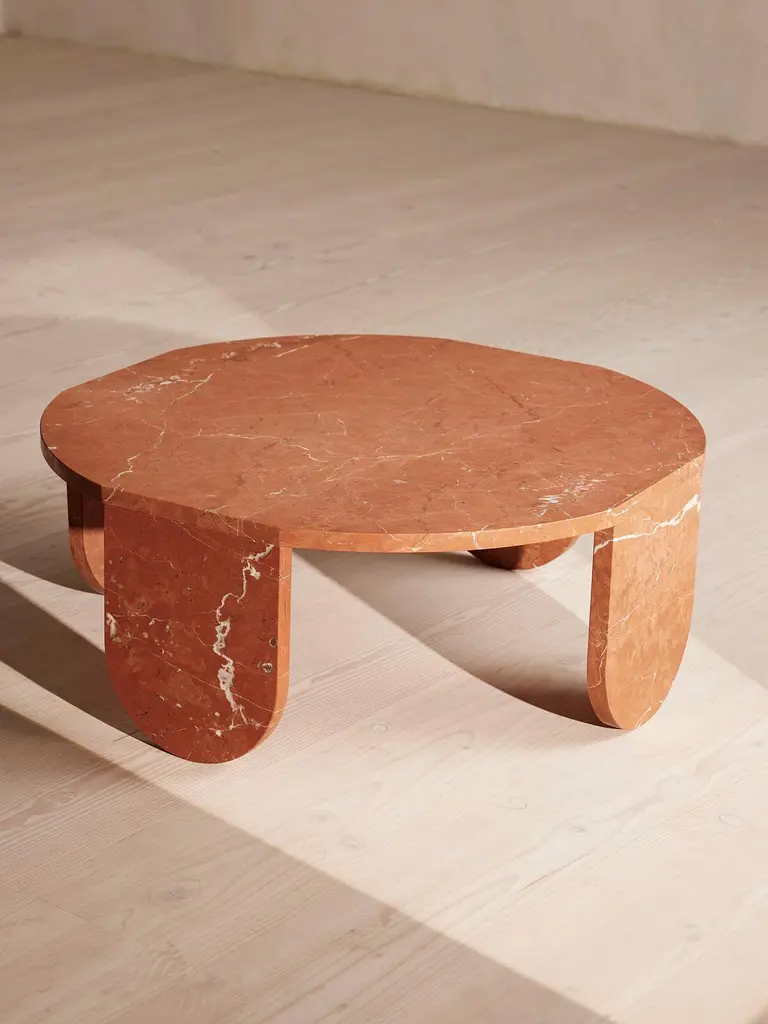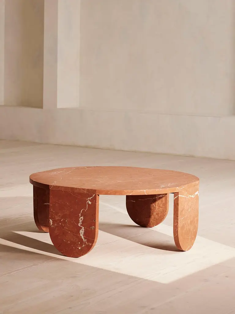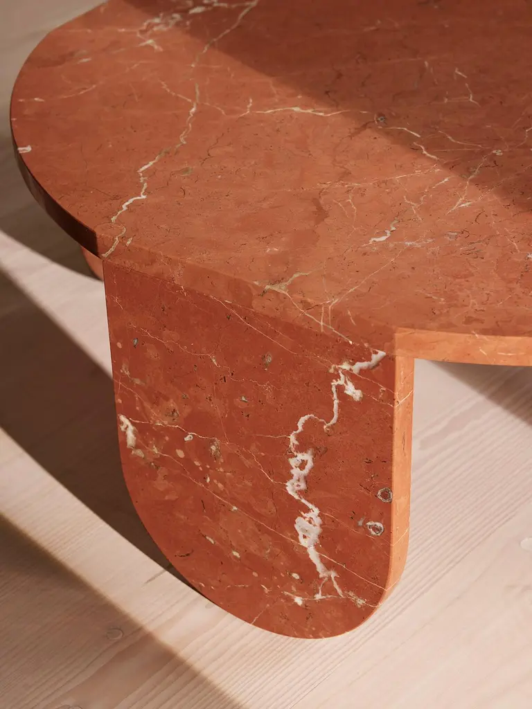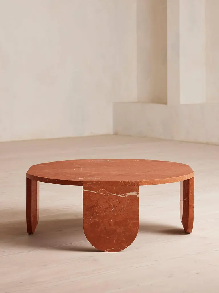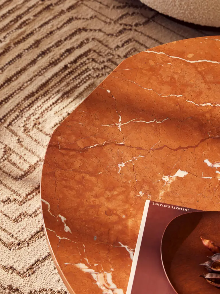 The Tobias coffee table has been crafted from honed Rosso Alicante marble, a Spanish orange-red stone with defined white veining. A structured circular top and carved sculptural curved legs bring a contemporary feel to the standout piece. Place in an open living area to echo the warmth of the Italian dining settings in Soho House Rome. Honed marble coffee table Rosso Alicante marble sourced from Spain Each table is unique due to variations in the stone Circular top Carved sculptural curved legs Inspired by Soho House Rome