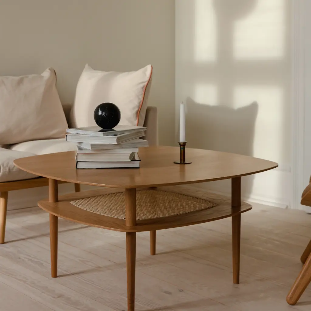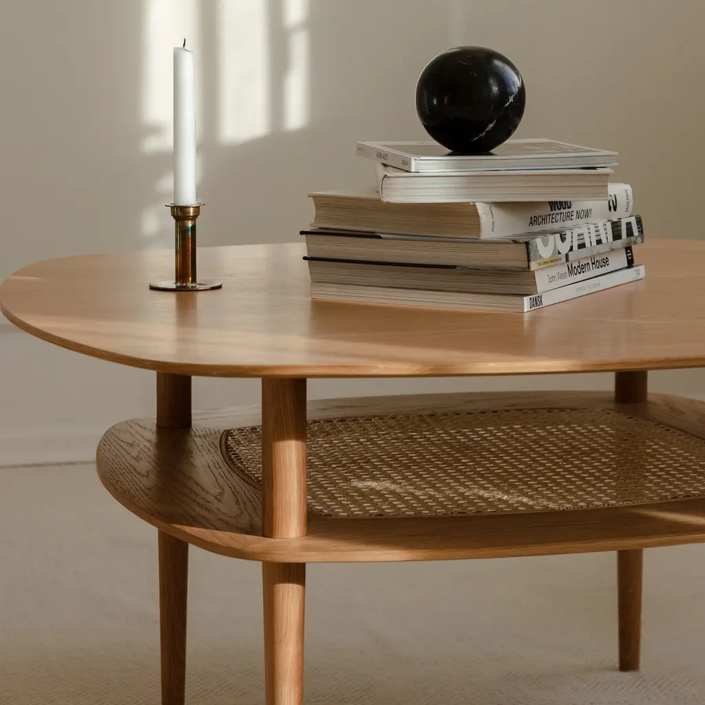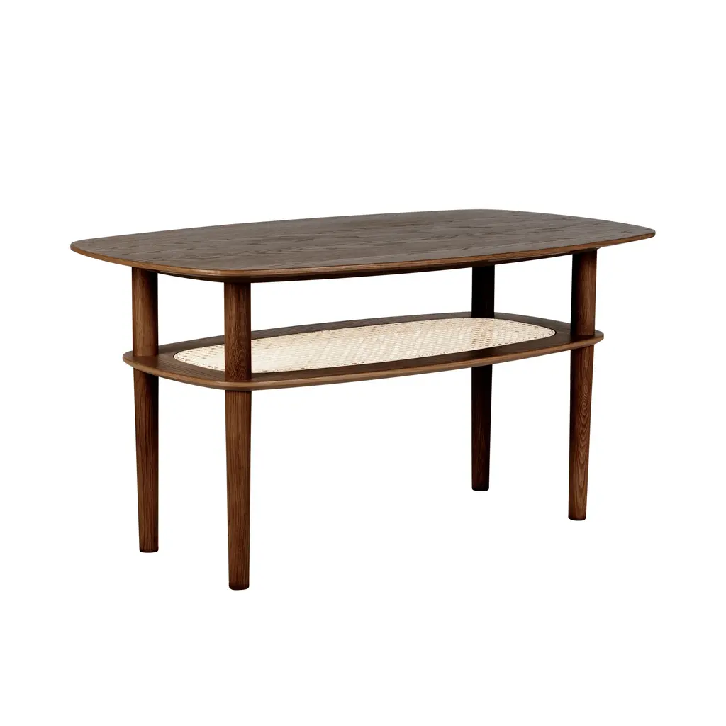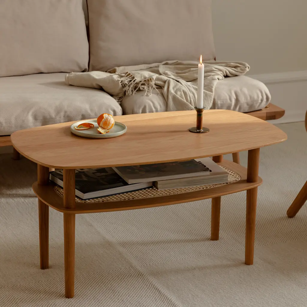 The Together Coffee Table features rounded corners and a Venetian cane shelf beneath its oak tabletop. Designed by Søren Ravn Christensen, known for his innovative approach to furniture design, the table's legs are positioned inward to enhance safety. Available in sleek rectangle and smooth square variants, each in oak, dark oak, or black oak finishes, the Together Coffee Table provides ample space for gatherings and storage.