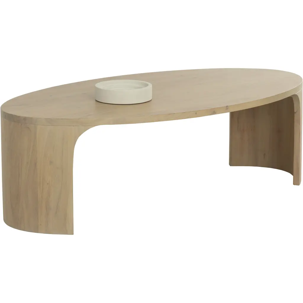 Boasting a beautiful, oval design, this mid-century modern coffee table is a stunning addition to any space. Crafted from solid light acacia wood with gently curved legs. As wood is an organic, porous material, these pieces will contain natural variation of texture and may also exhibit fine indentations and cracks. Wood pieces will also display a disparity of colour and grain, and visible knots and burls that add to the character of each piece. Made in India. With refined craftsmanship, this design was brought to life by skilled local artisans. Due to the nature of handcraftsmanship, unique imperfections such as fissures, markings and variations in colour and shape are welcomed and appreciated characteristics for a truly one-of-a-kind piece.