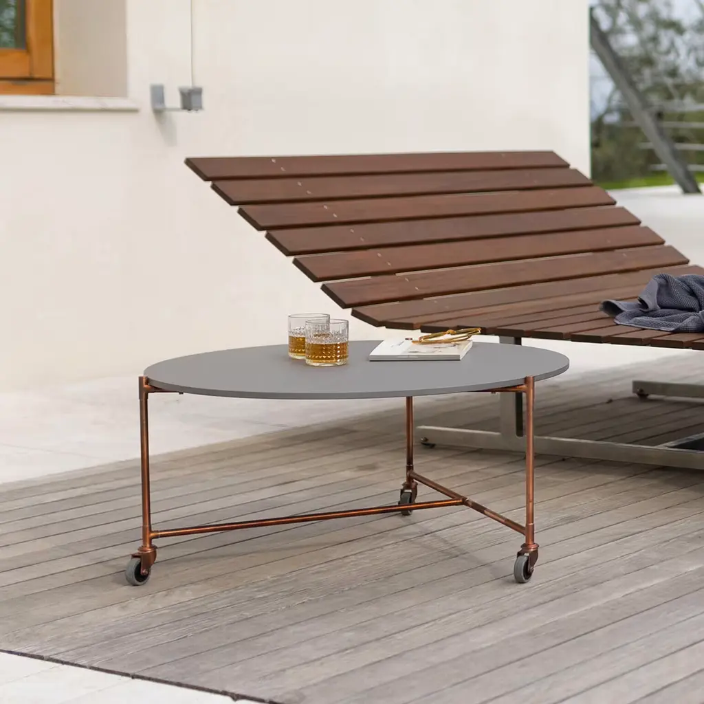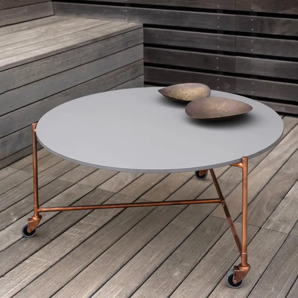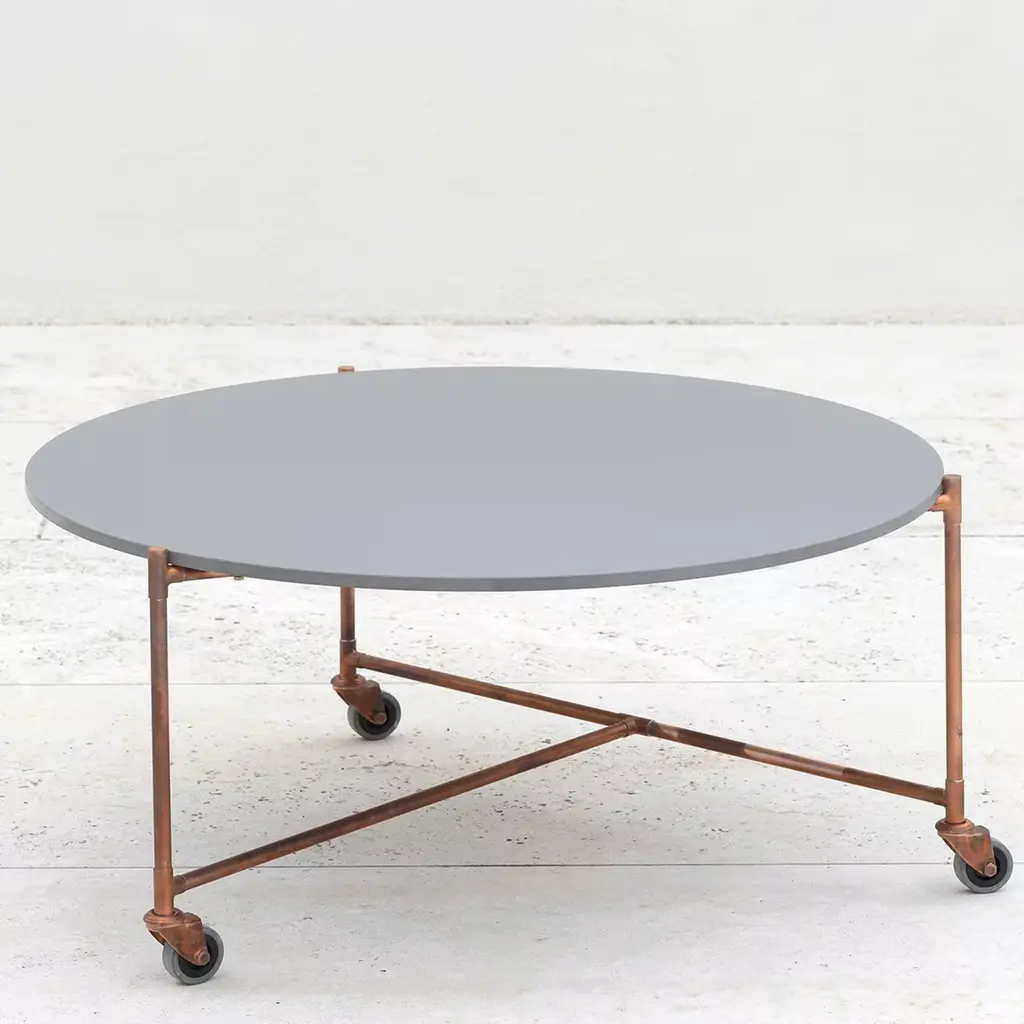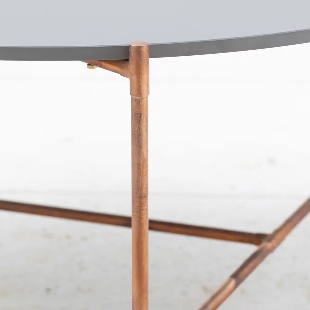A light side table that can be adapted to different uses and circumstances. It consists of copper tubing connected by copper “t” fittings, forming a triangulation capable of supporting a thin circular HPL surface.