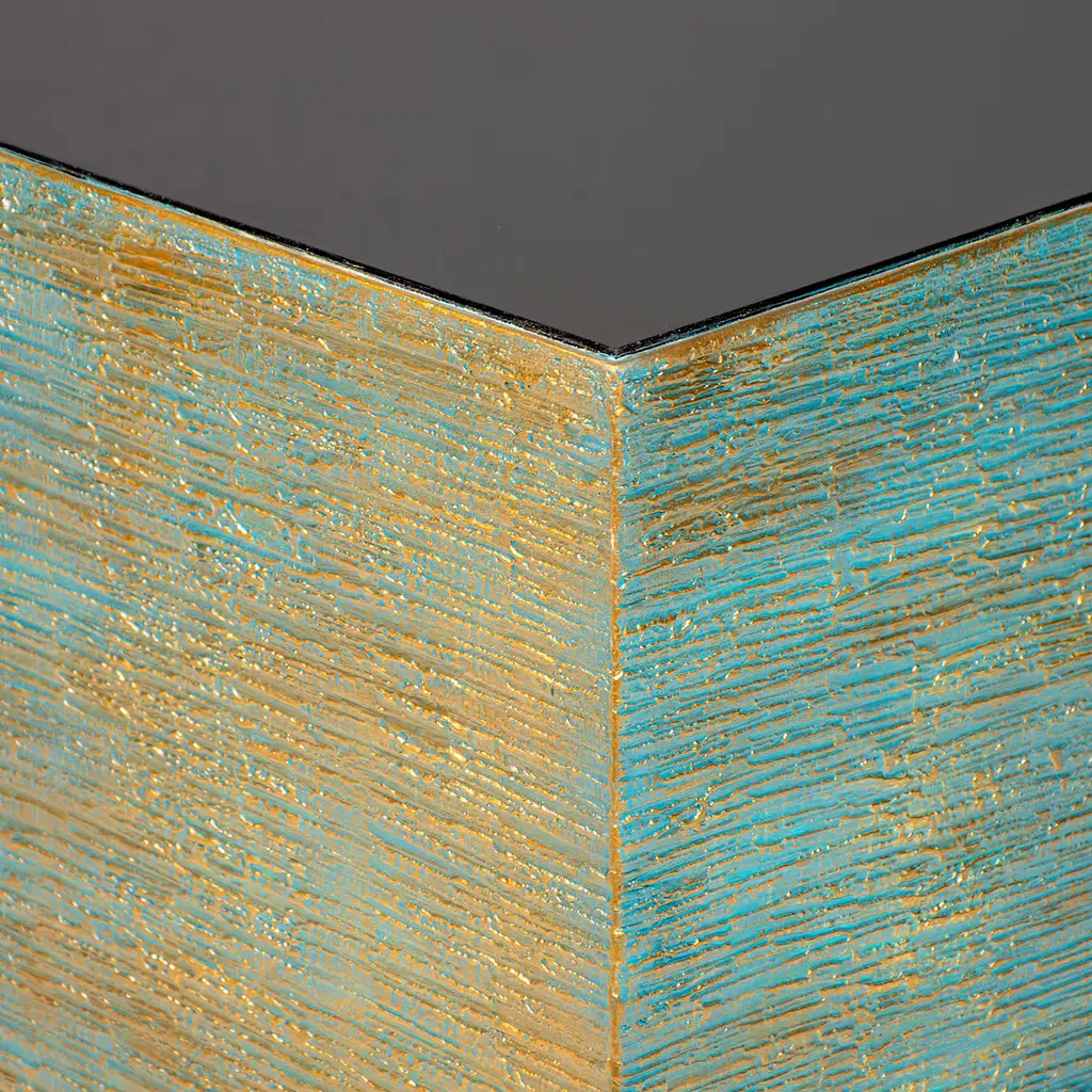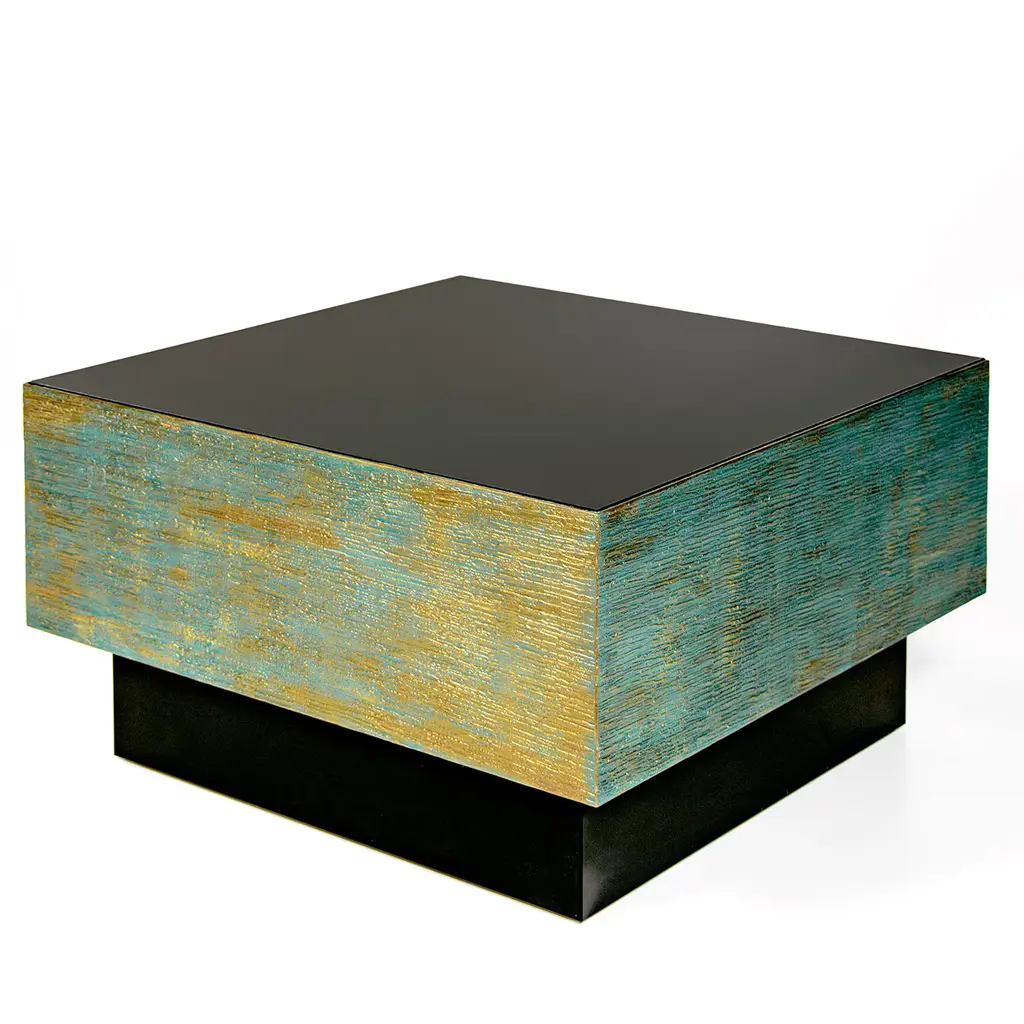 Bold, minimalist, and striking, the Toque Coffee Table will not go unnoticed despite its basic shape. Its strong visual character lies in the combination of black glass - for the block plinth base and top surface - and 3D textured patina finish of the wooden square top, exclusively designed by Giannella Ventura. A stunning anchor to a contemporary living room, this table can be customized in other textures and RAL colors for the base (also available in crystal with price variation). Packaging case available on request at additional cost, please ask the Concierge for details.