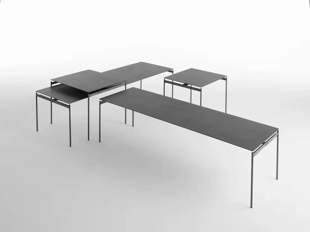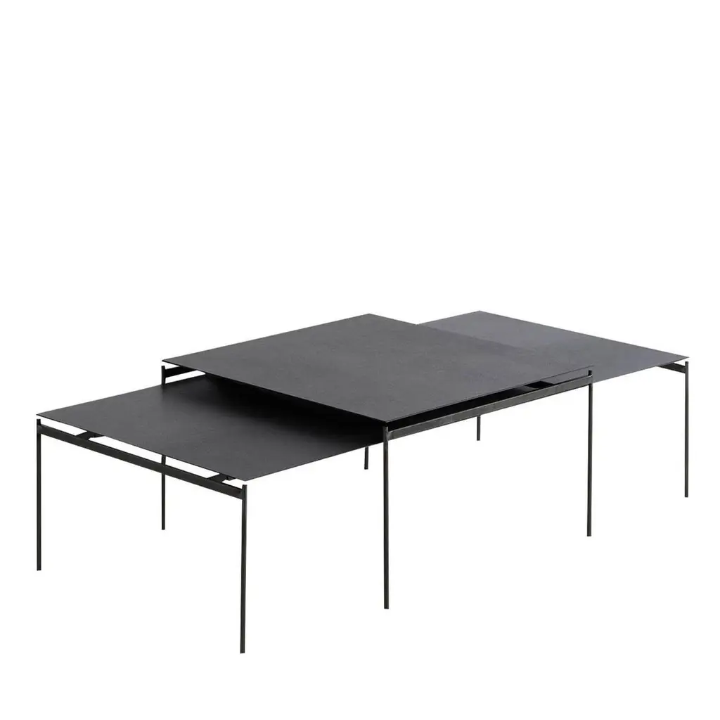 This set of two coffee tables is a minimal and sophisticated piece of functional decor designed by Renato Zamberlan boasting a post-industrial allure. Inspired by the Orient (a Torii is the traditional Japanese gateway that leads to a Shinto shrine or sacred area), each piece comprises a frame made of crude metal featuring straight and robust legs, and a slim top (3 mm) crafted of scratch and stain resistant gray ceramic. The table at the bottom measures 136 x 64 x H 35 cm, the one at the top 64 x 68 x H 40 cm.