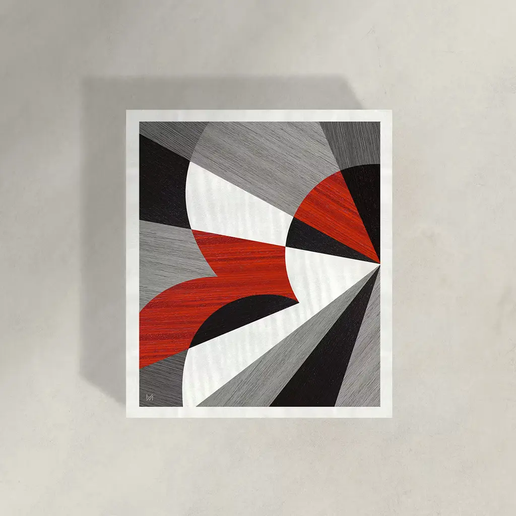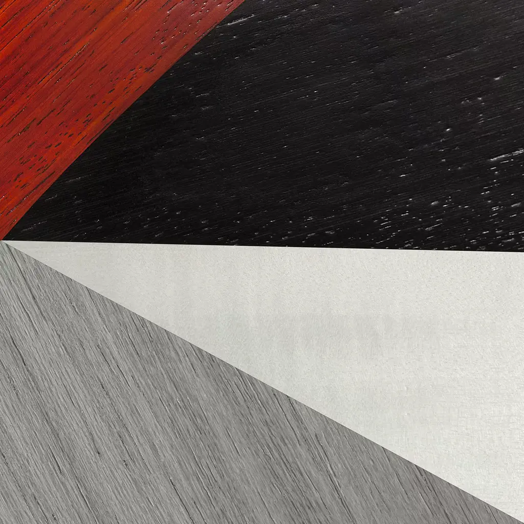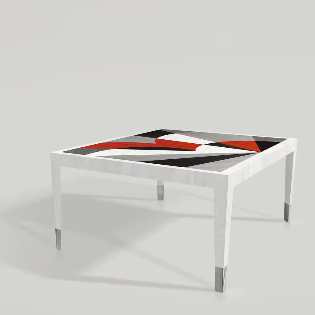Elegant and stylish, this large coffee table features a dynamic inlaid wood top anchored on four legs of white pearl Tanganyika Frisé wood, embellished with steel feet. Imbuing personality and flair to any interior, the top boasts a combination of red Ash wood, gray Jata, natural Tay, and natural Lati woods forming a bold geometric pattern, characteristic of the Torino e il Futurismo Collection. Finishing: Matte.