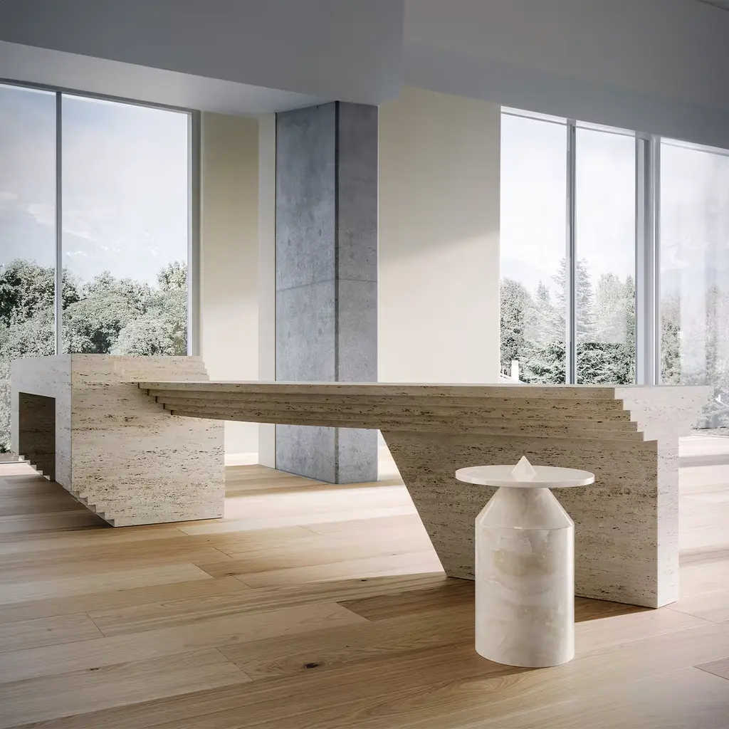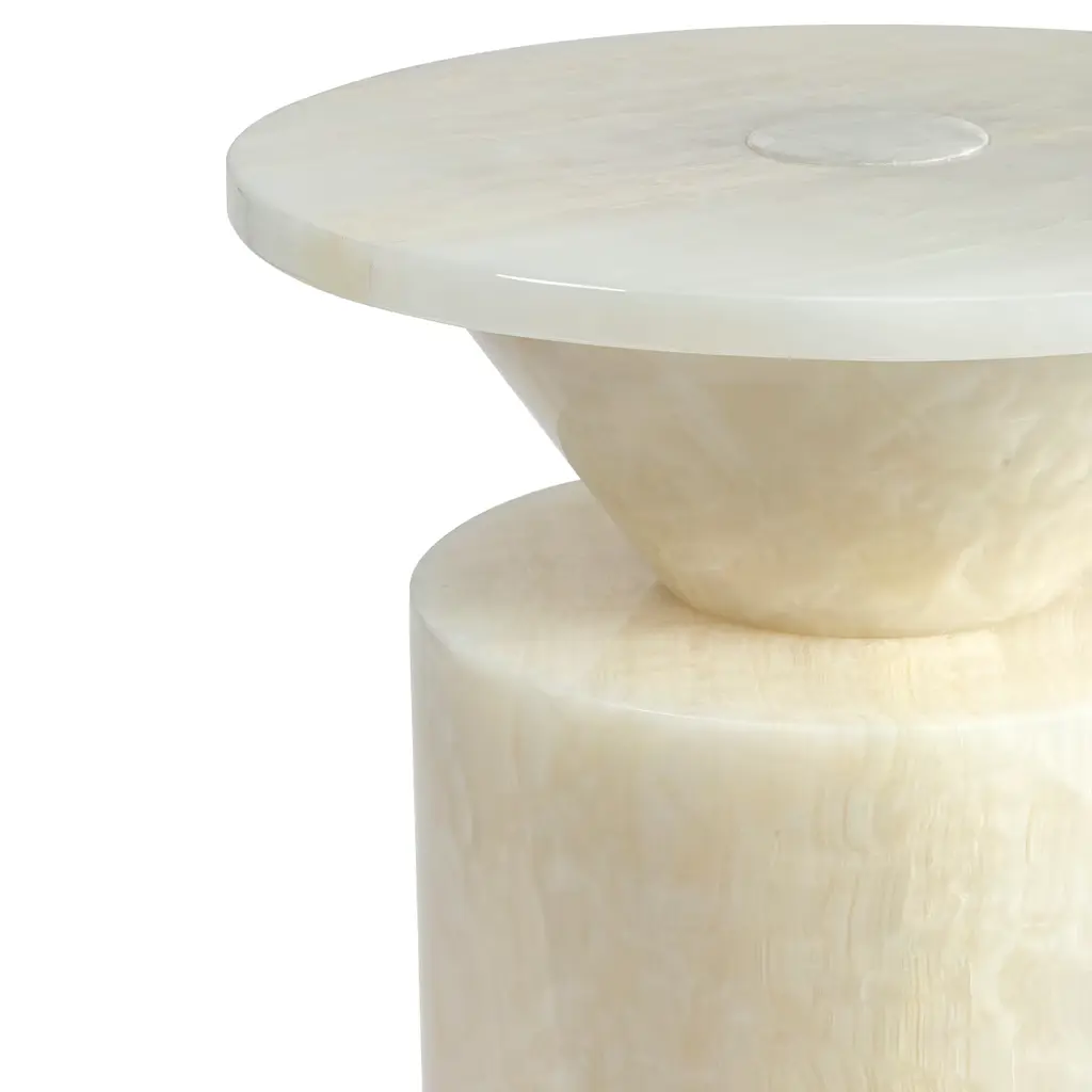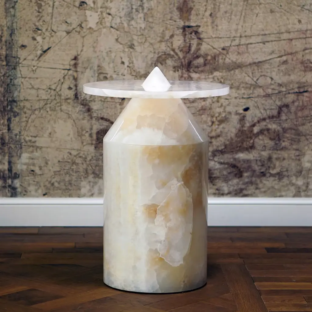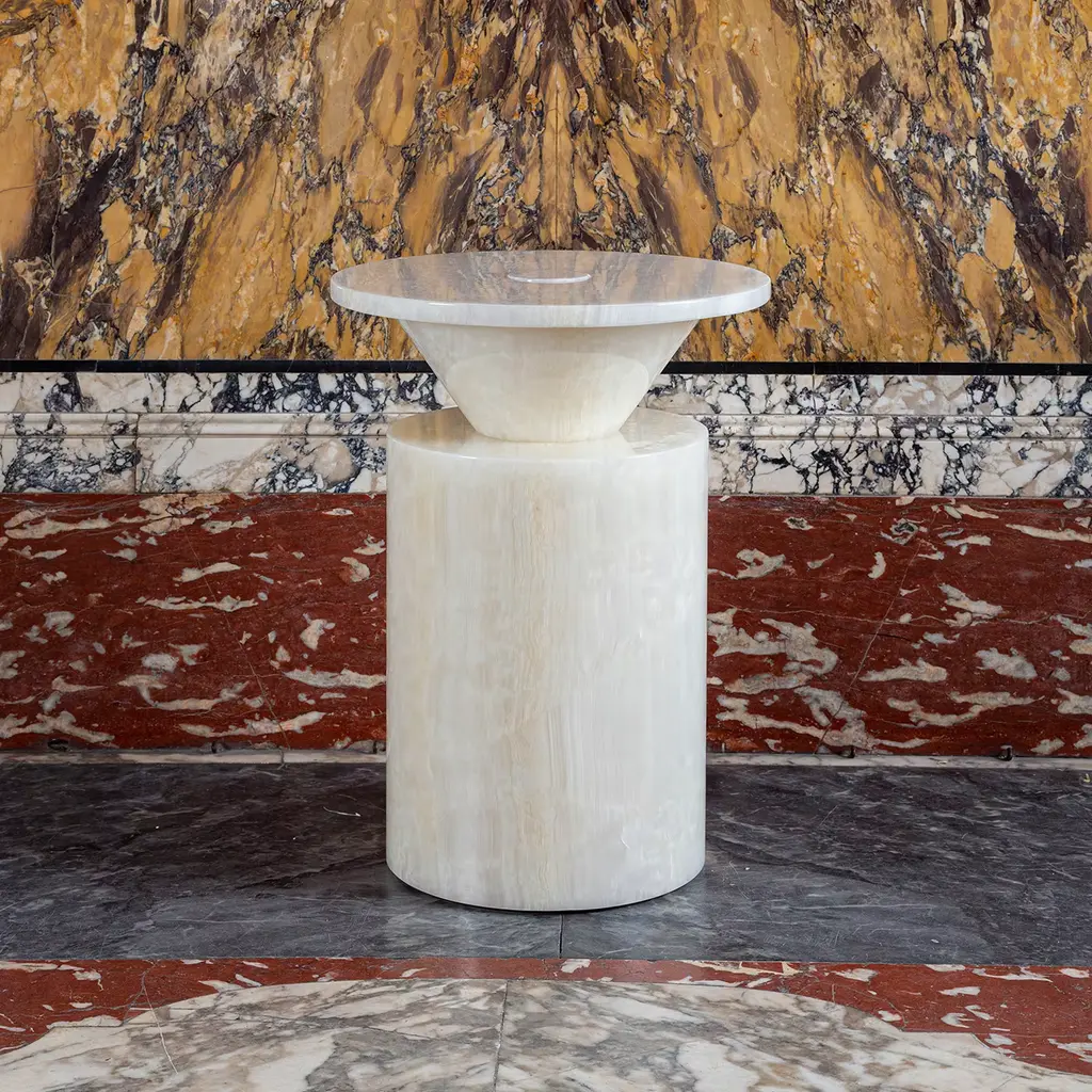 A free combination of geometric volumes defines the minimalist and transformative character of this coffee table crafted from prized white onyx. Its structural components - a cone, a cylinder, and a ring - are stacked on top of each other and can be interchanged to give birth to two different compositions, which let the table soar to an evocative, almost meditative dimension. Part of a numbered series, the design has its ceramic counterpart exhibited at the Museum of Decorative Arts in Paris. Please note that marbles and stones are natural materials and they can differ also if coming from the same quarry or the same block. The product shown may differ from purchased items. Every piece is unique. Please read carefully the unpacking and handling instructions.
