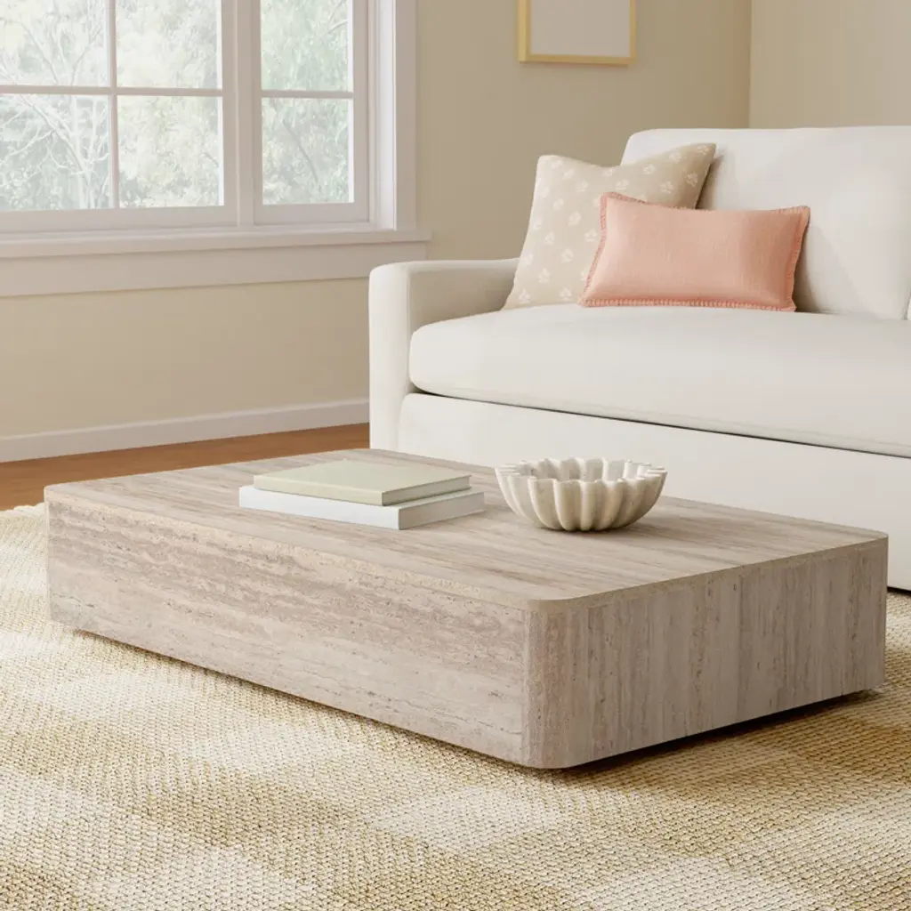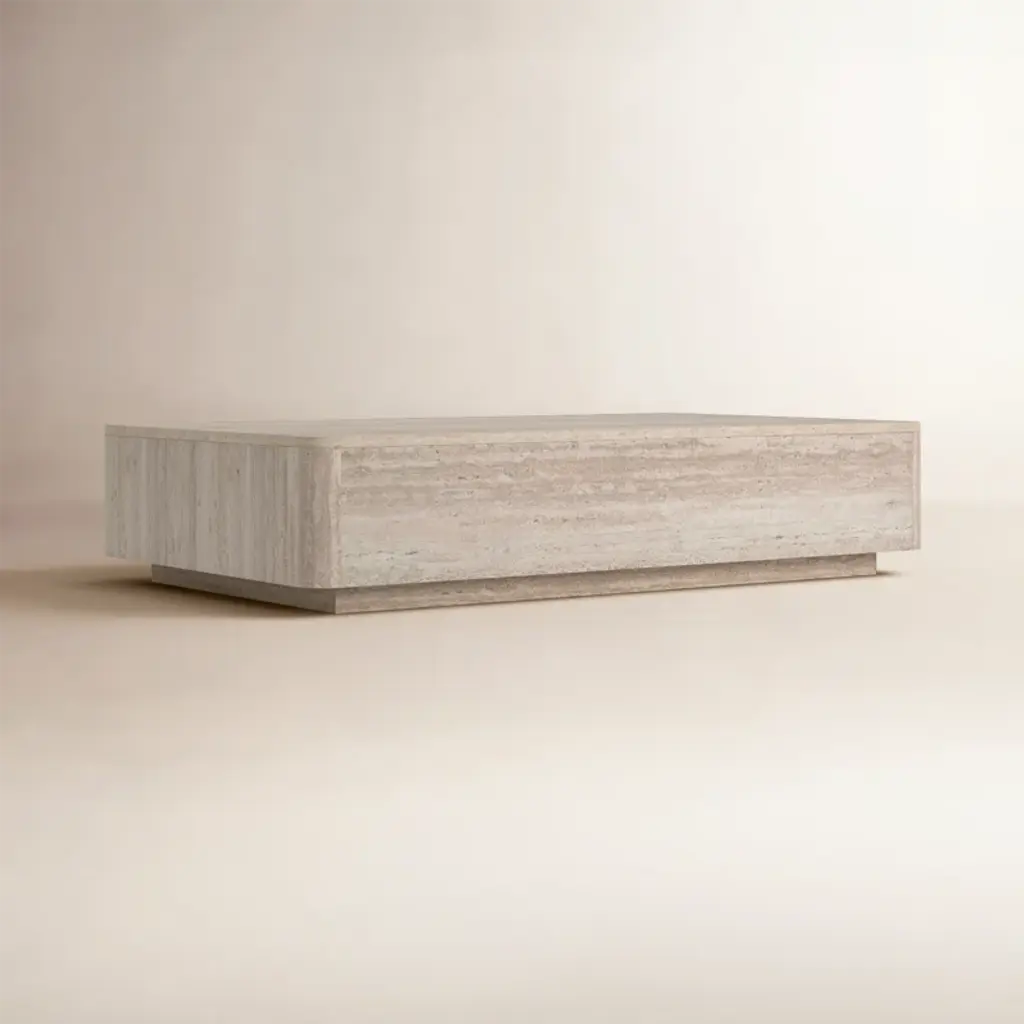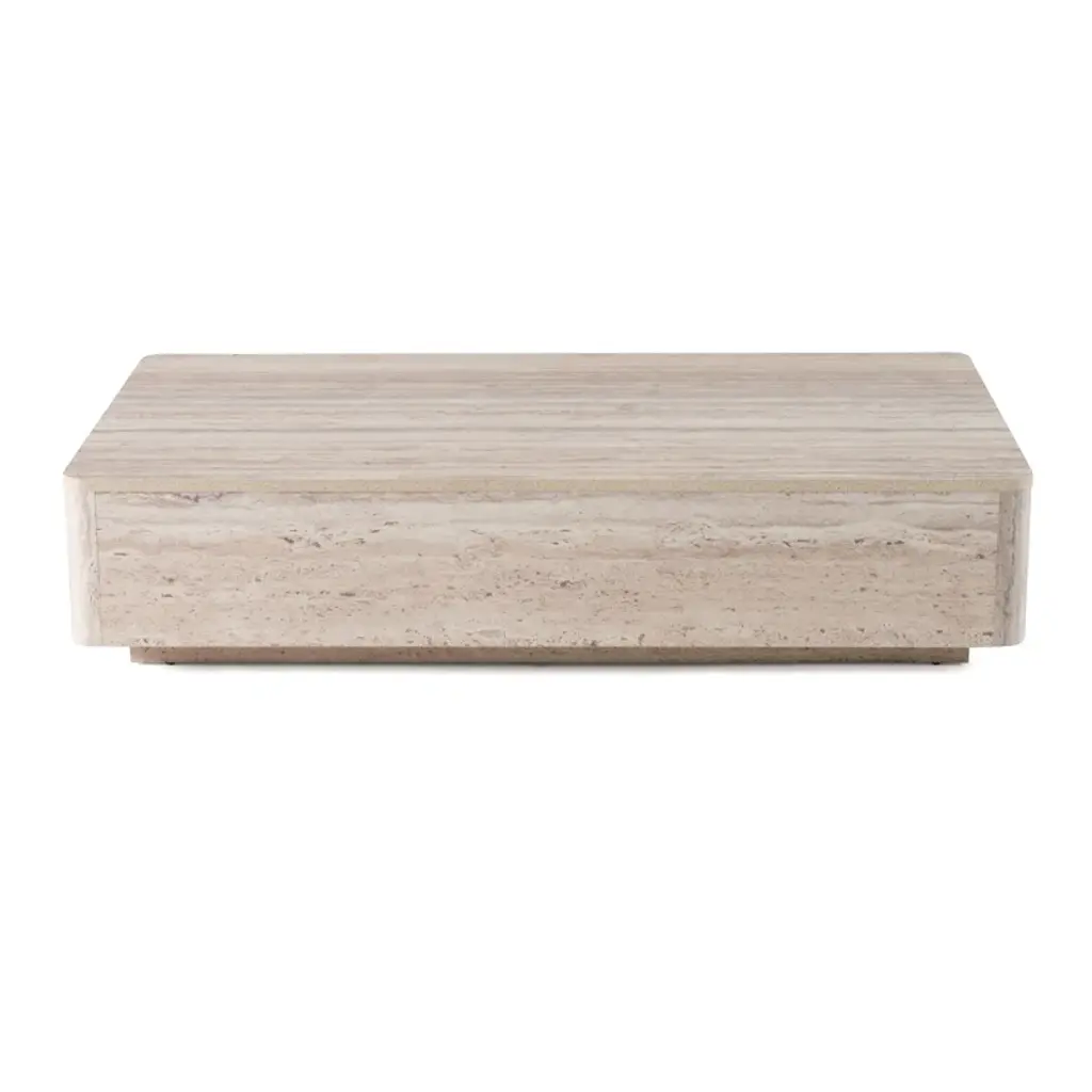 The collection features a stylish, uniform travertine stone finish, creating a sophisticated aesthetic for its pieces. The rectangular coffee table is a solid singular piece to be placed in the center of your living space, making it both attractive to the eye and functional.