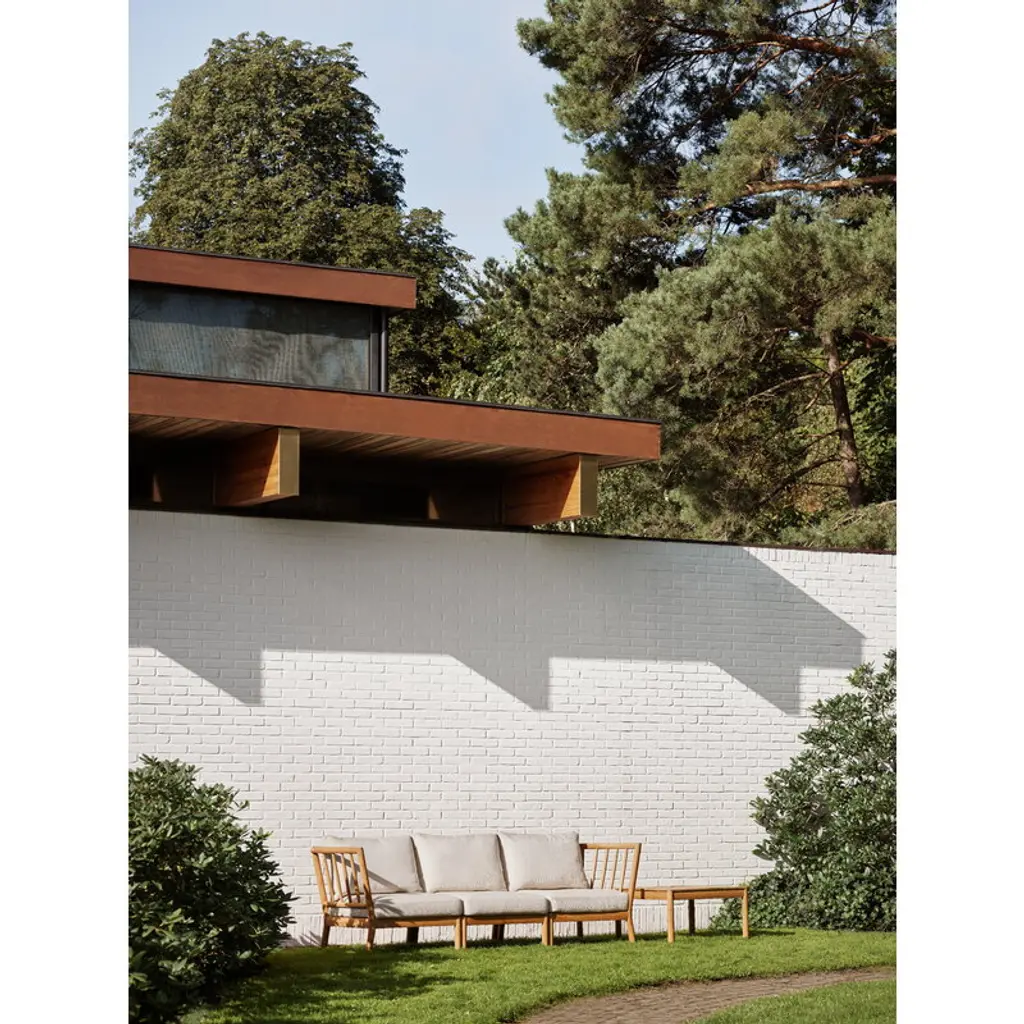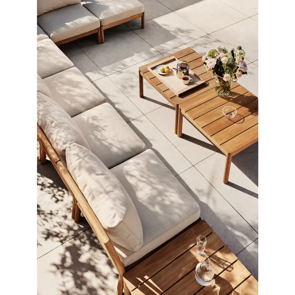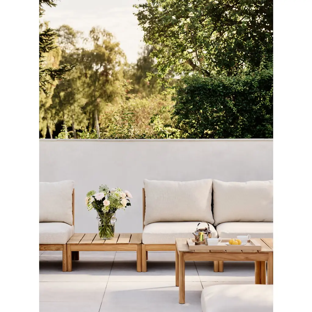 Skagerak's Tradition lounge table is part of a teak wood outdoor collection that combines classic esthetics with a modular structure, making it easily customisable and thus suitable for spaces of various sizes. Adorned with natural wood grains, this coffee table features a sturdy teak plank top with small gaps that allow summer rain to swiftly pass through. Complete your inviting summer oasis with other pieces from the Tradition series. The Tradition patio furniture was created by Danish designer Povl B. Eskildsen. Having grown up with one foot in a teak furniture factory, Eskildsen's extensive experience with teak is evident in the furniture's skilful details and serene simplicity, which leaves room for the wood's natural beauty. You can preserve the teak's original warm tone by regularly oiling the surface or allow it to slowly patina to an attractive gray shade.