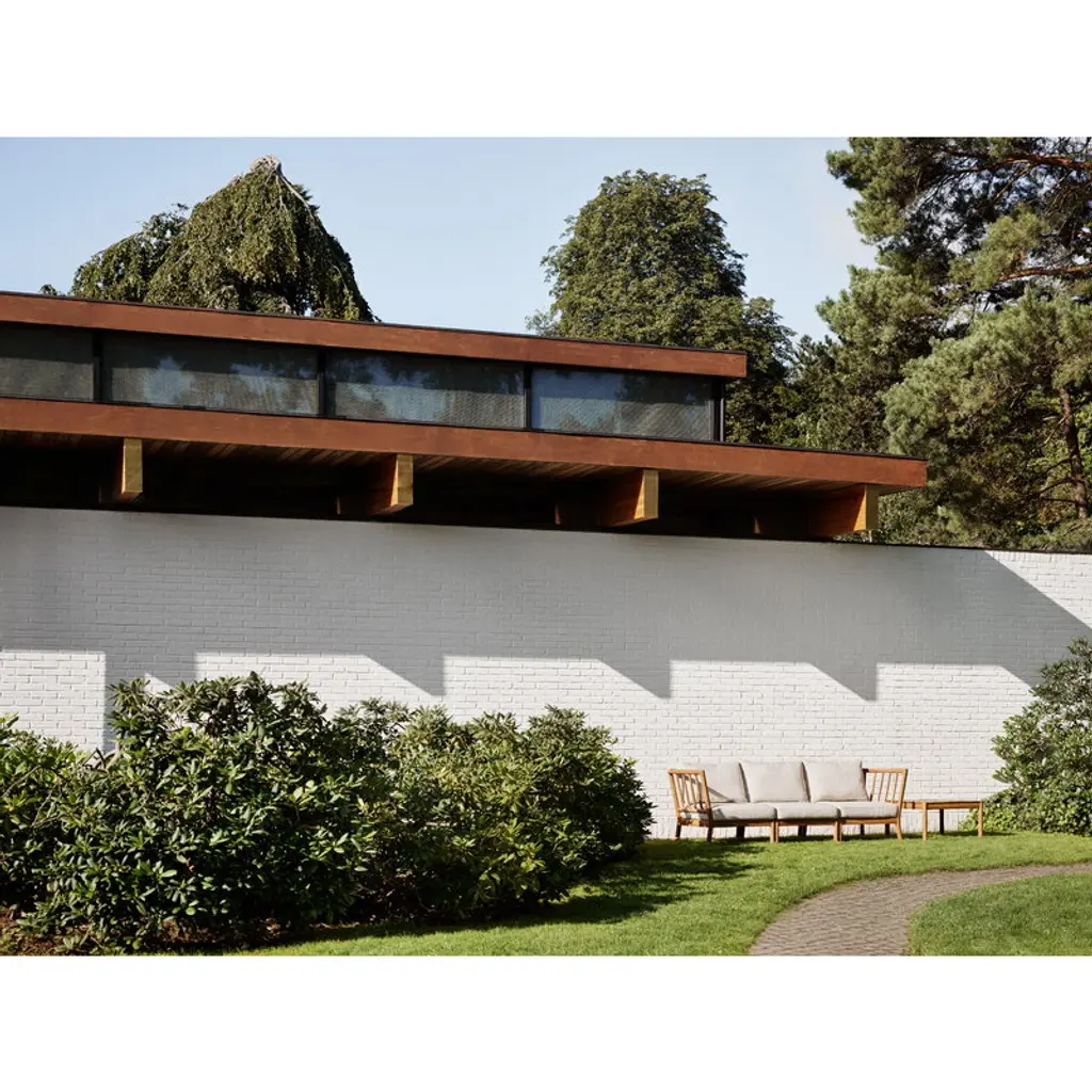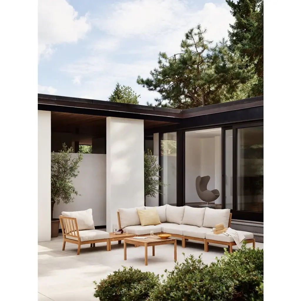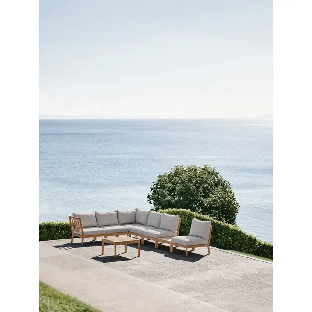 Skagerak's Tradition lounge table is part of a teak wood outdoor collection that combines classic esthetics with a modular structure, making it easily customisable and thus suitable for spaces of various sizes. Adorned with natural wood grains, this coffee table features a sturdy teak plank top with small gaps that allow summer rain to swiftly pass through. Complete your inviting summer oasis with other pieces from the Tradition series. The Tradition patio furniture was created by Danish designer Povl B. Eskildsen. Having grown up with one foot in a teak furniture factory, Eskildsen's extensive experience with teak is evident in the furniture's skilful details and serene simplicity, which leaves room for the wood's natural beauty. You can preserve the teak's original warm tone by regularly oiling the surface or allow it to slowly patina to an attractive gray shade.