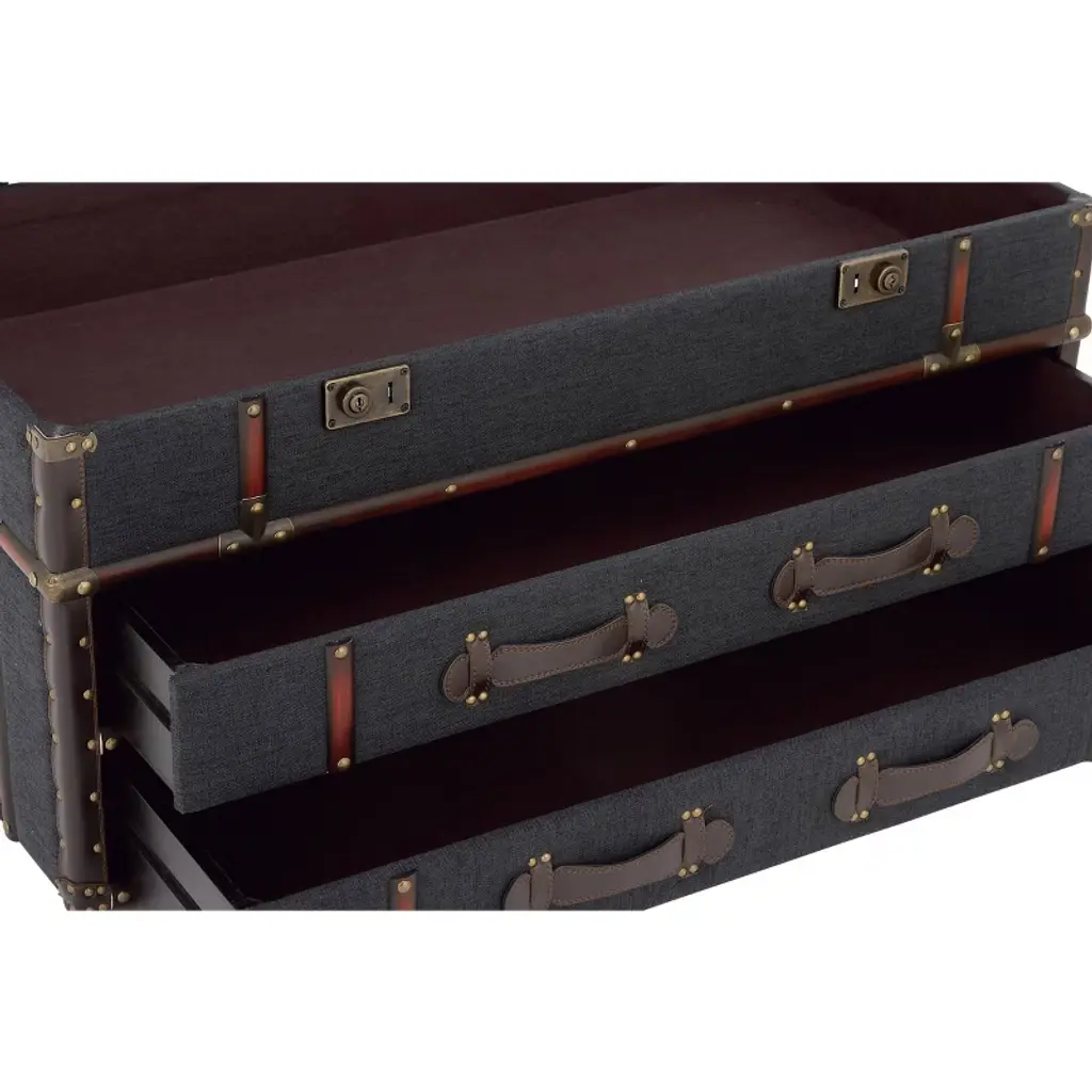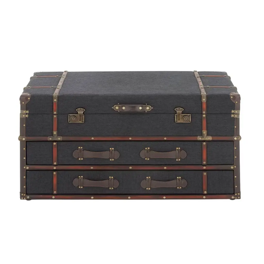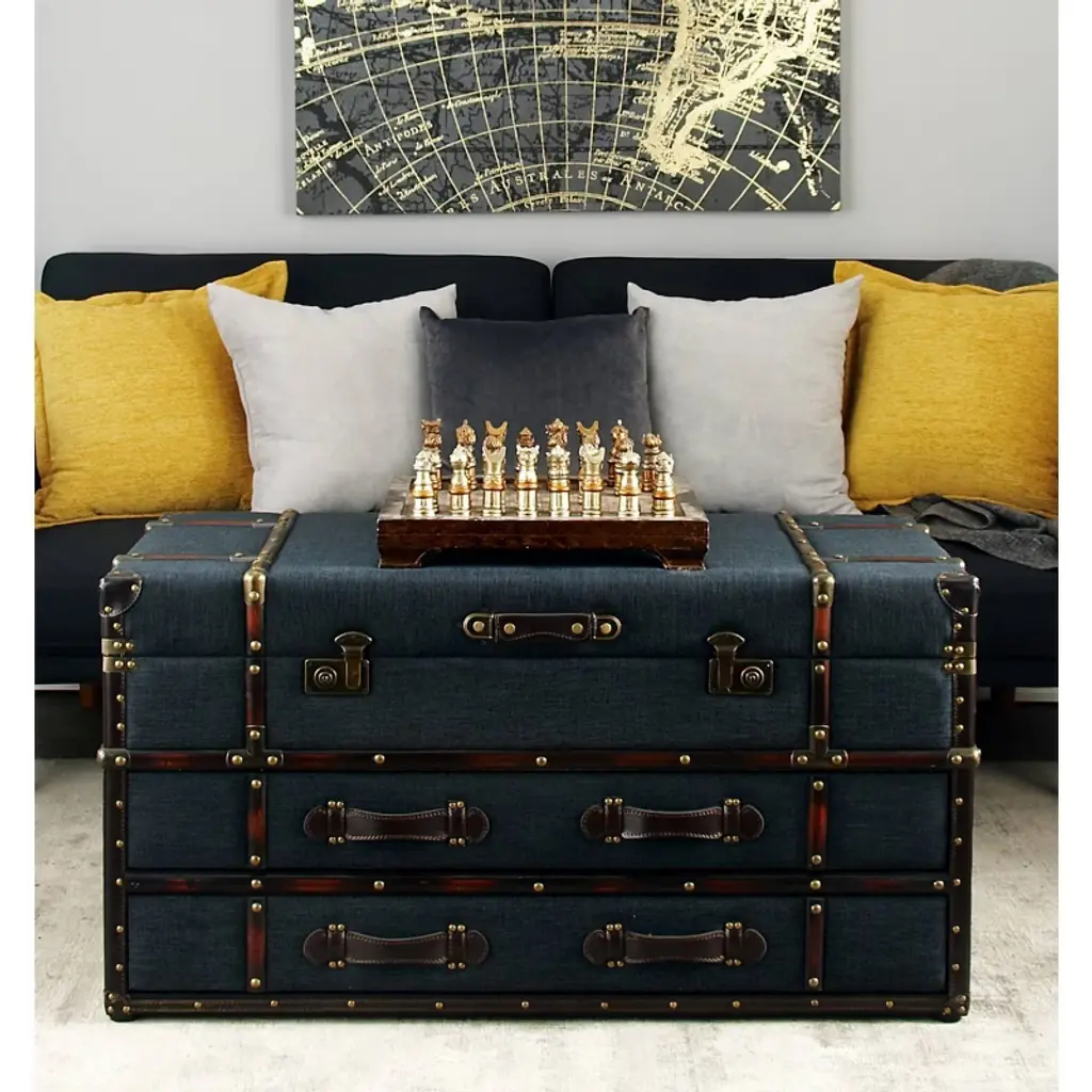 A spacious table top with a unique design offers an eye catching display from every angle. Useful and elegant, coffee tables are more than just a pretty piece of furniture in front of your couch. Storage trunk inspired cabinet with drawers will complement dark leather sofa with other heirloom decor for the perfect antique design style. This item ships in 1 carton. Dark blue coffee table features 2 drawers with 25 lbs weight limit. This trunk does not need a key. To open, push the two keyholes in opposite directions, at the same time. . Suitable for indoor use only. This item ships fully assembled in one piece. Maximum weight limit is 100 lbs. This is a single dark blue colored living room table. Traditional style.