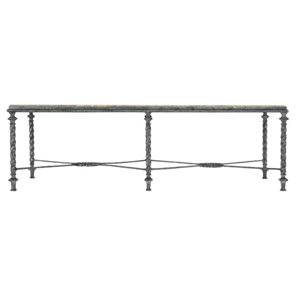 Create a comfortable and inviting atmosphere of retreat for your family room with the Traditions Rectangle Cocktail Table, combining a stone veneer top with a verdigris metal base featuring twisted legs and a stretcher.