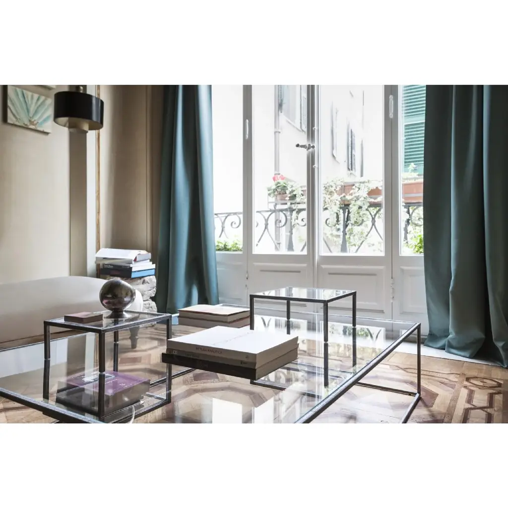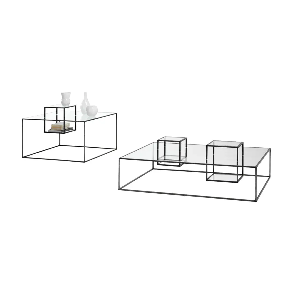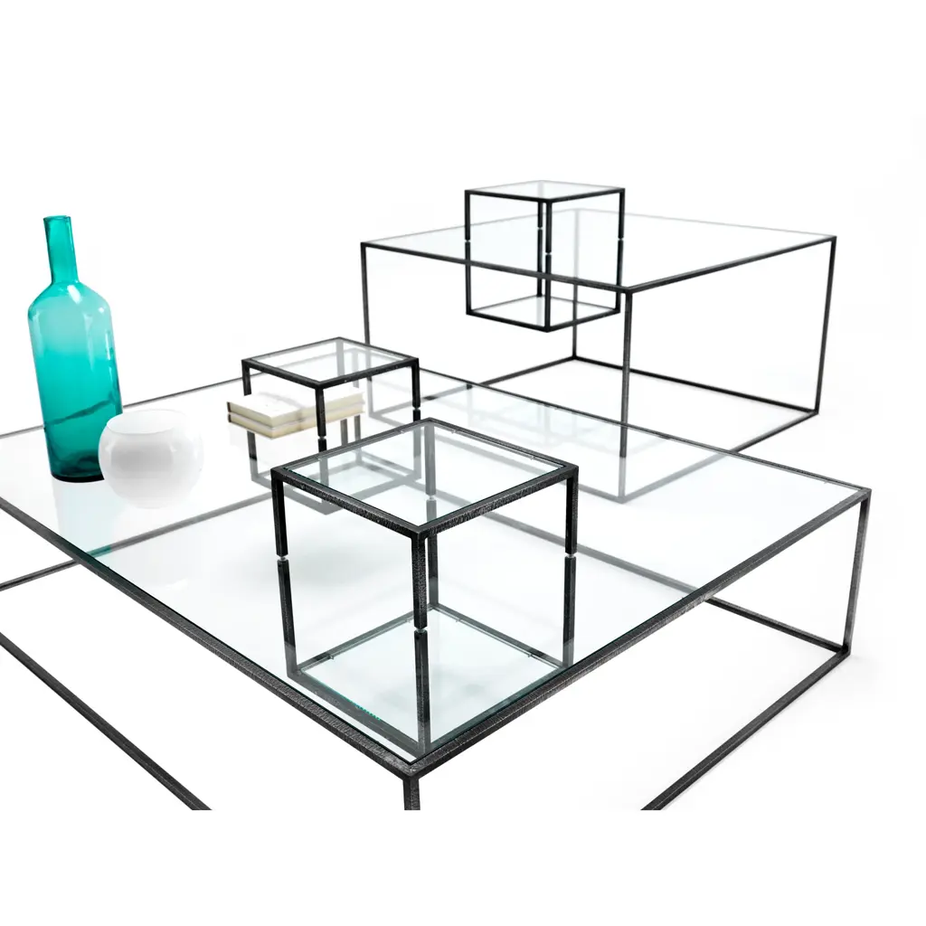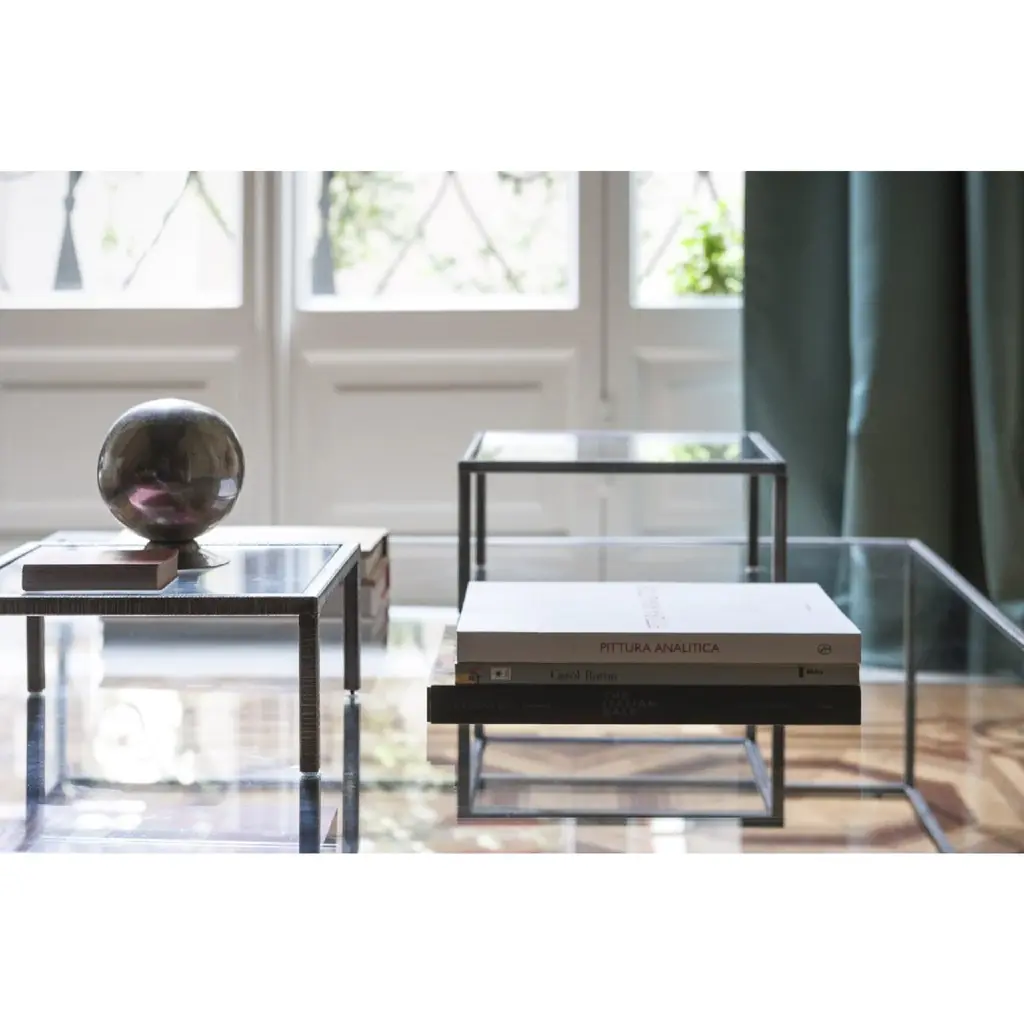 Introducing Illusioni, the coffee table that defies gravity. This luxurious piece features a black iron structure with transparent crystal tops, giving it a weightless appearance. The slender design adds an air of sophistication and exclusivity to any space. Elevate your home with Illusioni's illusionary beauty.