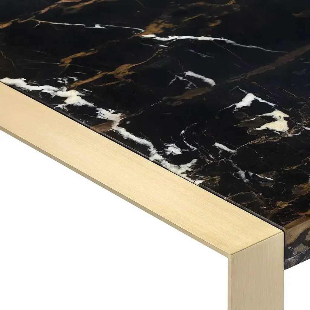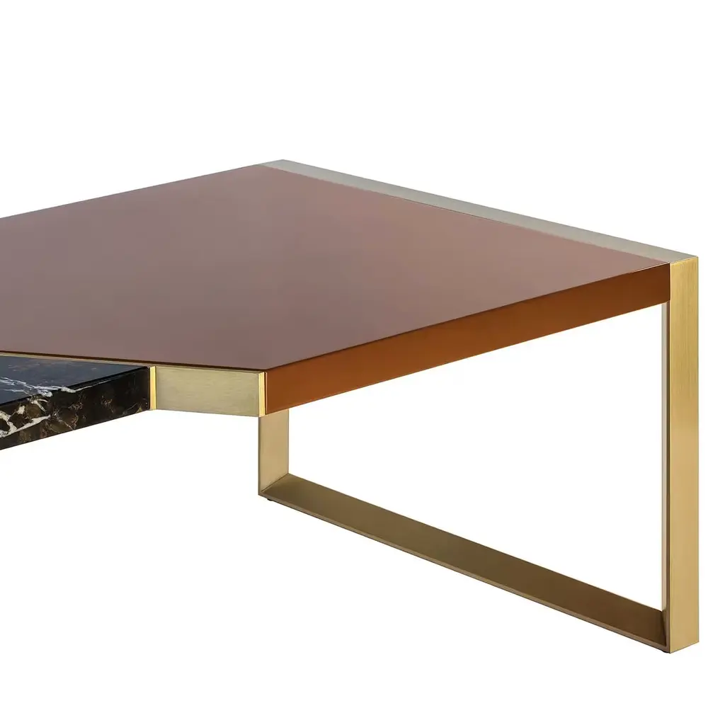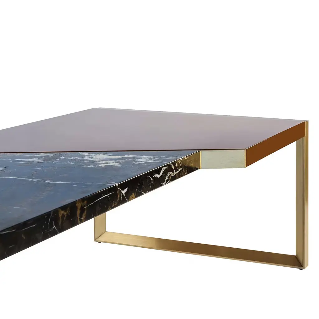Defined by an elegant integration of wood and marble, this sophisticated coffee table boasts a timeless quality that will elevate the style of any interior. Part of the Intersections Collection, this piece boasts an irregular rectangular form with a diagonal cut that disrupts the silhouette to reveal two parallel panels, one in black and gold marble and the other in lacquered wood. The piece's harmonious and straightforward aesthetic is accentuated by a pair of brass, U-shaped table legs, whose continuous design offers stability and visual balance.