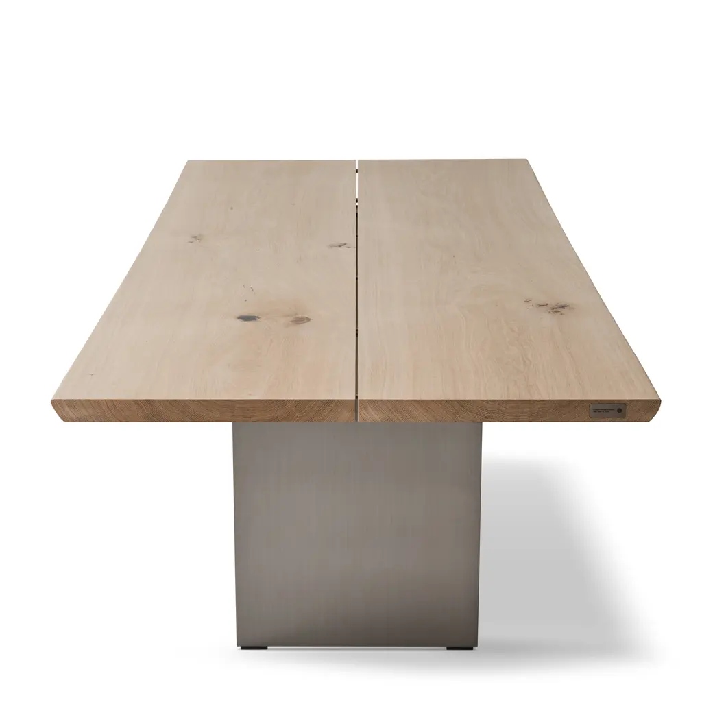 Perfectly balanced and elegantly simple, the Tree Coffee Table highlights the beauty of natural wood. Designed by Jacob Plejdrup for Danish furniture brand dk3, the table blends traditional craftsmanship and modern engineering in a stylish design. The simple steel base supports two wooden planks that make up the table’s top. Left natural and un-painted, the top boasts grain textures and organic lines. Since every table is one-of-a-kind, the surface can also feature small cracks and knots that give the design a rustic character. Smooth and angled, the edges feature a hand-sanded surface. Tree Coffee Table is an ideal choice to bring a touch of Nordic style and natural warmth into a contemporary interior.