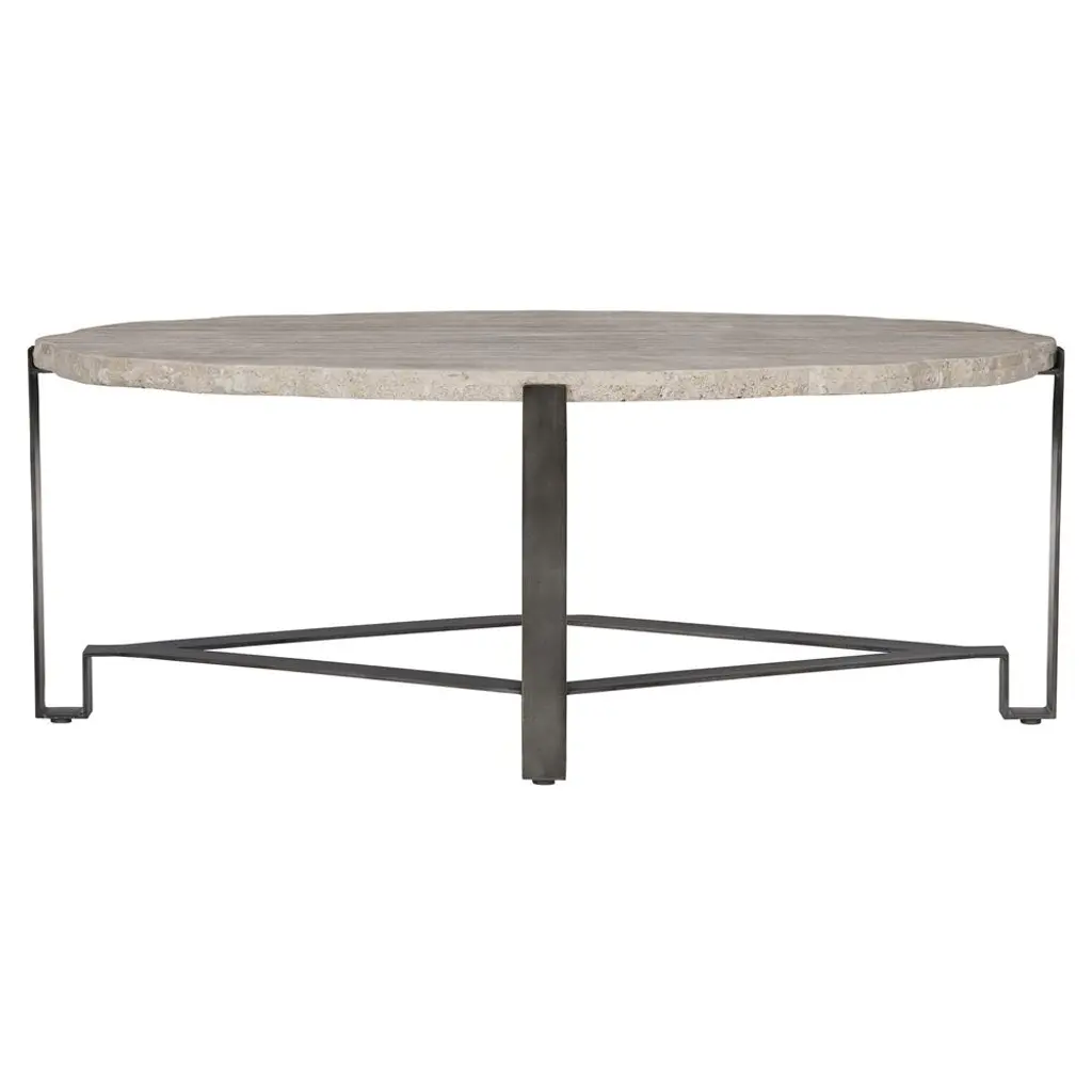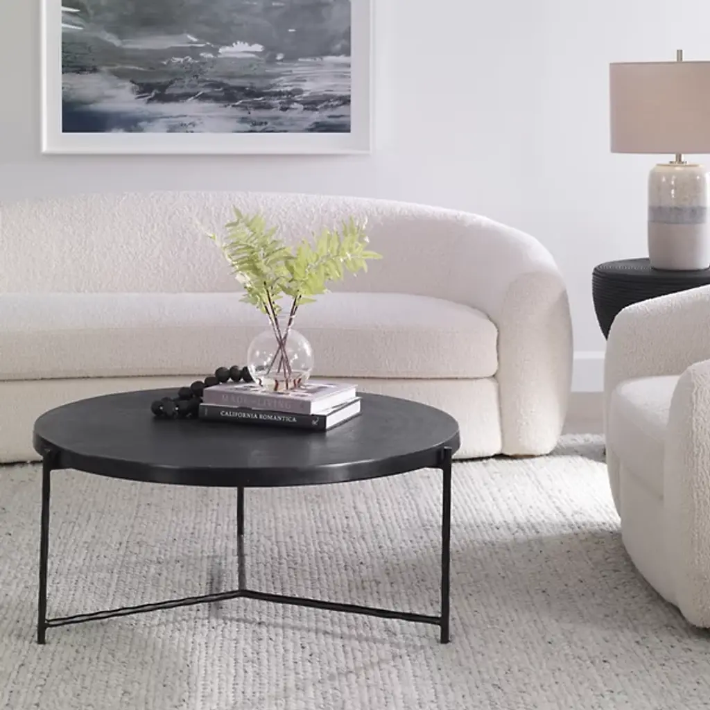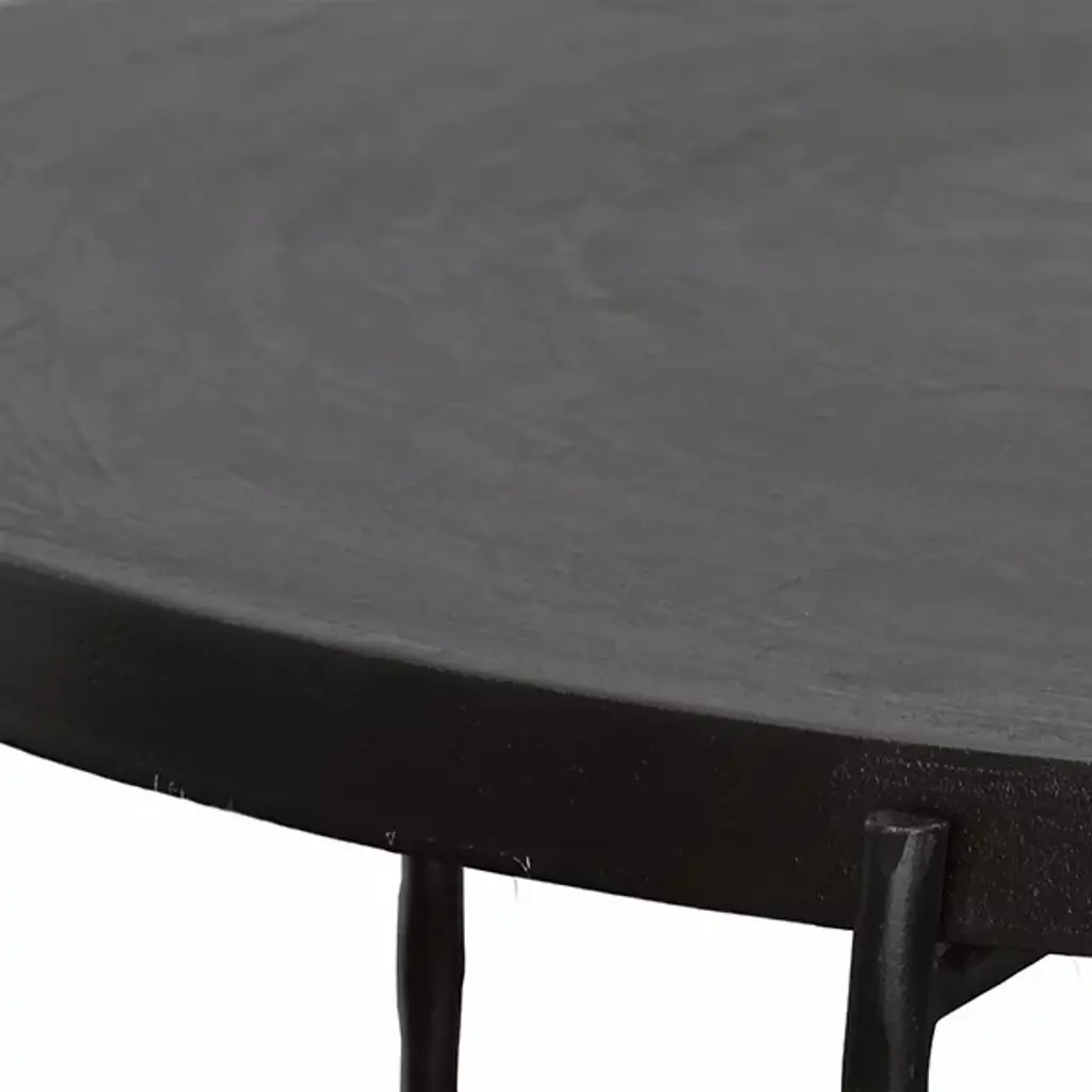 The Trellick Coffee Table from Uttermost is rich with contemporary elegance and showcases modern textures and artisanal details. Its cast aluminum top creates a contrast against the three-legged chiseled black iron frame, adding depth and character to the design. This fusion of materials and textures matches smooth contemporary style with artisanal flair, making the table stand out in any living space. With its refined lines and sophisticated look, this table enhances the ambiance and functionality of modern interiors.