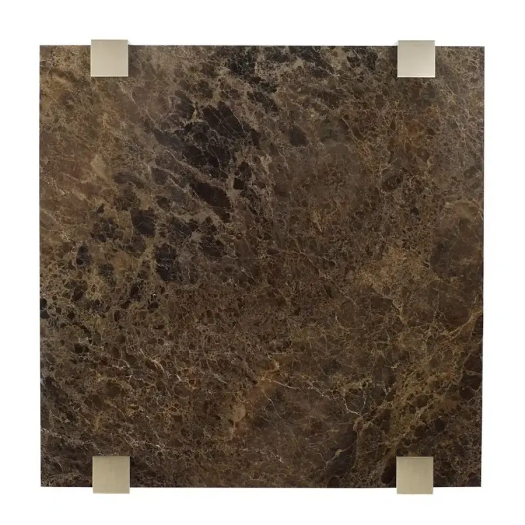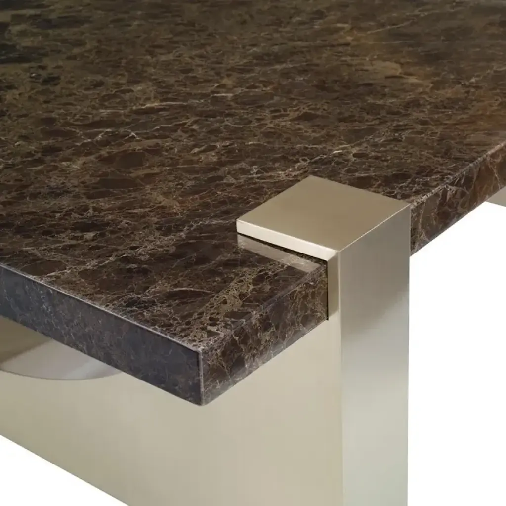 This large cocktail table features a dark Emperador marble top with brass finished metal sled base legs. Arching cutouts in the base give this table and architectural feel.