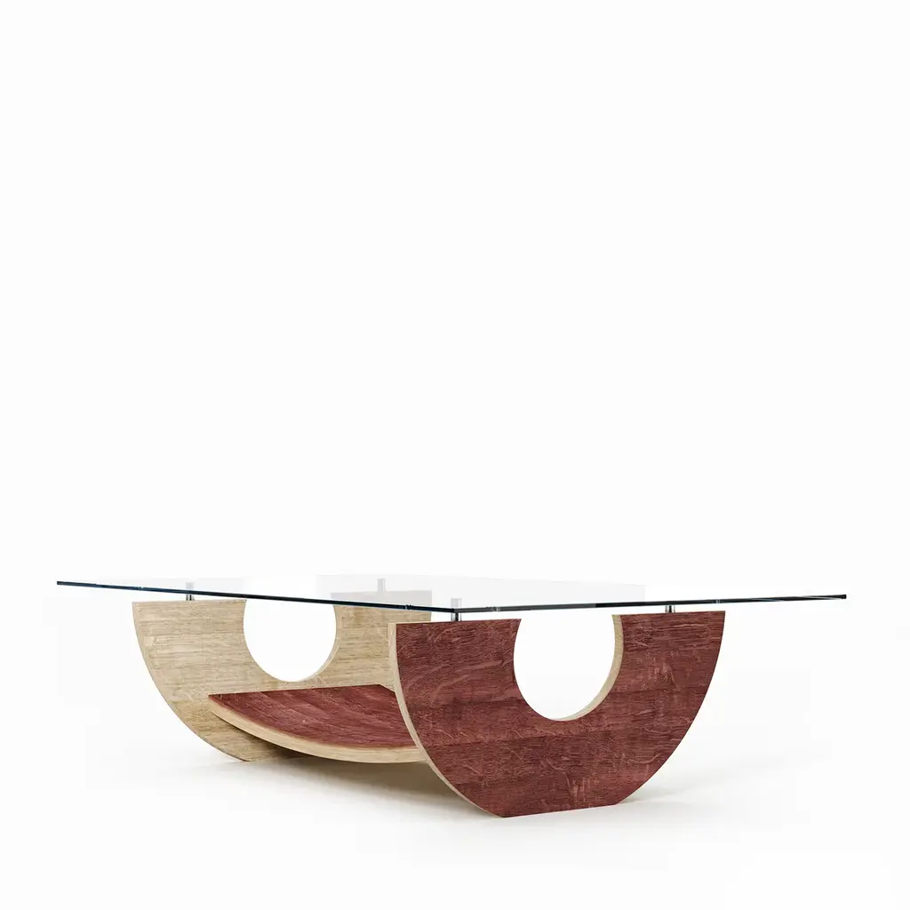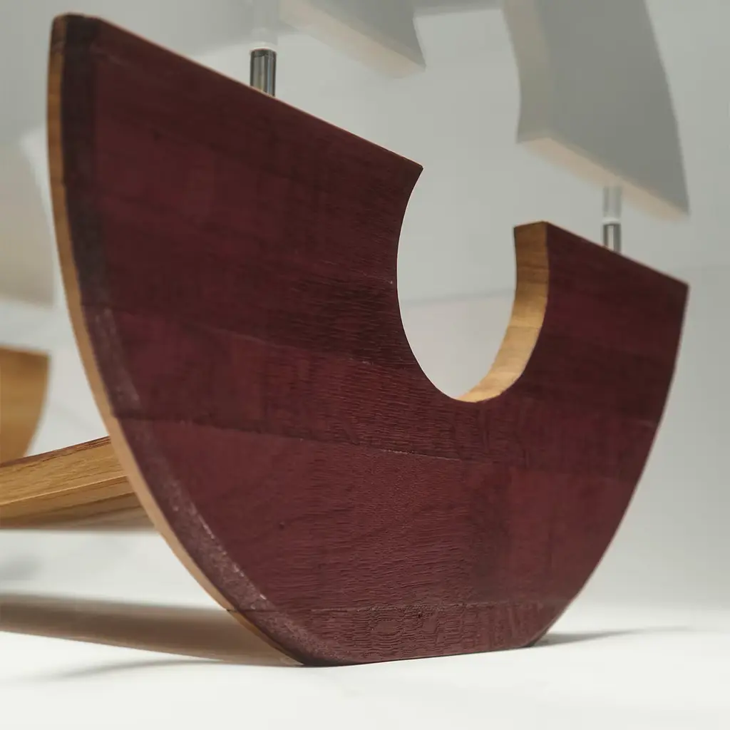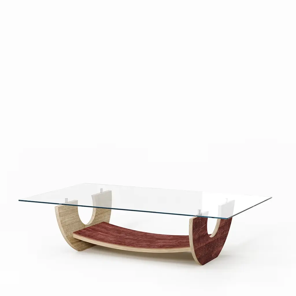 The semi-circular legs of Trevi, crafted from reclaimed wine barrel lids, seamlessly meld with the concave structure of the staves, unabashedly unveiling the hidden splendors of wine aging on oak while providing sturdy support for the glass top. The unique allure of Trevi defies predetermined definition, as its colors and marks evolve organically through the natural interplay between oak and wine.