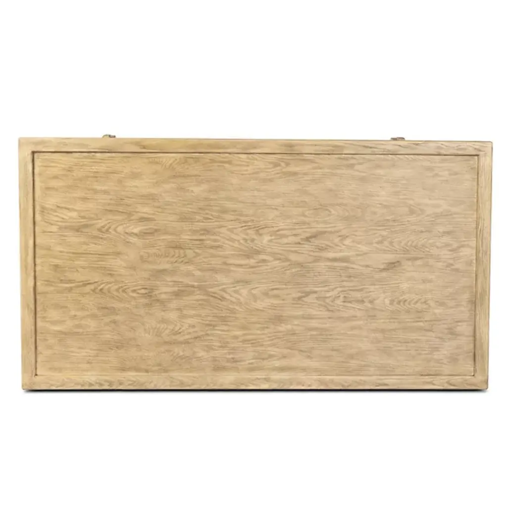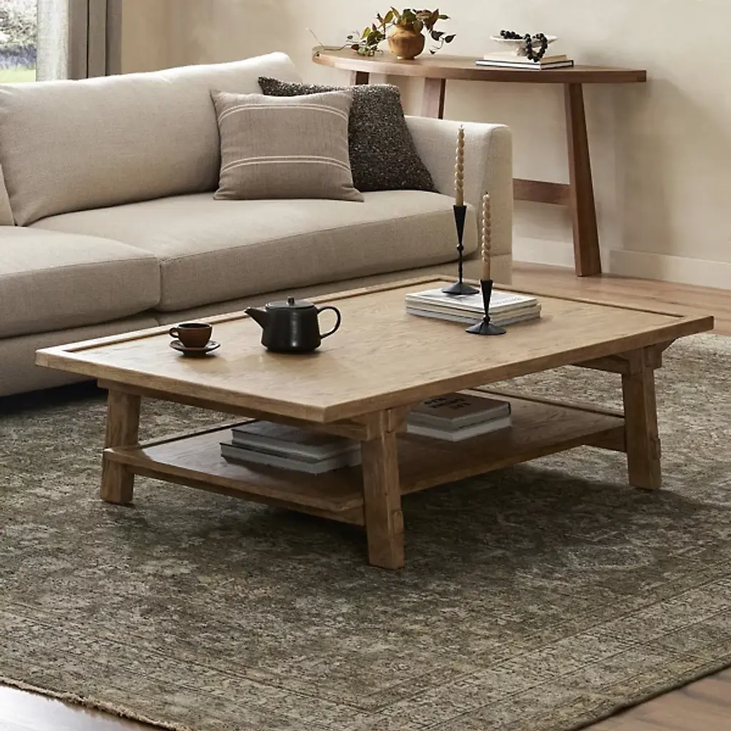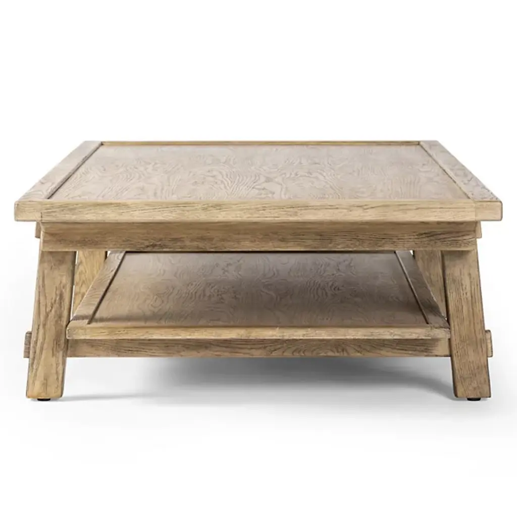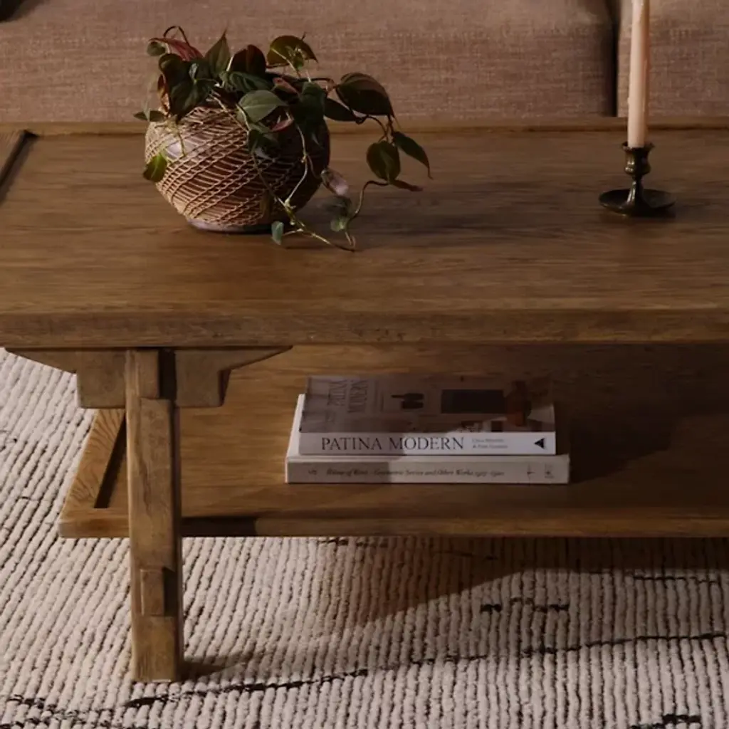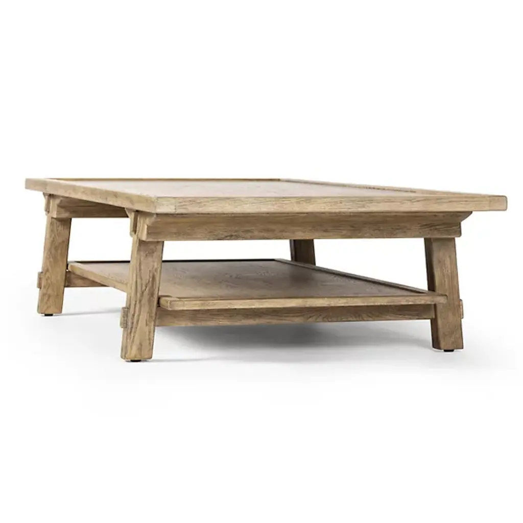 The Trinity Coffee Table from Four Hands features an Asian-inspired design. Crafted from light, distressed oak, it showcases traditional mortise-and-tenon joinery that securely connects the protruding stretchers to the sturdy legs. The piece also includes lower shelving, offering additional storage and display space. This thoughtful blend of craftsmanship and functionality enhances the table's durability and adds a touch of timeless elegance to any space, making it a perfect addition to your home.