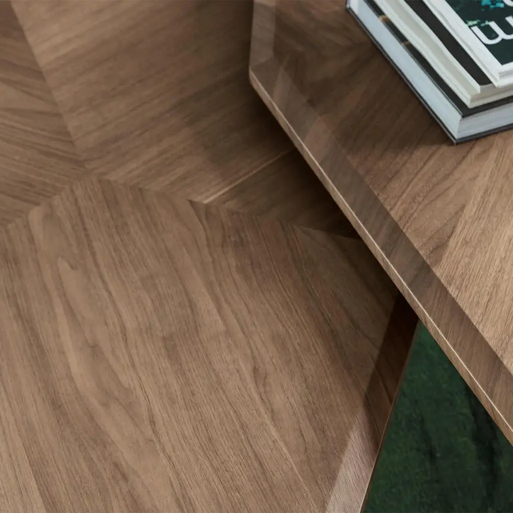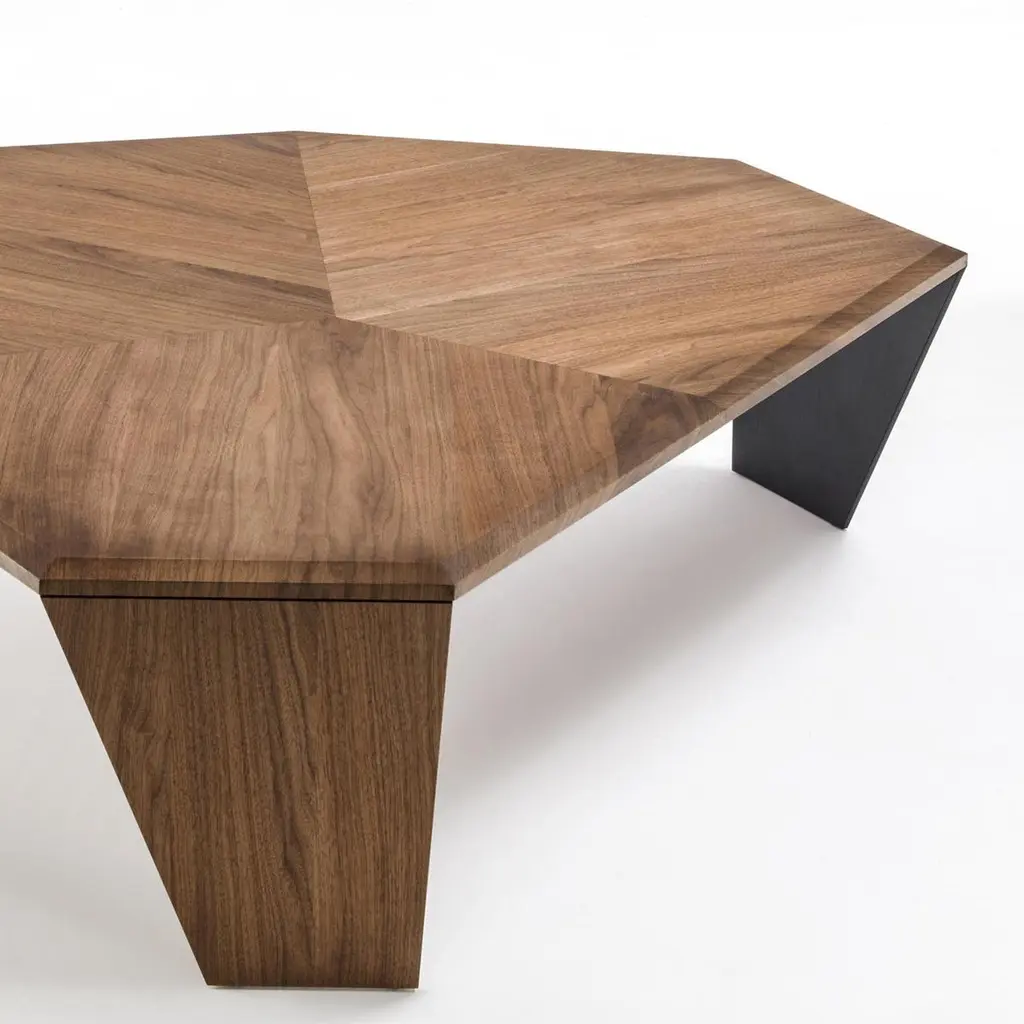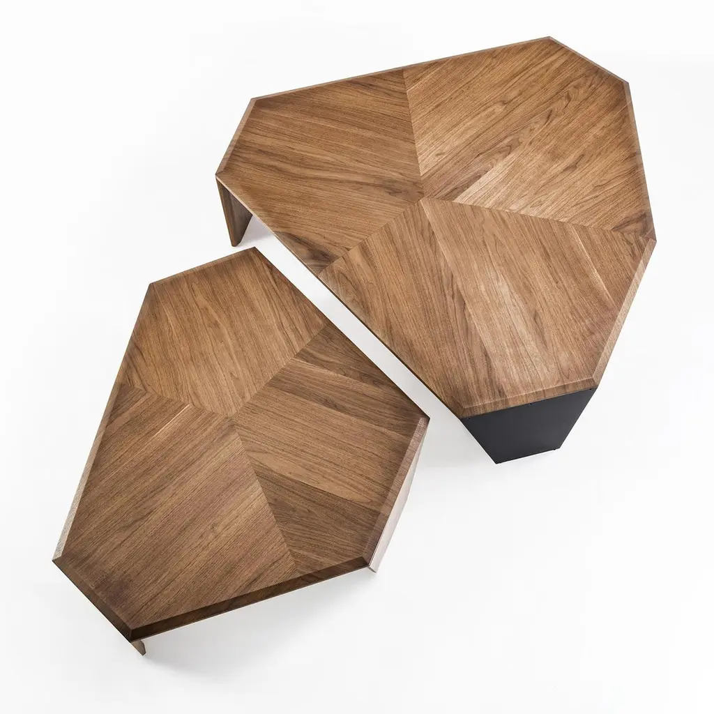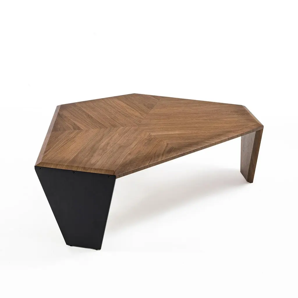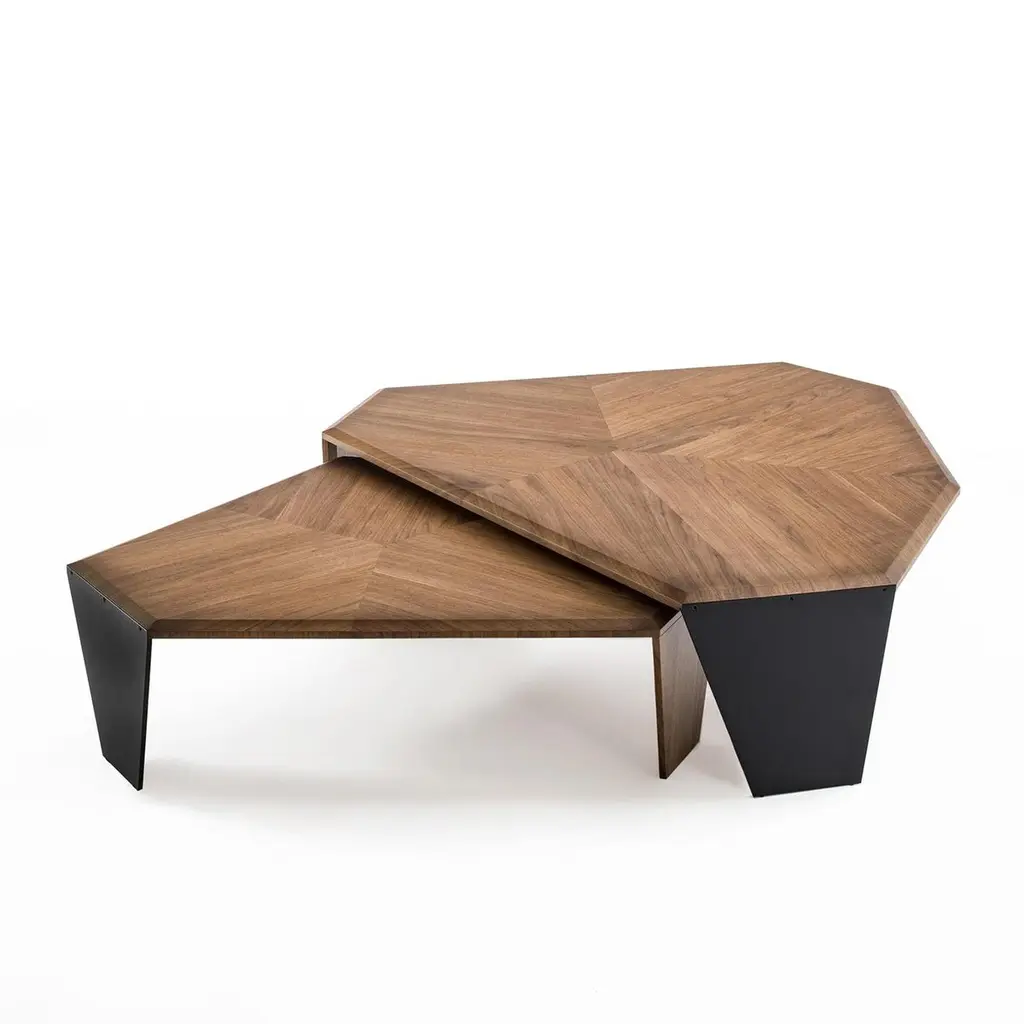 Coffee table triple walnut set of 2 tables all insolid walnut wood with inlayed veneer and withtwo legs in solid walnut and one in black matt metal.Measures: A/ L 147 x D 134 x H 41cm, price: 8400,00€.B/ L 108 x D 102 x H 35.5cm, price: 7400,00€.Set of 2 with A/ + B/, price: 15800,00€.Also available per unit A/ or B/.