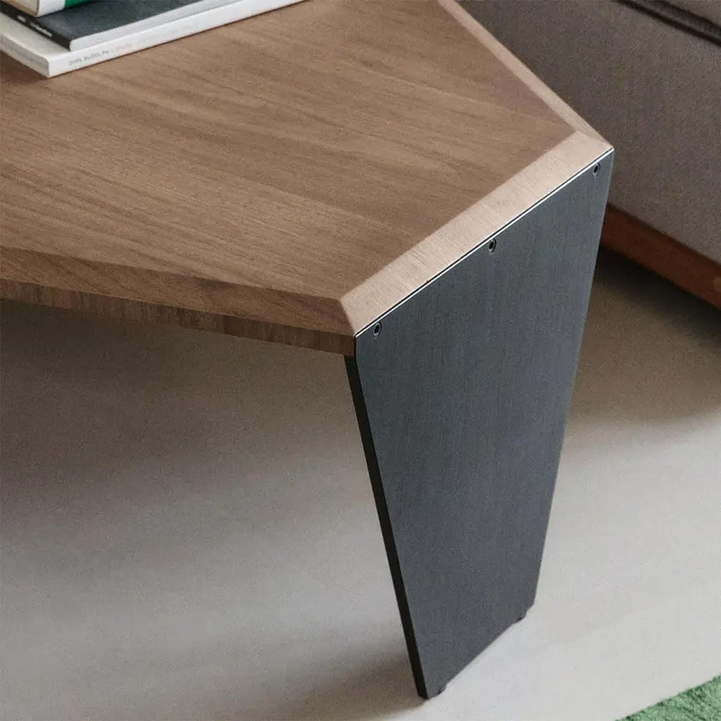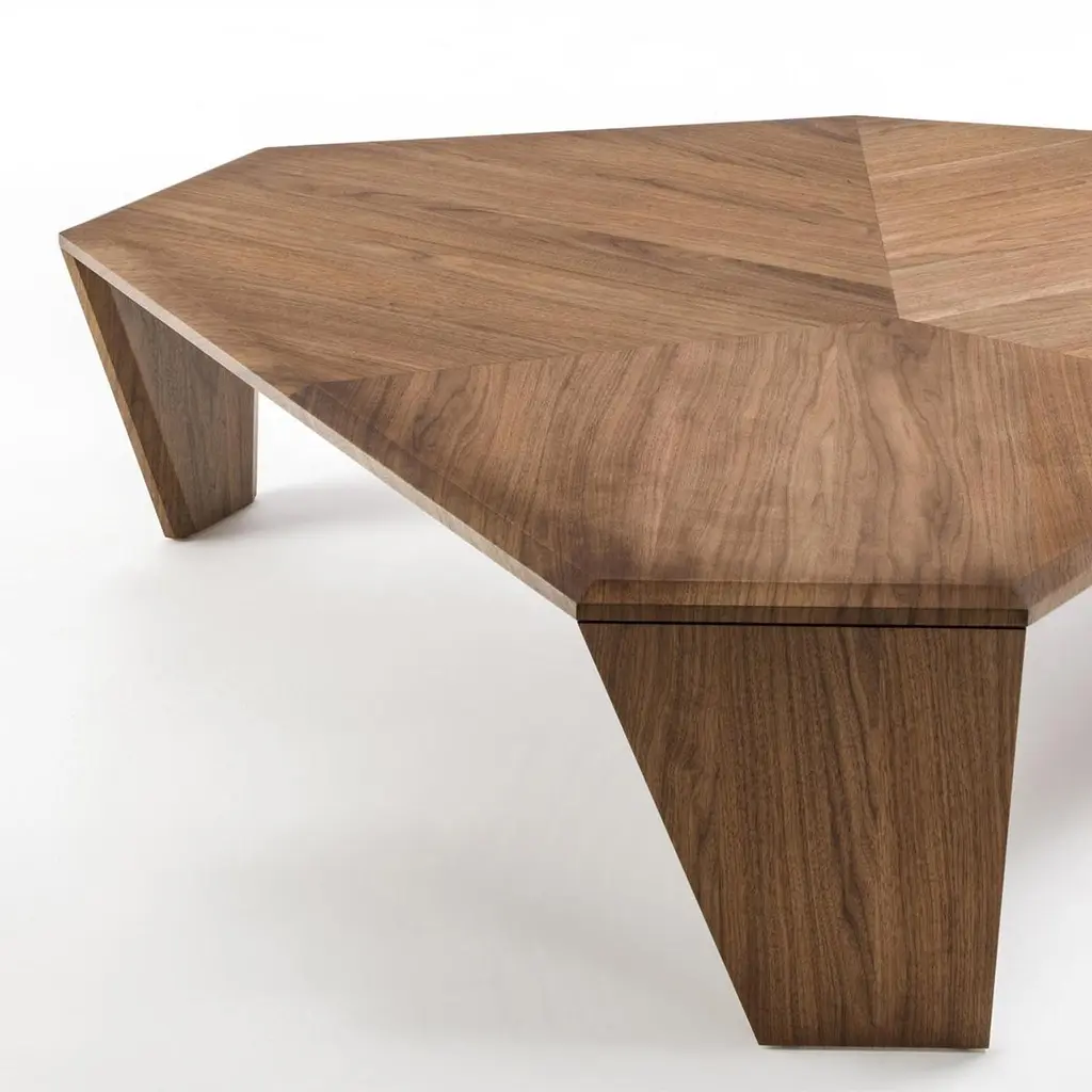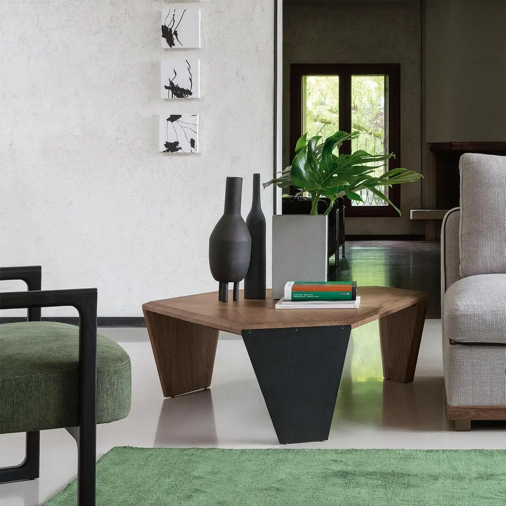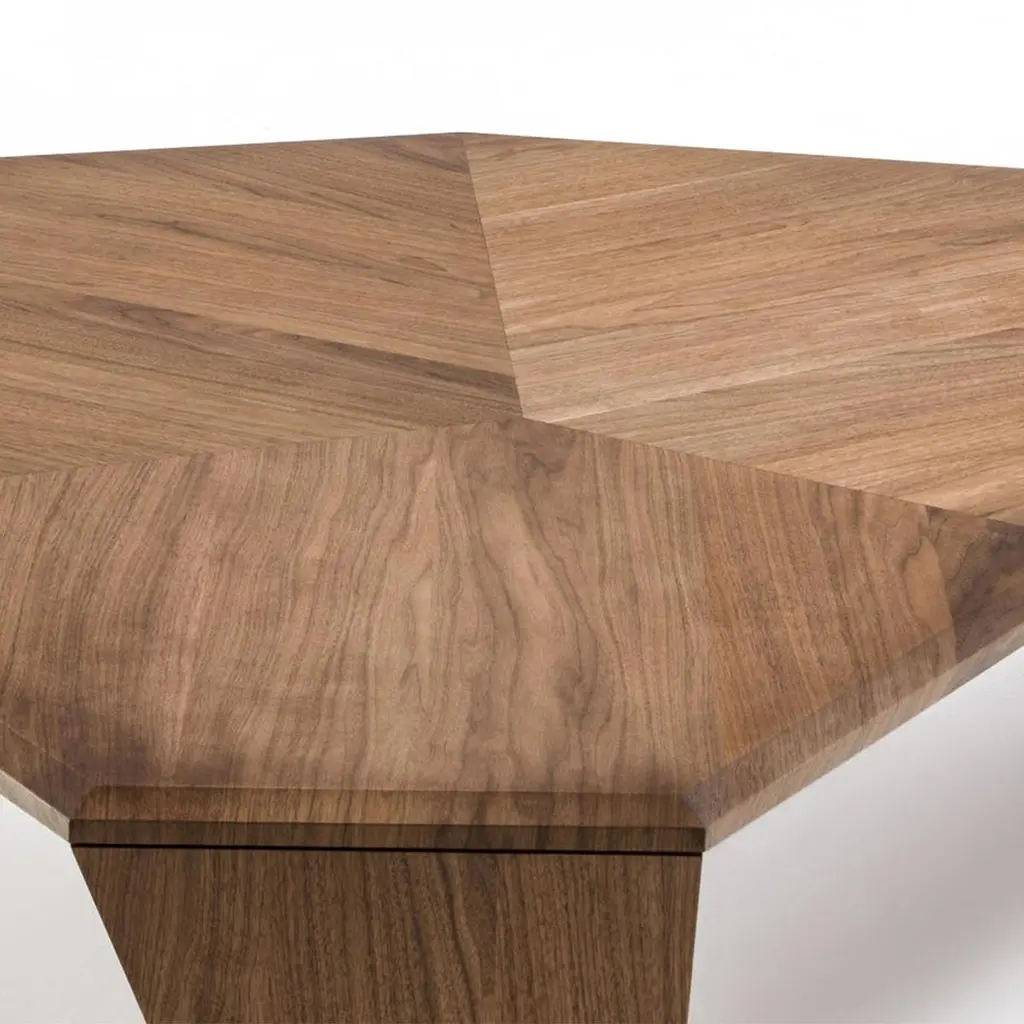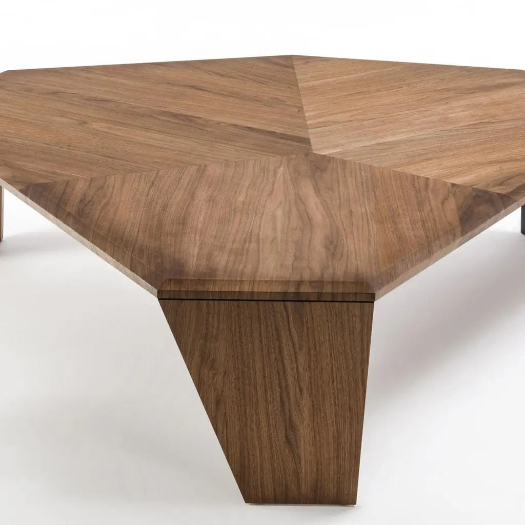 Coffee table triple walnut set of 2 tables all insolid walnut wood with inlayed veneer and withtwo legs in solid walnut and one in black matt metal.Measures: A/ L 147 x D 134 x H 41cm, price: 8400,00€.B/ L 108 x D 102 x H 35.5cm, price: 7400,00€.Set of 2 with A/ + B/, price: 15800,00€.Also available per unit A/ or B/.