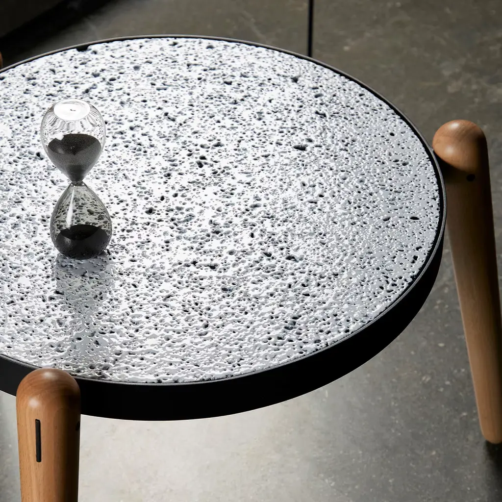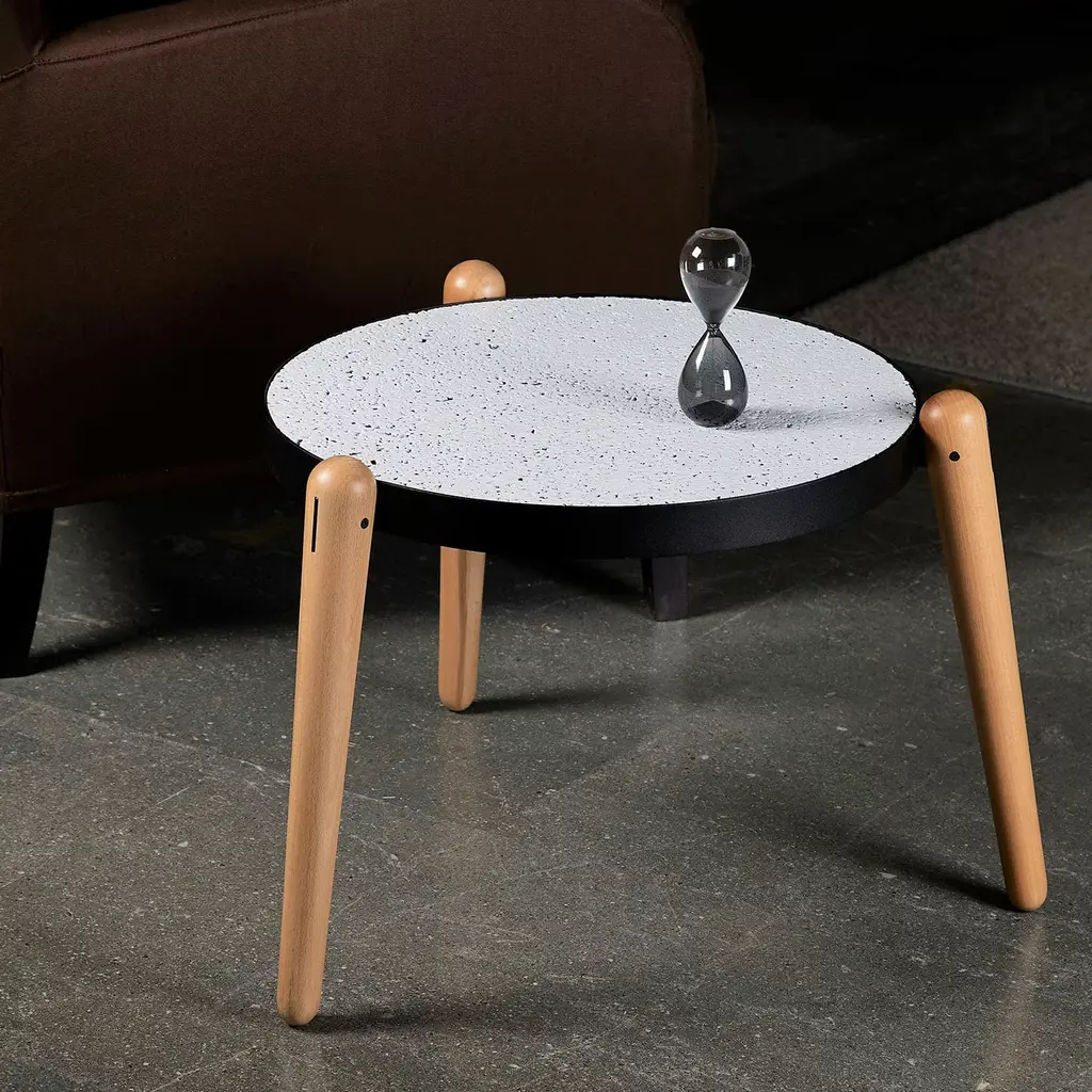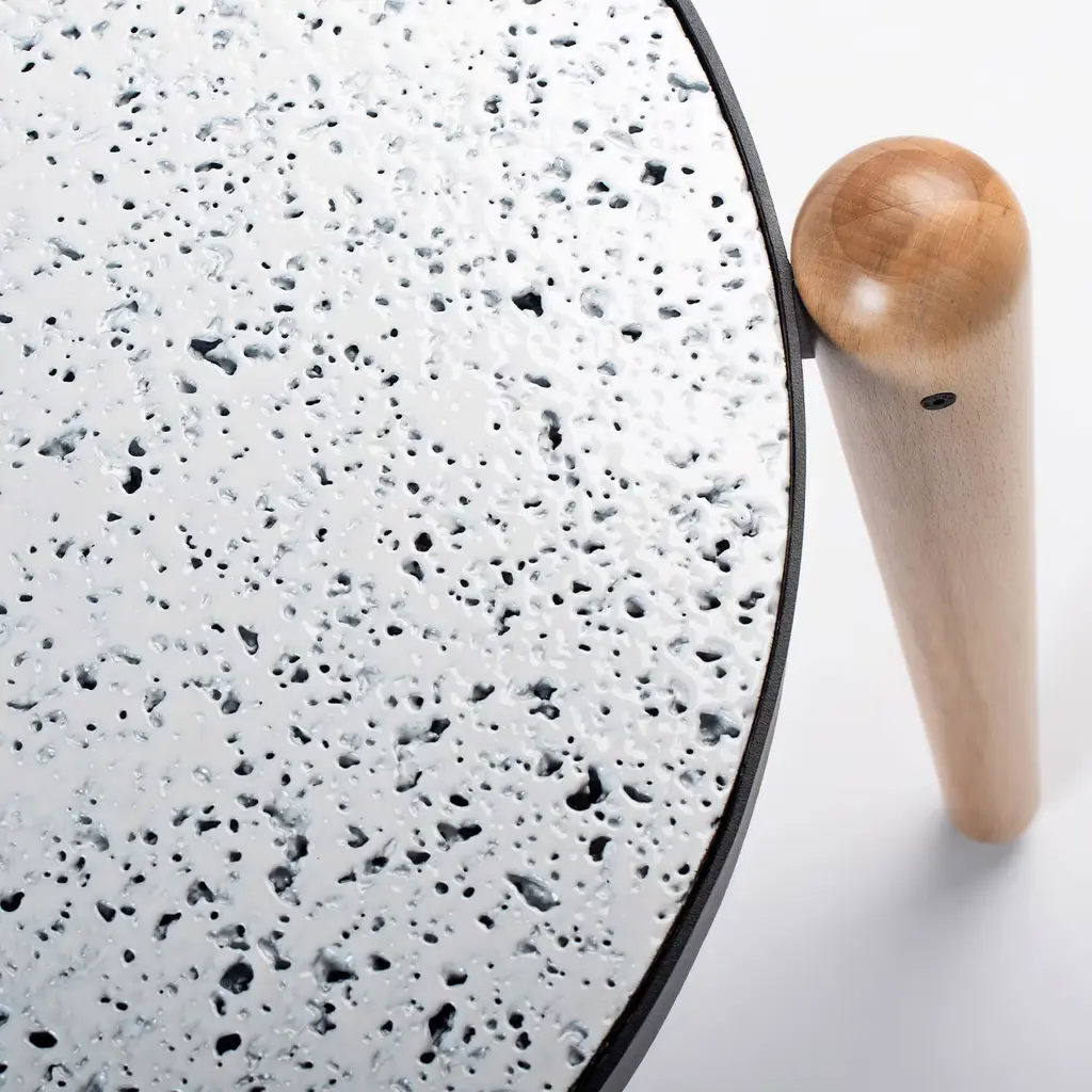 Clean lines, inspired by contemporary designs Sicilian artisans conceive, define the modern frame of this circular coffee table. It stands out for its precious top in light "Perciata" stone - its signature holey texture resulting from erosion - finished with glossy white glaze and set in a powder-varnished iron ring. Masterfully turned beech legs complete the design.