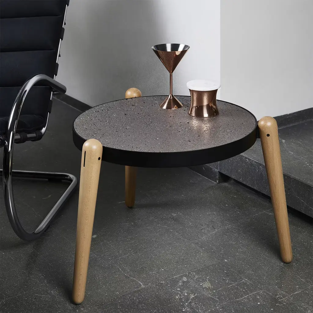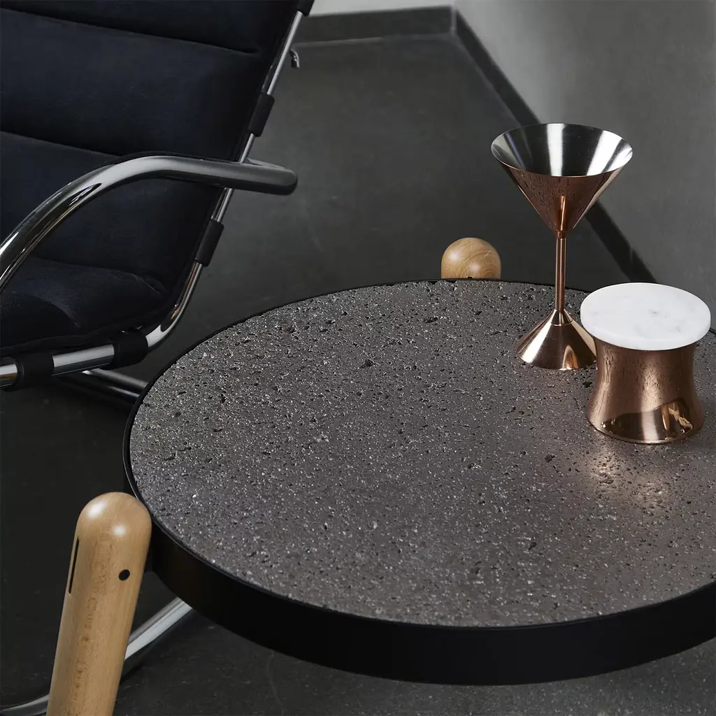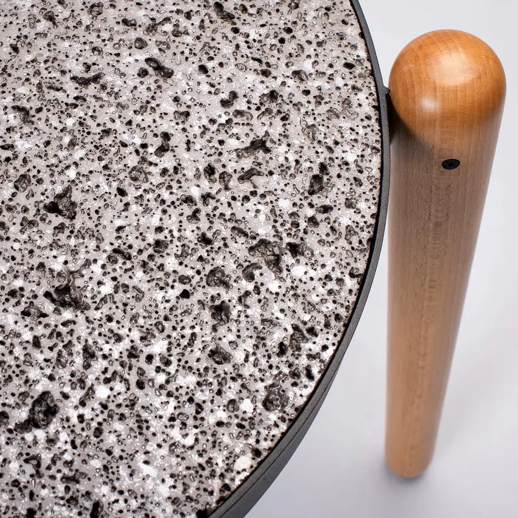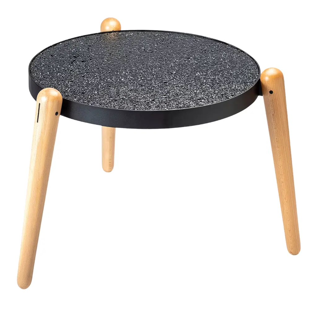The effortless charm of contemporary designs Sicilian artisans craft with reclaimed materials inspired Luca Maci the minimalist design of this round coffee table. Turned beech feet comprise the tripod base to which a powder-varnished iron ring is fitted for welcoming the thick top in black-finished Perciata stone - stone offering a superb tactile experience with its natural holey look.