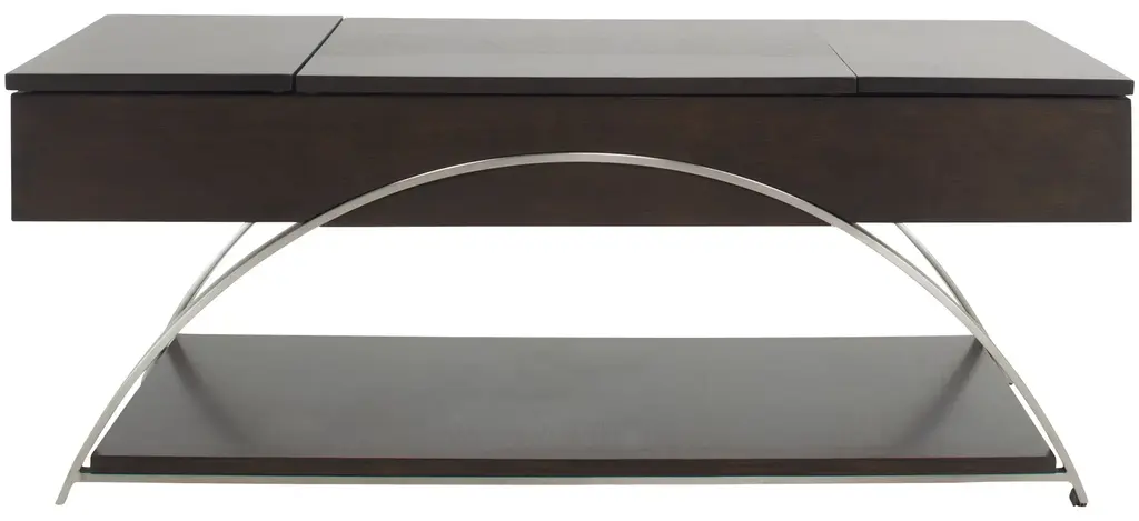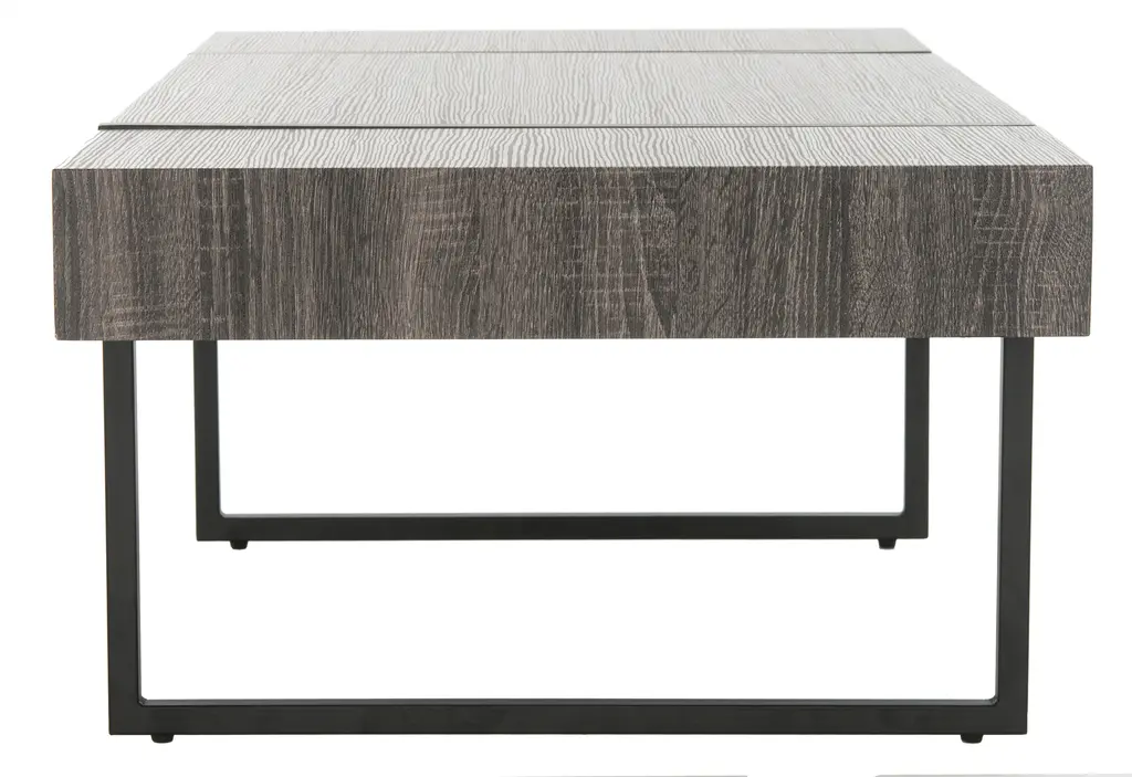A modern piece with rustic flair, this minimalist coffee table features a thick wooden top balanced by chic metal legs in a black finish.