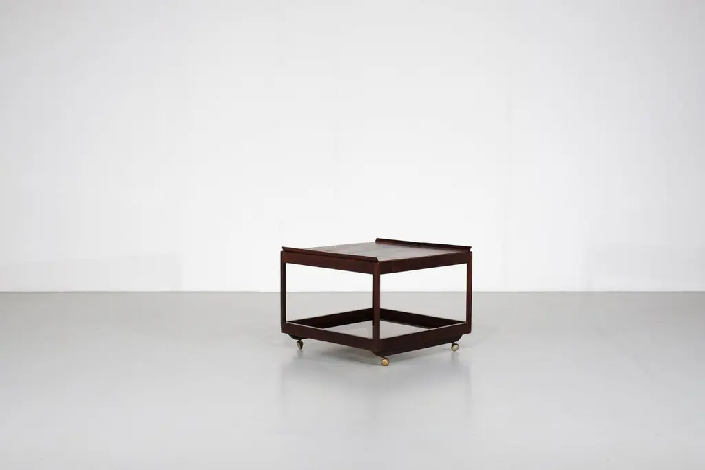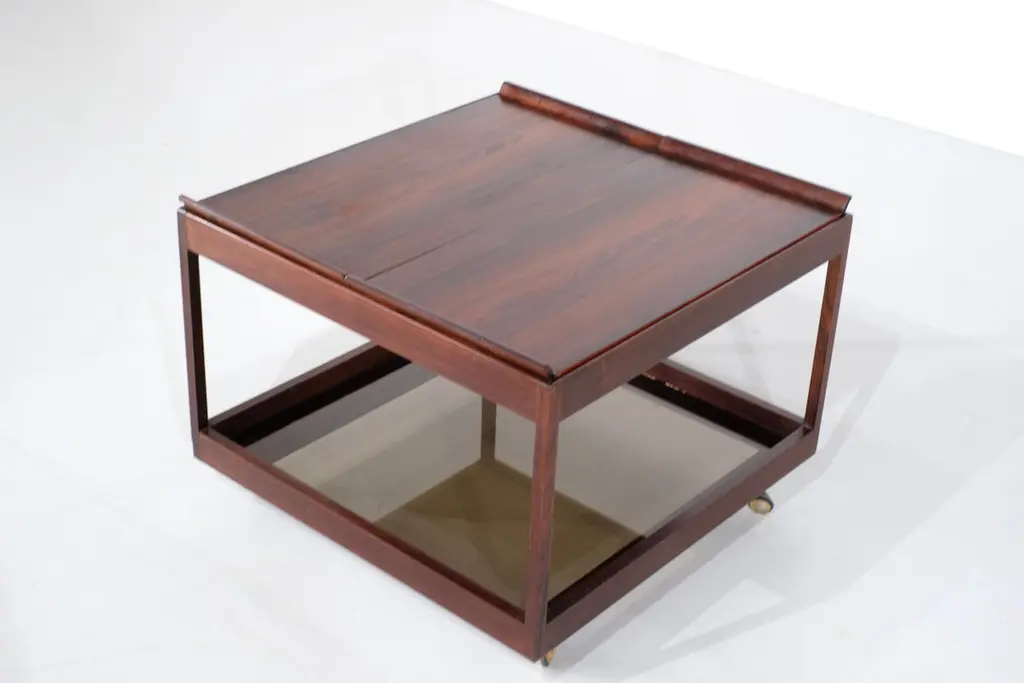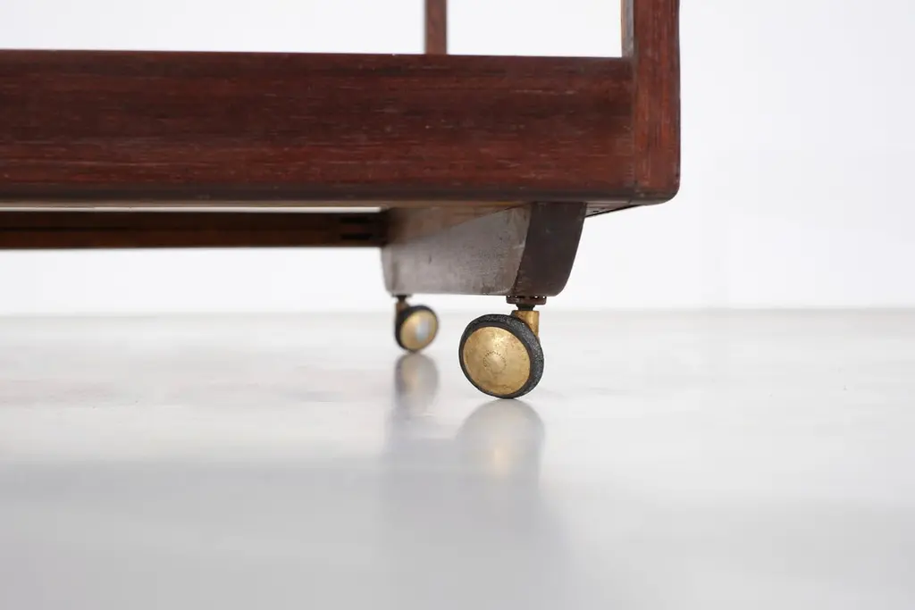 Small bar, cart, or coffee table designed by Martin Eisler for Forma in the 1960s.This magnificent serving trolley on wheels has two tiers.On the top tier, there are two removable wooden shelves. They can be completely removed if necessary.On the bottom tier, there is a glass top on which various items can be placed.A sleek and understated design on four brass casters that add a touch of sparkle to this bar.It is in very good condition and has no damage. Some signs of wear and tear are visible, but nothing that detracts from the charm of this magnificent bar.
