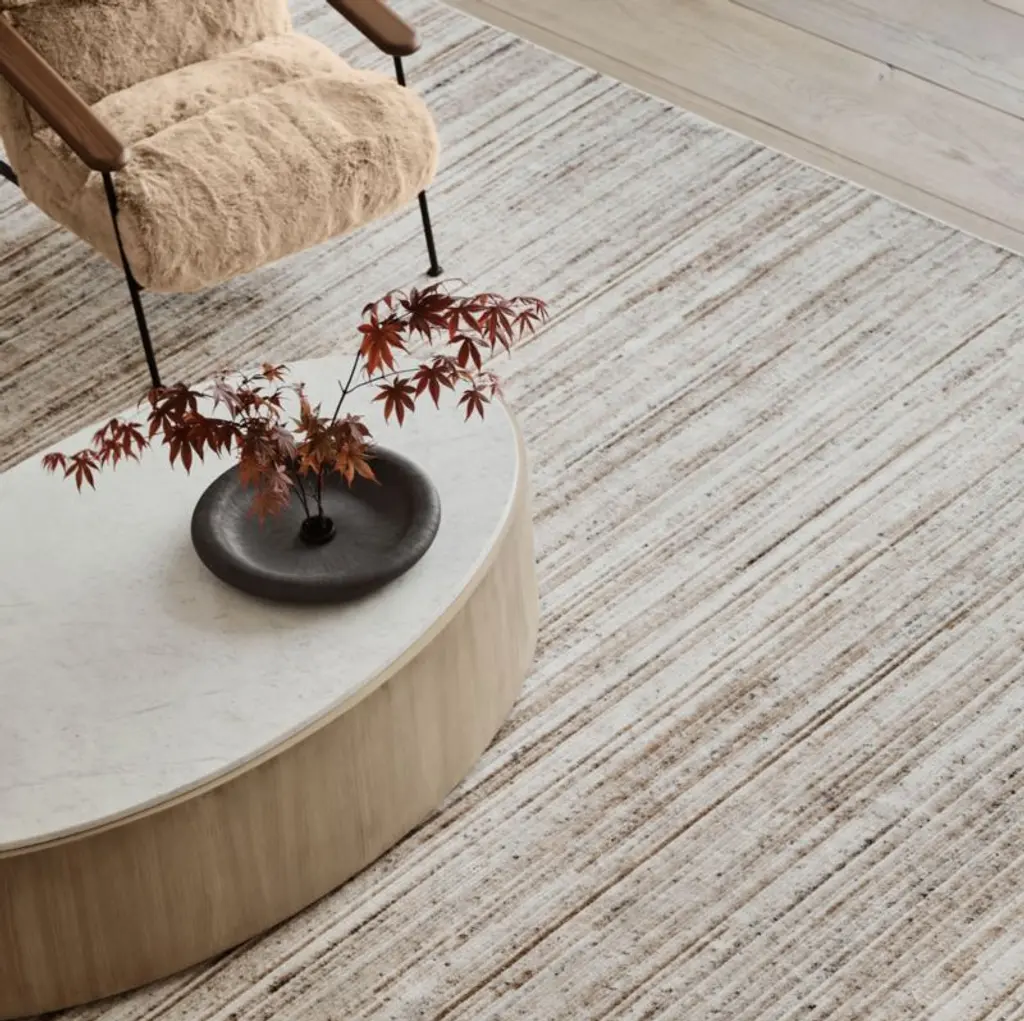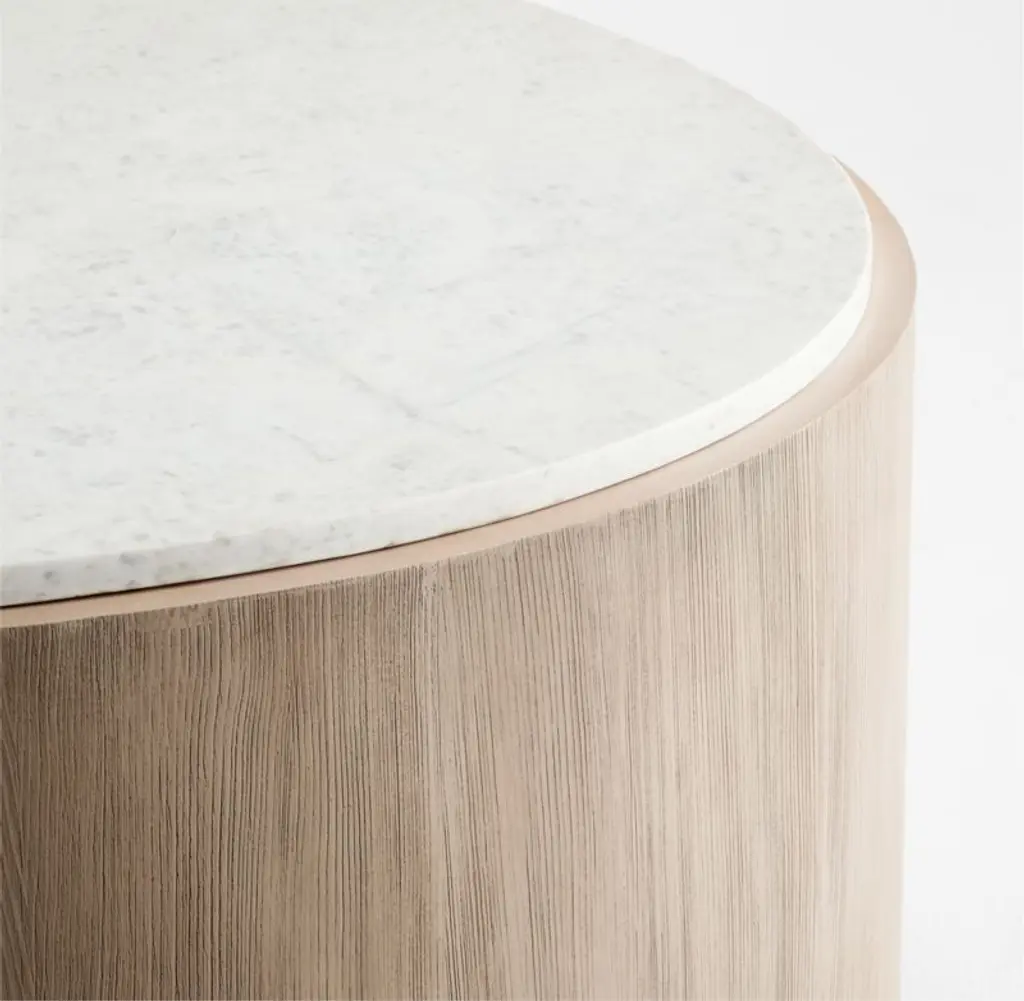 Troupe's deceptively simple design offers more than meets the eye. A continuous birds-beak joint traces the coffee table's perimeter, bringing dimension to its elliptical contour. Composed of quarter-sawn planks of pine veneer, the large oval table showcases dynamic graining that's enhanced with wirebrushing and glazed finish. A top of honed white Banswara marble pairs naturally with the wood's light, warm color, and a recessed plinth base lets our exclusive coffee table float in a room.