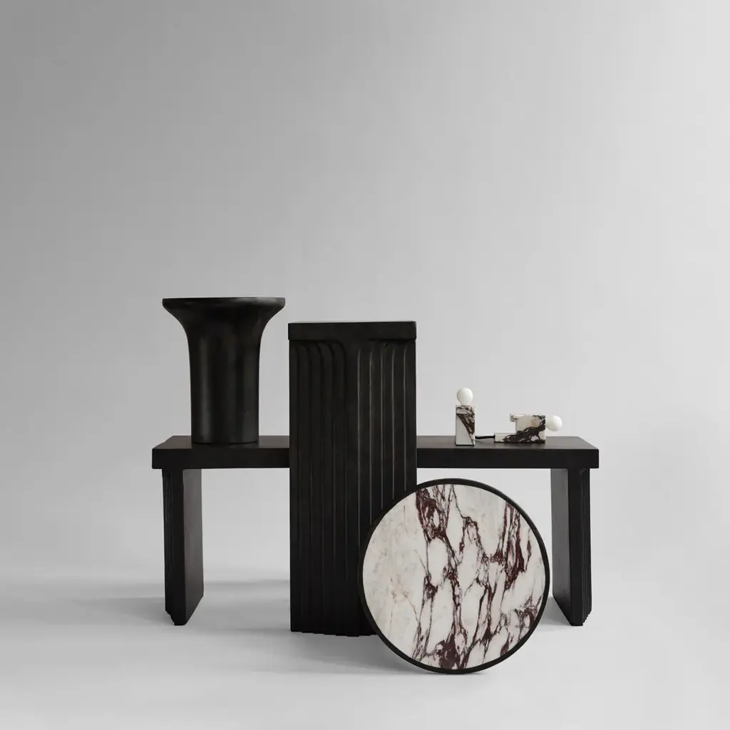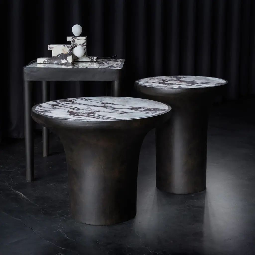 Inspired by Brutalism Architecture from the 1970's, the Trumpet Tables are designed as a trumpet shape with a soft curve and a circular tabletop. Trumpet is all about clean geometric shapes and embracing the beauty of natural materials. Made from a base of fiber concrete, the Trumpet tables features a tabletop of exquisite marble, emphasising the rich and beautiful patterns of natural stone. The polished surface softly reflects light, adding a warmth to the Trumpet tables. Designed by Kristian Sofus Hansen & Tommy Hyldahl.