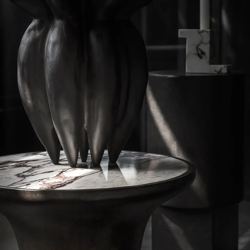 Inspired by Brutalism Architecture from the 1970's, the Trumpet Tables are designed as a trumpet shape with a soft curve and a circular tabletop. Trumpet is all about clean geometric shapes and embracing the beauty of natural materials. Made from a base of fiber concrete, the Trumpet tables features a tabletop of exquisite marble, emphasising the rich and beautiful patterns of natural stone. The polished surface softly reflects light, adding a warmth to the Trumpet tables. Designed by Kristian Sofus Hansen & Tommy Hyldahl.