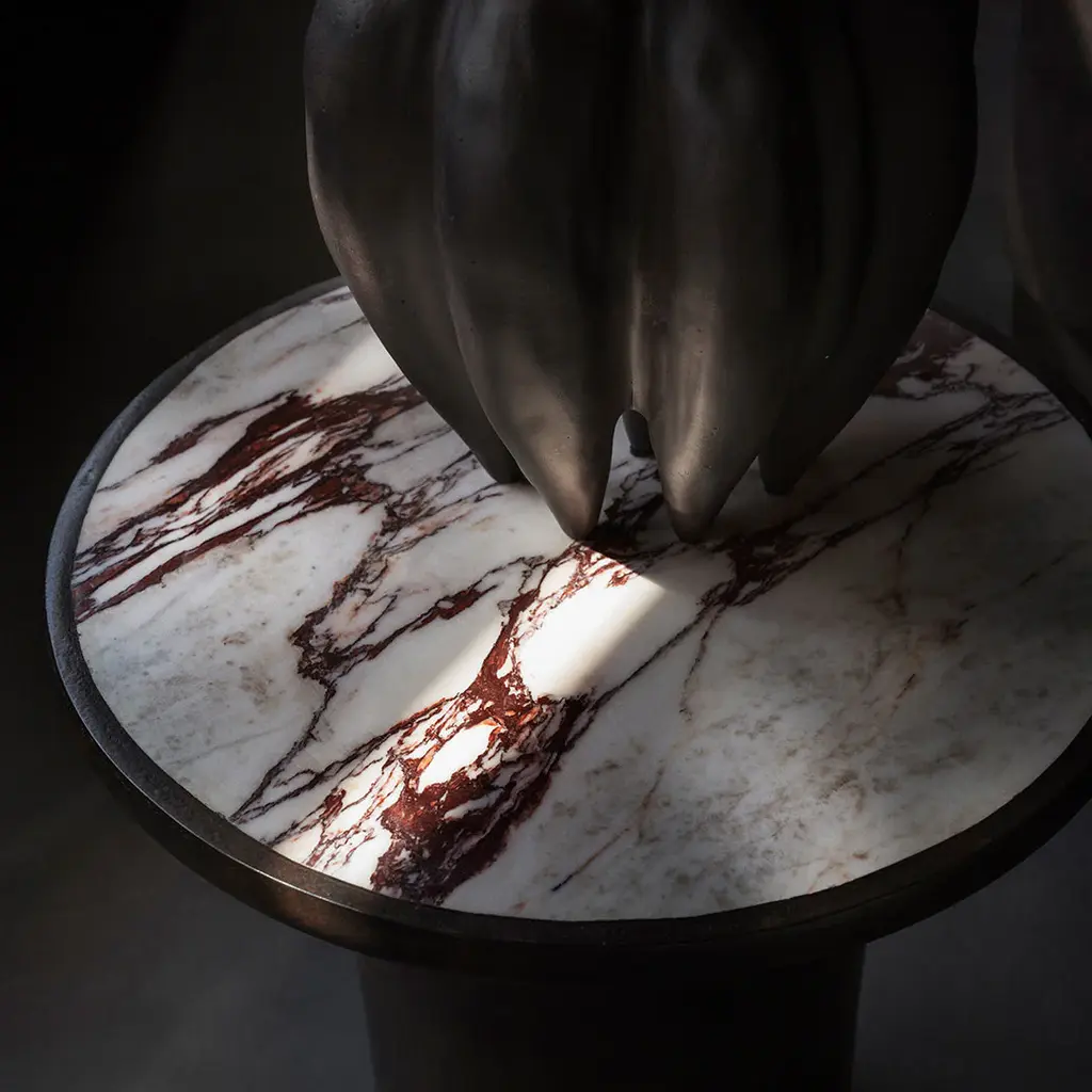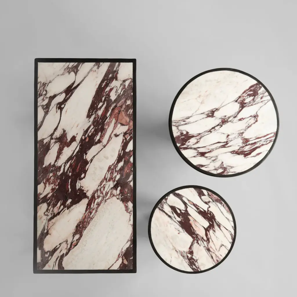 Inspired by Brutalism Architecture from the 1970's, the Trumpet Tables are designed as a trumpet shape with a soft curve and a circular tabletop. Trumpet is all about clean geometric shapes and embracing the beauty of natural materials. Made from a base of fiber concrete, the Trumpet tables features a tabletop of exquisite marble, emphasising the rich and beautiful patterns of natural stone. The polished surface softly reflects light, adding a warmth to the Trumpet tables. Designed by Kristian Sofus Hansen & Tommy Hyldahl.
