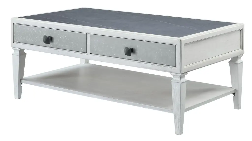 Stylish and super sturdy, the Trumpton Coffee Table is an amazingly good-looking table that will compliment your living room. A weathered white manufactured wood frame is finished off with a rustic gray sintered stone top that is the epitome of quality construction and design. Help to keep your space organized with the included single shelf. This classic rectangular table will be a great accent in any room It has a fresh design that will definitely breathe some fresh air into your interior. This coffee table is the sturdy, reliable and stylish answer to your living room needs.