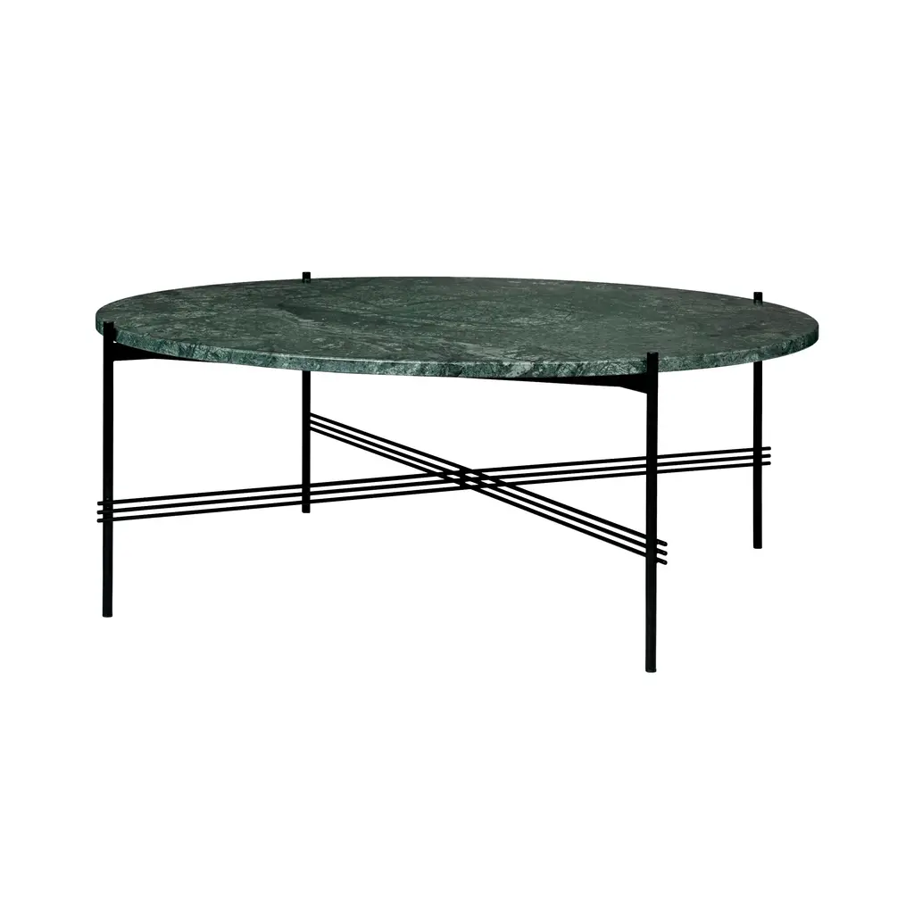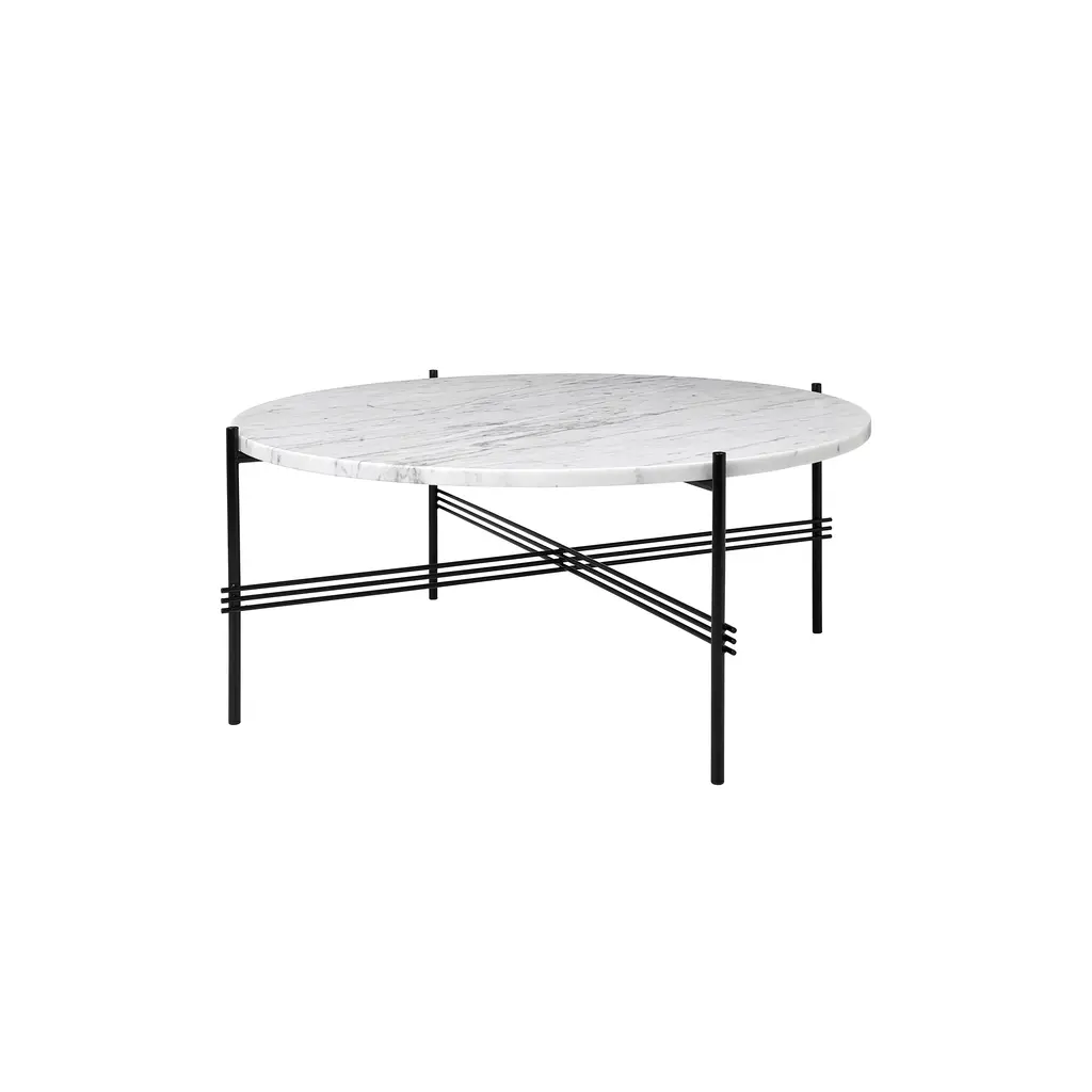 TS Round Coffee Table is a series of 3 occasional tables, each with a signature steel base of intersecting planes. Design partners GamFratesi took inspiration from a 1930s building in Copenhagen for the design framework in either black or brass finish and topped with a lavish marble round in a range of hues. A large TS might be placed in front of a sofa while a smaller version is perfect next to a chair—or mix different sizes in a customized cluster.