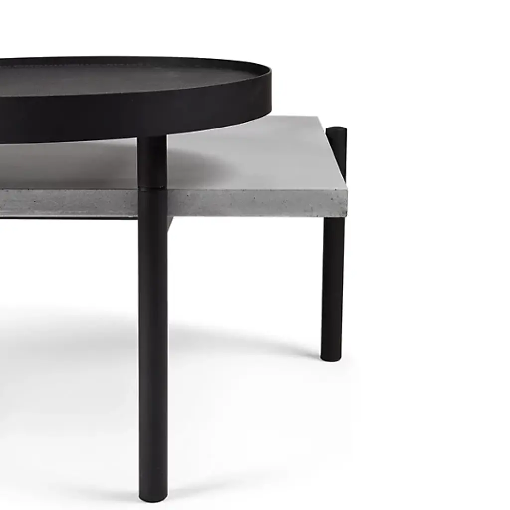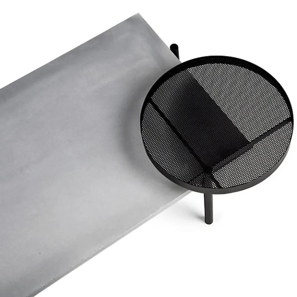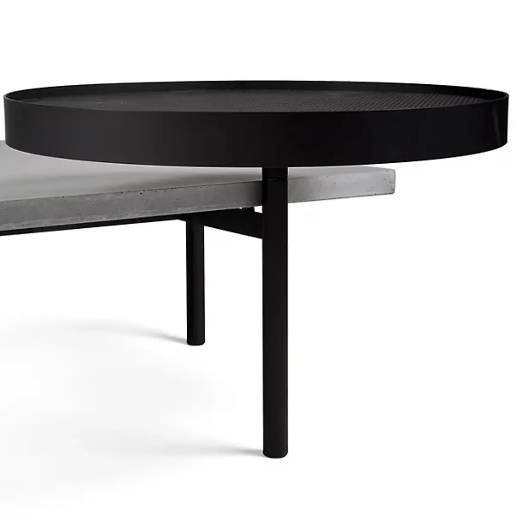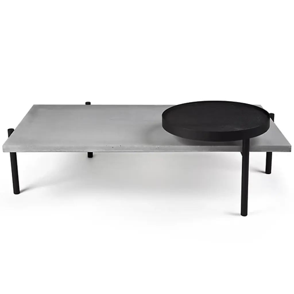 Unconventional and contemporary. The Twist Coffee Table is an innovative design from Alexandre Dubreuil for the French luxury brand Lyon Beton. Composed of a high-performance concrete platform and a satin powder-coated steel frame with a black lacquered metal base. The perforated metal plate has a 360-degree rotation capability, and the concrete top has been finished in a colorless, water and oil-repellant varnish. Excellent for entertaining spaces. Place tapas on the rotating plate and other décor to elevate a space with enlightened design.