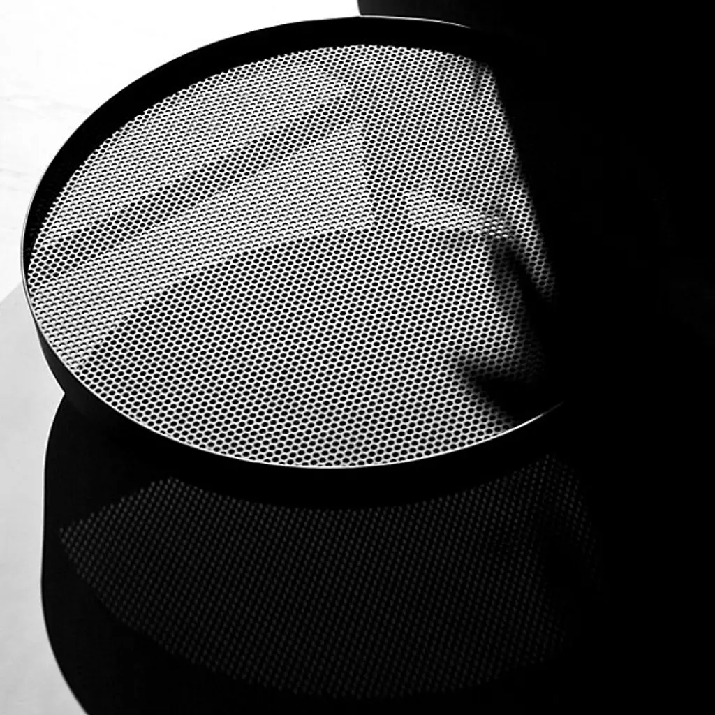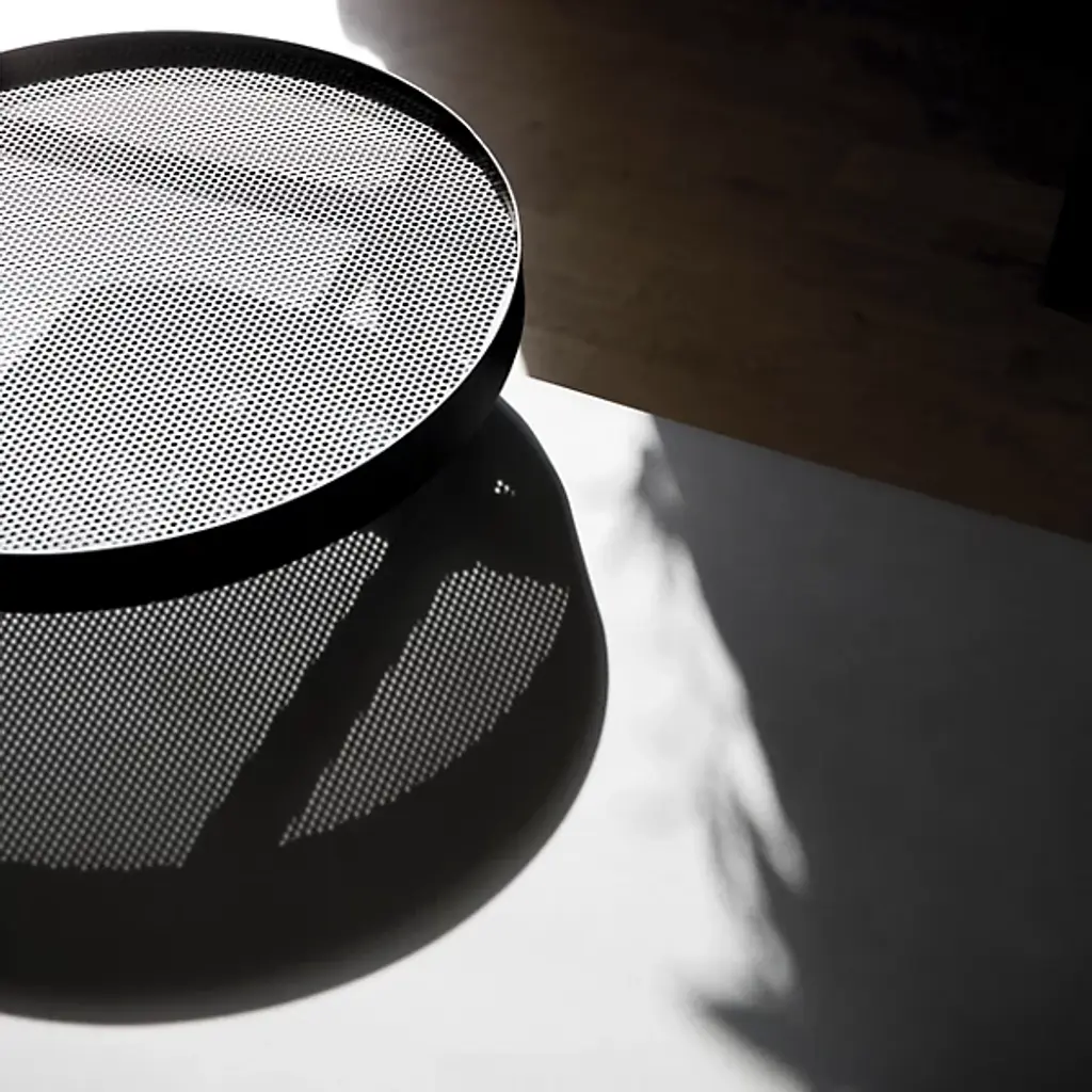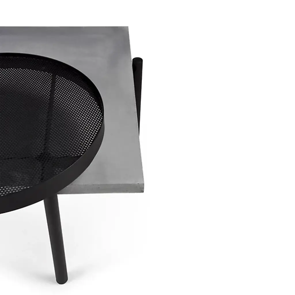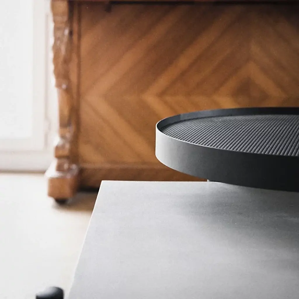 Unconventional and contemporary. The Twist Coffee Table is an innovative design from Alexandre Dubreuil for the French luxury brand Lyon Beton. Composed of a high-performance concrete platform and a satin powder-coated steel frame with a black lacquered metal base. The perforated metal plate has a 360-degree rotation capability, and the concrete top has been finished in a colorless, water and oil-repellant varnish. Excellent for entertaining spaces. Place tapas on the rotating plate and other décor to elevate a space with enlightened design.